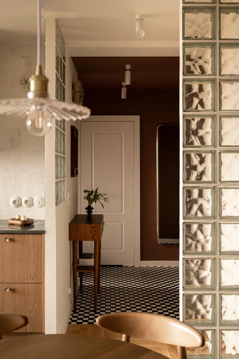 Już po kilku pierwszych spotkaniach z inwestorami udało się potwierdzić nowy układ funkcjonalny. Największa rewolucja objęła kuchnię, którą przeniesiono z wąskiego, podłużnego pomieszczenia do części dziennej – i to właśnie ona stała się sercem mieszkania. Otulona z dwóch stron zabudową z ciepłego drewna, tworzy przyjazną, harmonijną przestrzeń. Strefę wejścia od salonu oddzielono dekoracyjnymi luksferami.