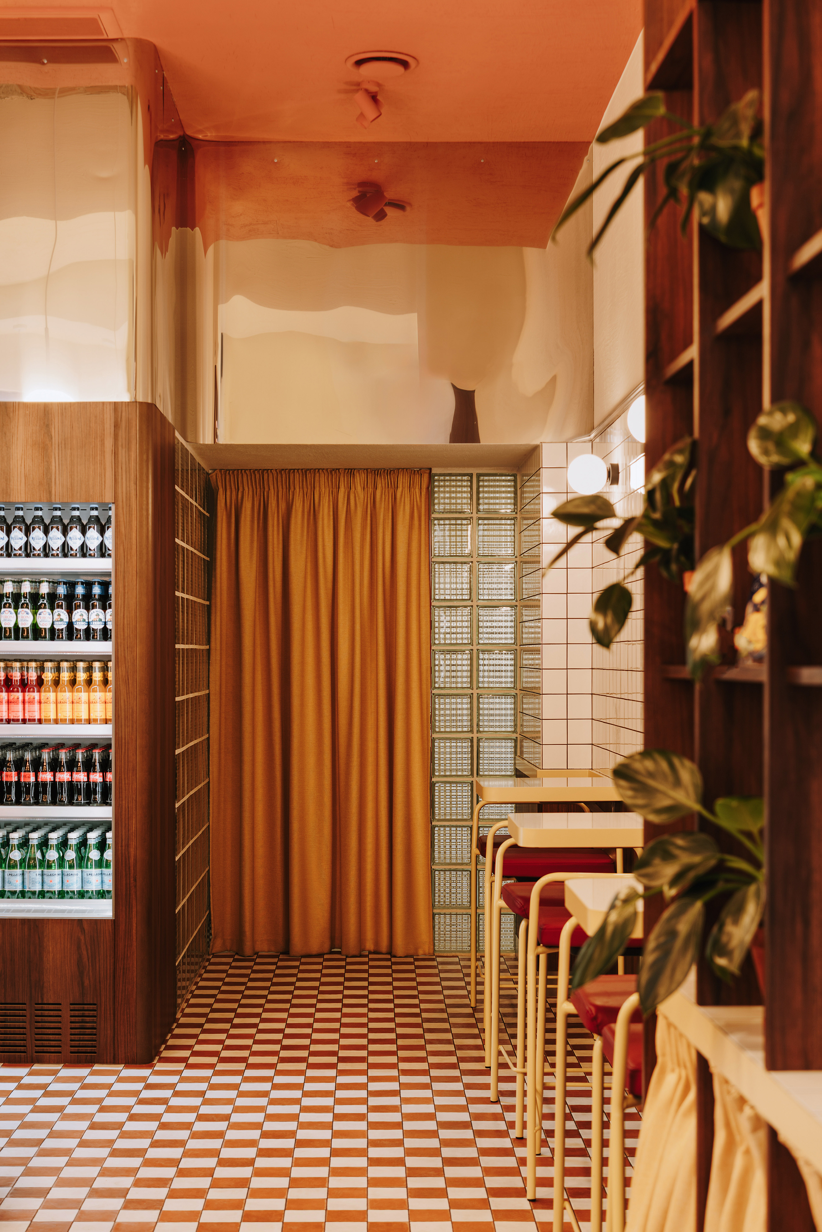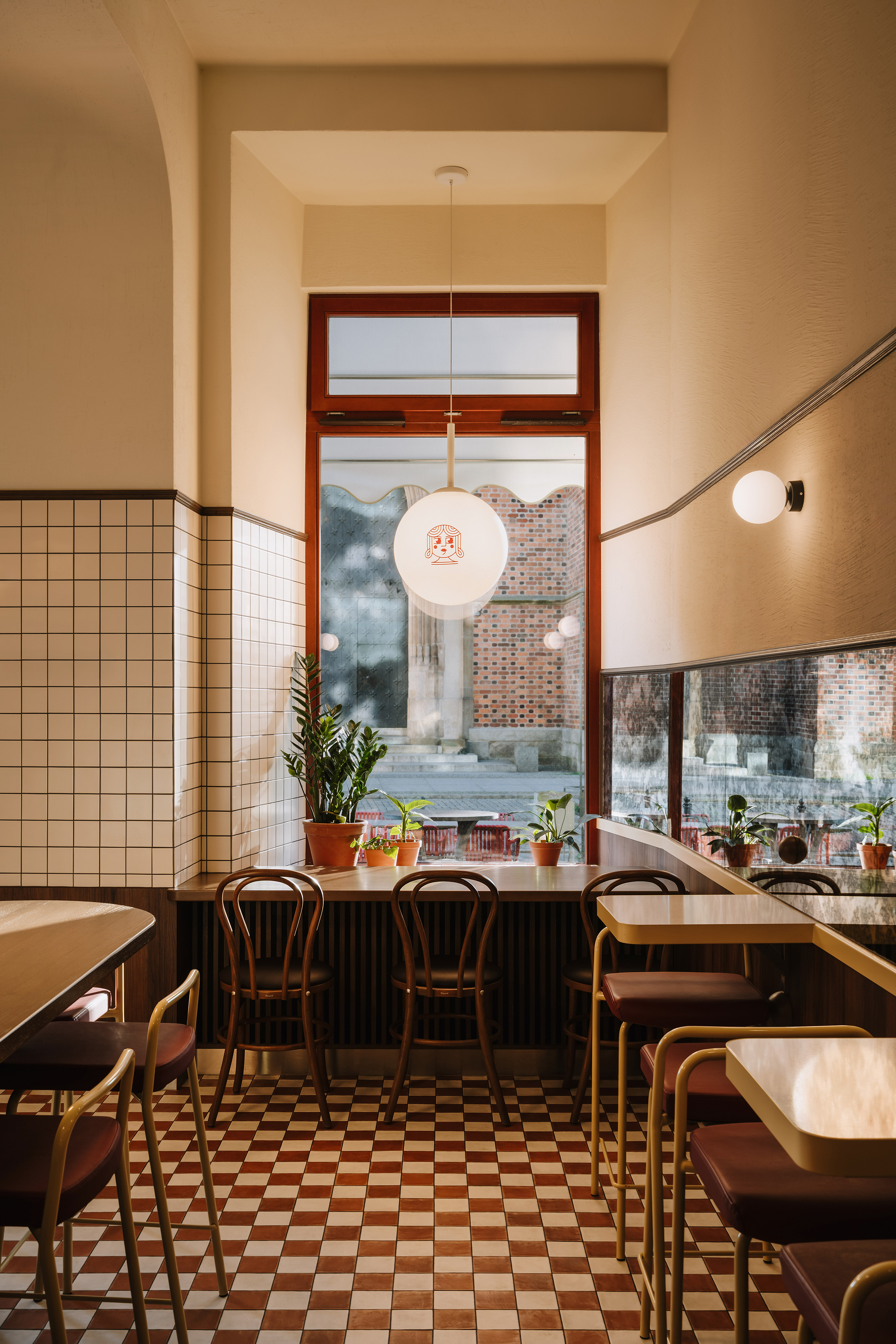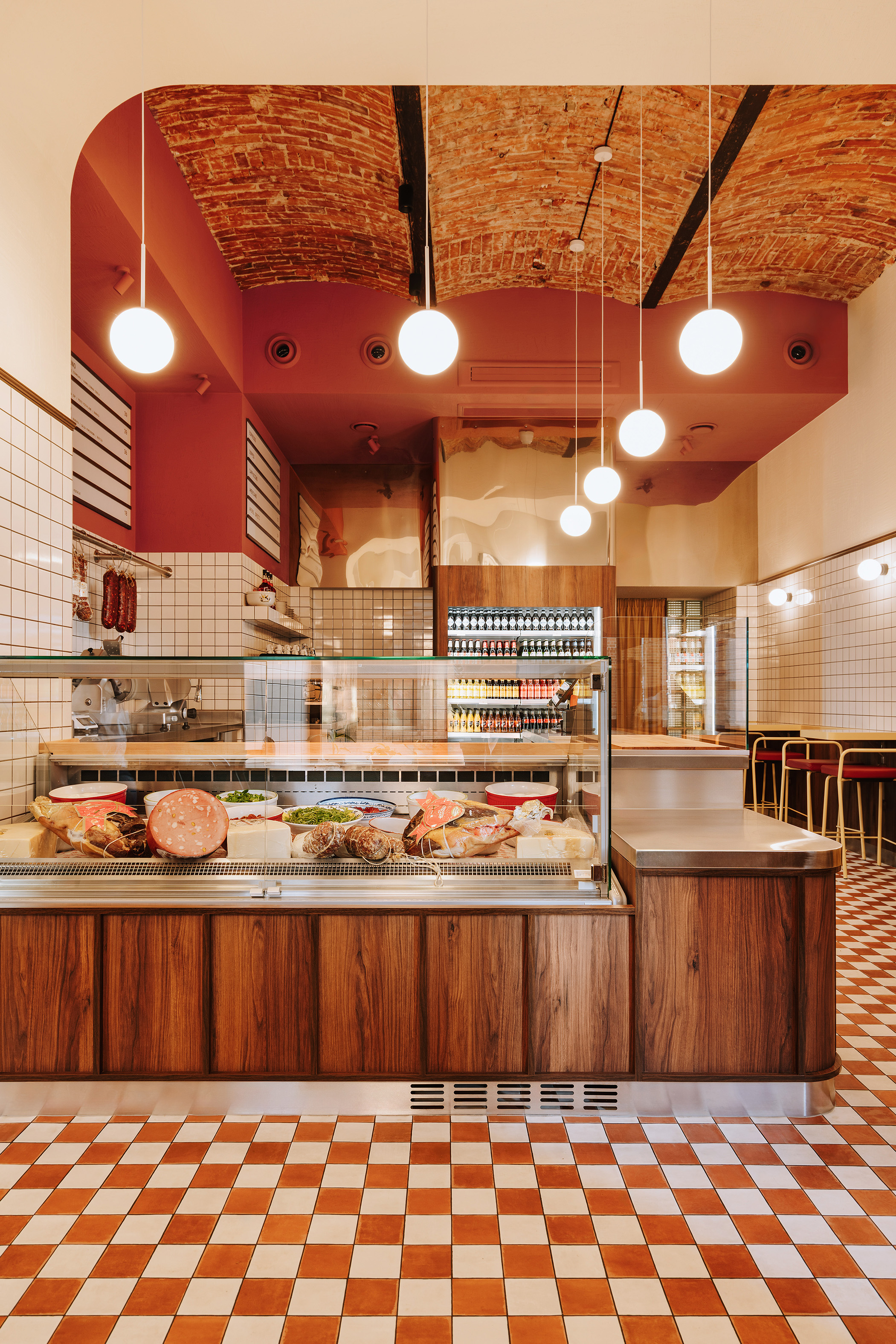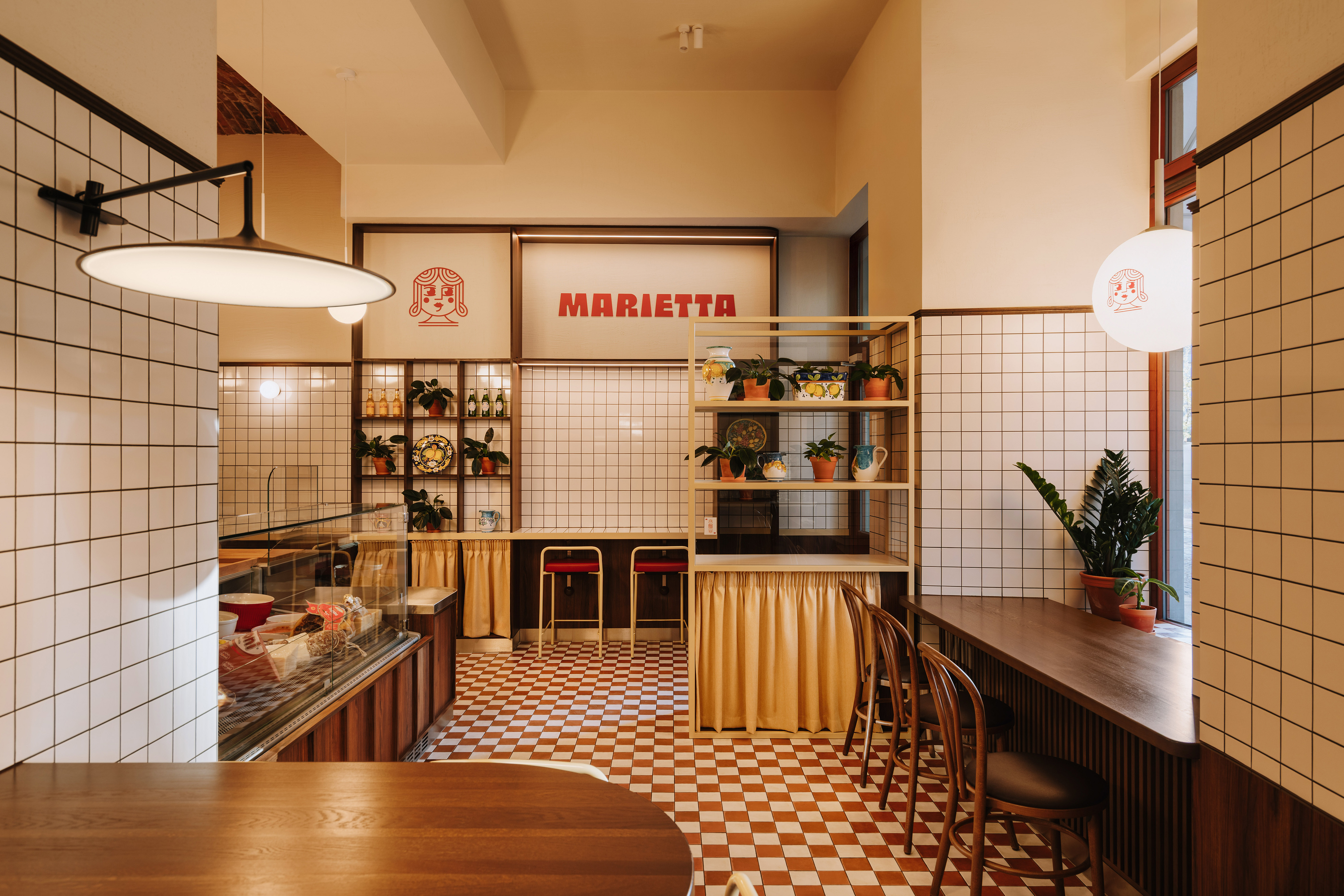 Estetyka Marietty to ukłon w stronę klasycznych włoskich salumerii. Na podłodze króluje biało-czerwona szachownica, która nadaje rytm całej przestrzeni. Ciemne drewno i piaskowe żółcie ocieplają wnętrze, a elementy ze stali nierdzewnej wprowadzają techniczny, surowy sznyt, kojarzący się z profesjonalną kuchnią.