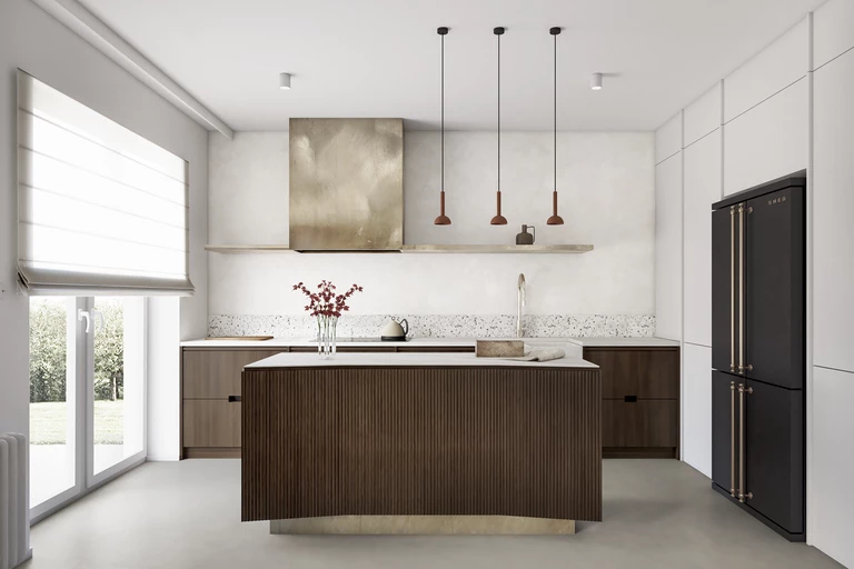 Część kuchenna jest spokojna  i surowa. Połączono w niej ciepło orzechowego drewna, surowego betonu i klasycznego złota, z dopracowanym detalem, niewidocznych na pierwszy rzut oka elementów. Tutaj ozdobą jest także sprzęt kuchenny, wyselekcjonowany tak, aby zwracał na siebie uwagę i był integralną częścią zabudowy.