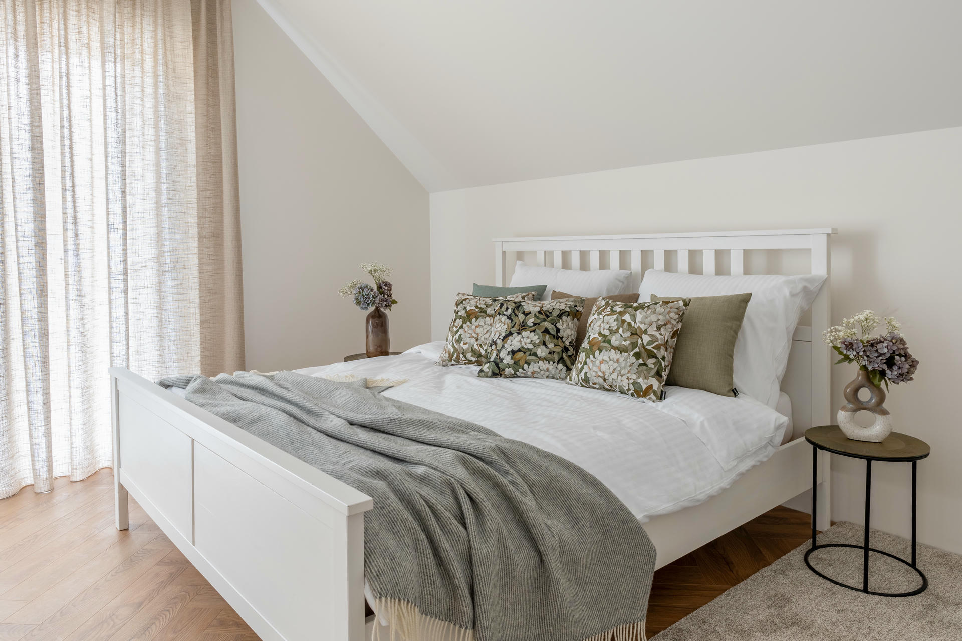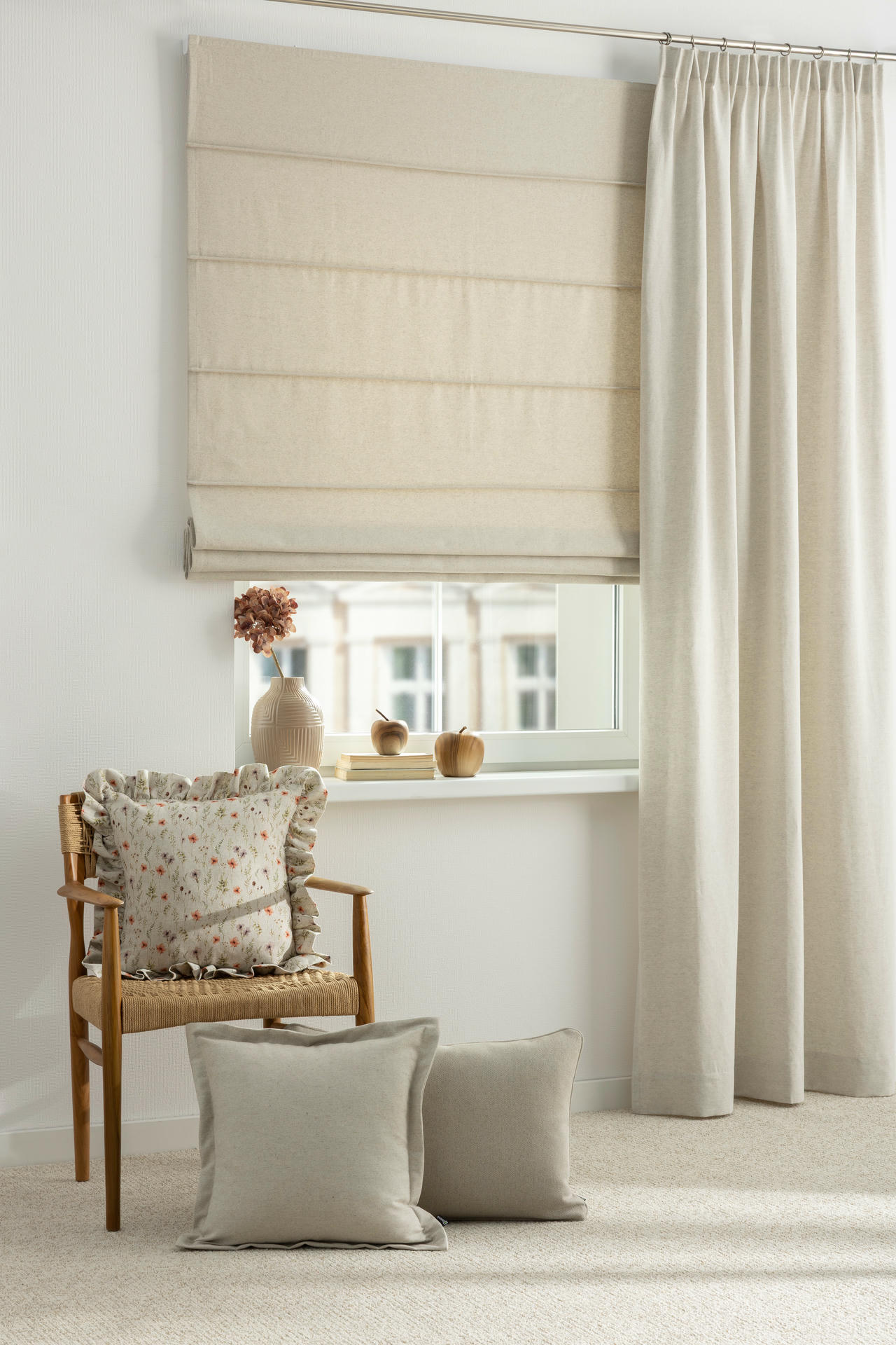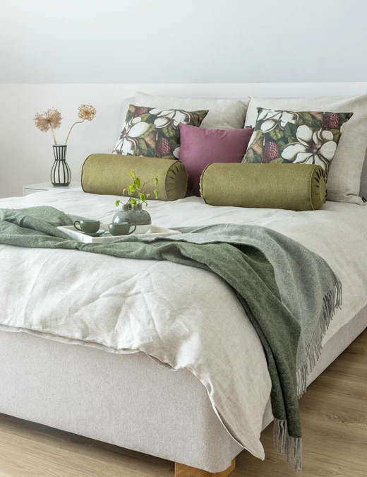 Zasłony i rolety rzymskie z lnu, bawełny lub wiskozy miękko filtrują światło, tworząc atmosferę sprzyjającą odpoczynkowi. Naturalne tkaniny lniane i konopne pojawiają się także w dodatkach – szczególnie w poszewkach dekoracyjnych, które wprowadzają subtelną strukturę i naturalną lekkość, odświeżając aranżację bez wrażenia przesytu.