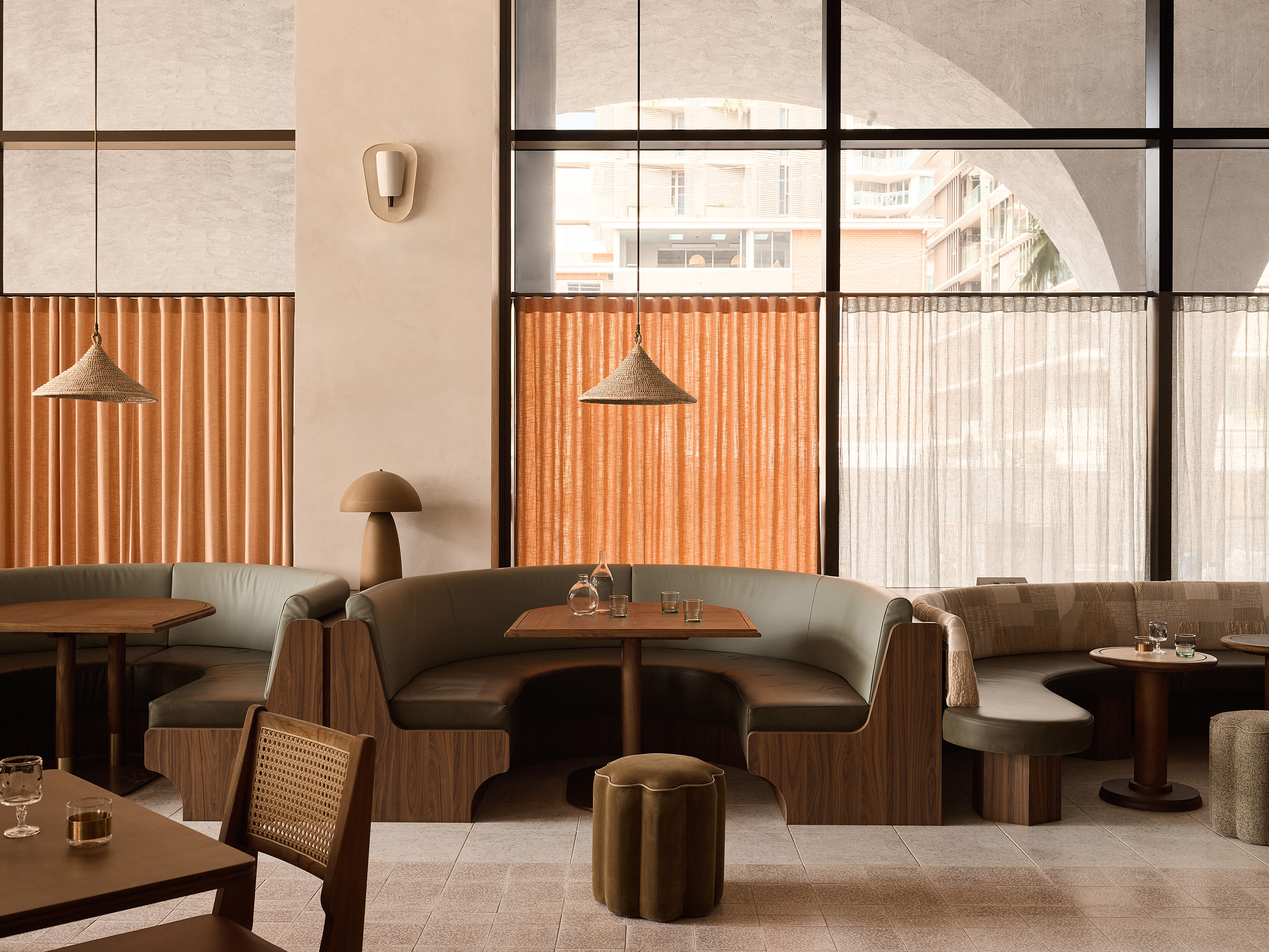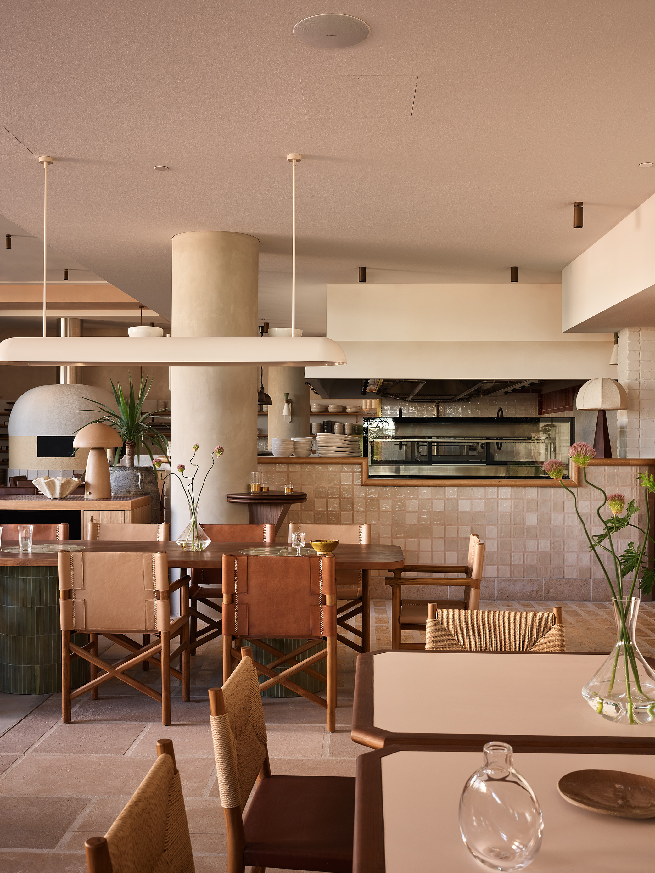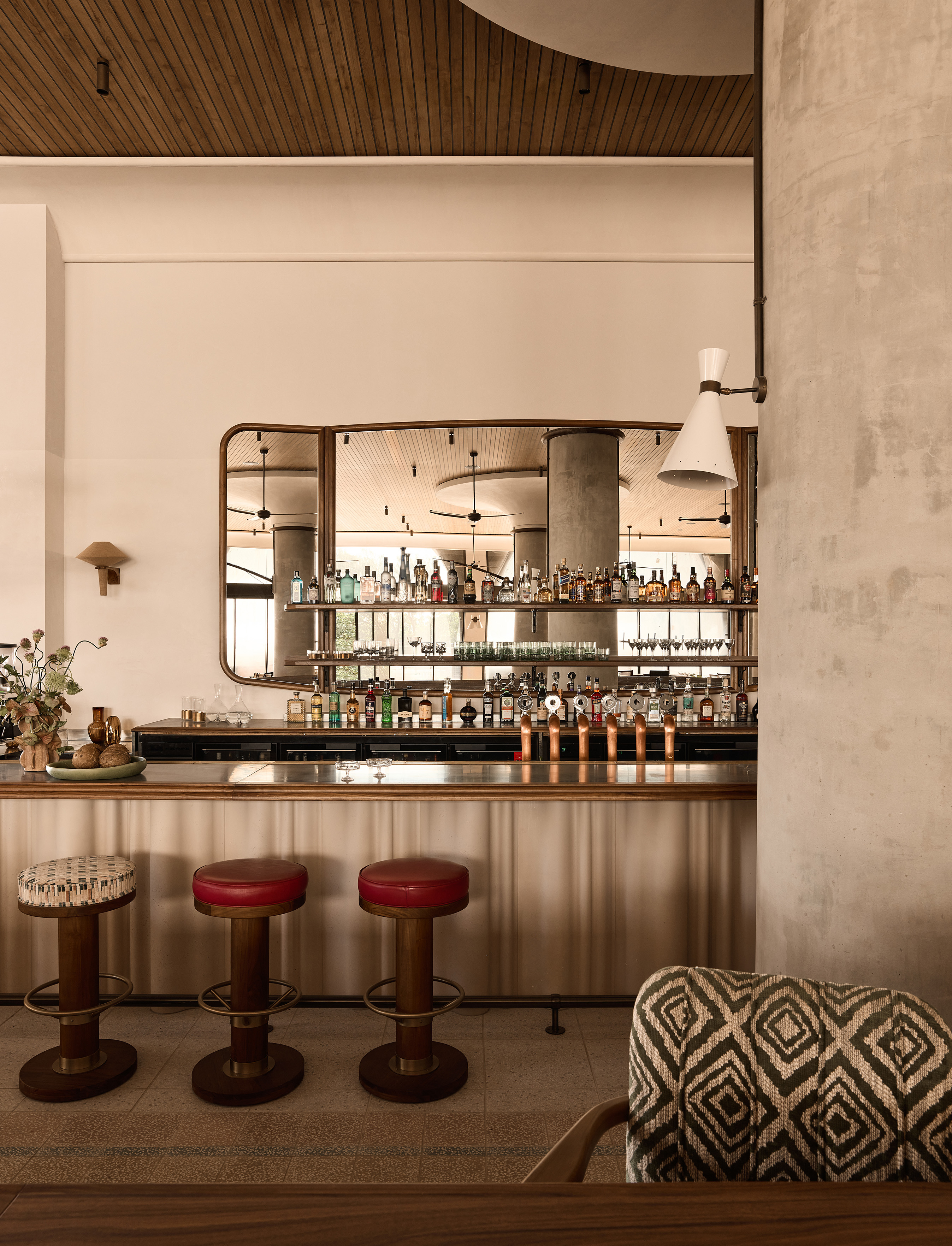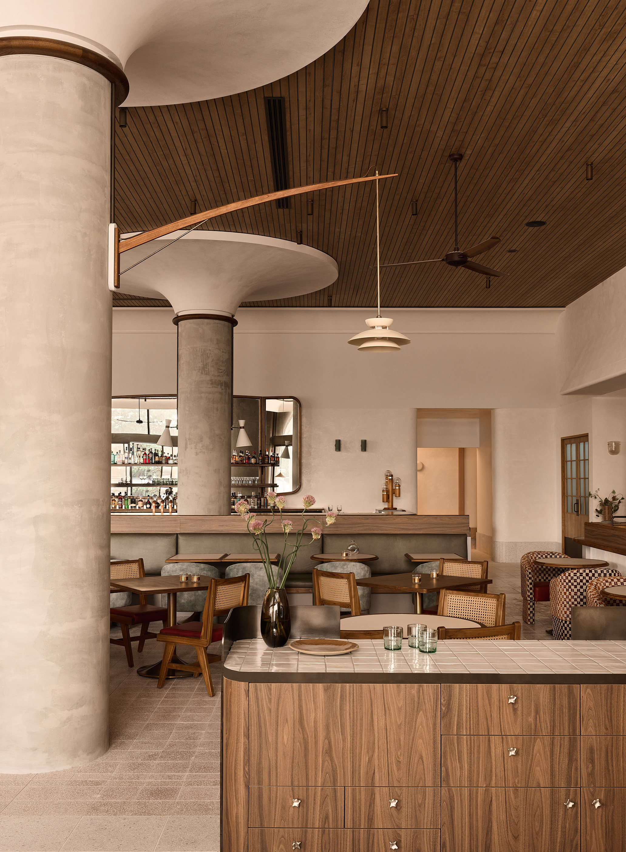 Dominantą jest duży bar z lanego betonu oraz otwartą kuchnią z piecem do pizzy. Podłogę zdobią kamienne wzory inspirowane Utzonem, a także duże, betonowe płaszczyzny i „zębate” płytki w stylu Scarpy. Oświetlenie, zaprojektowane we współpracy z Shaunem Dudleyem z Transmitt, to modernistyczne formy z mosiądzu w odcieniach kremu i zieleni, które animują surową bazę z kamienia i betonu.
