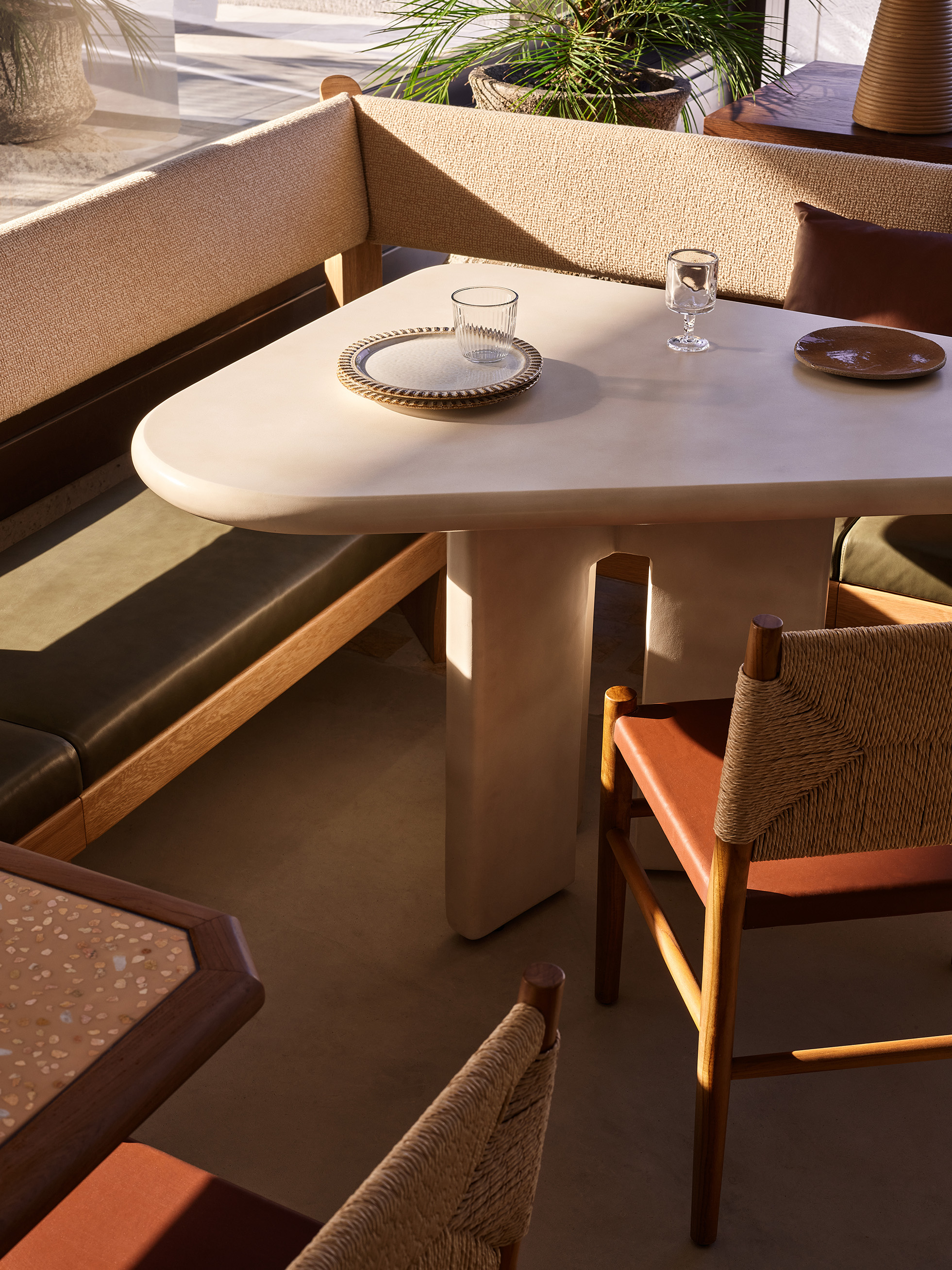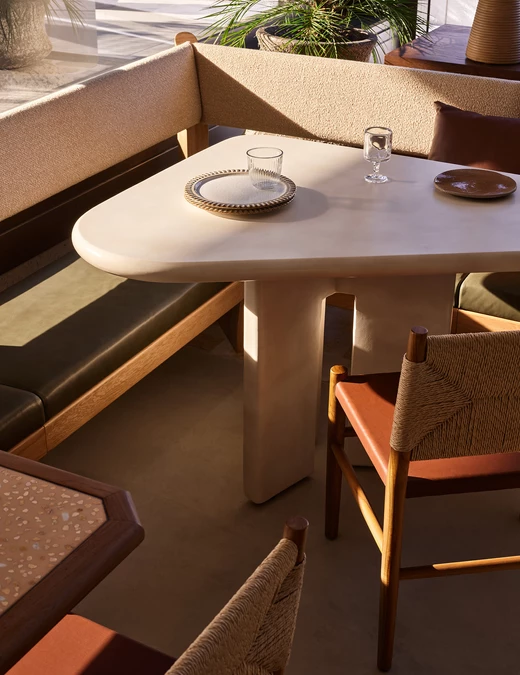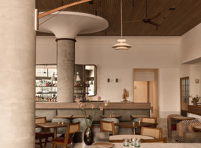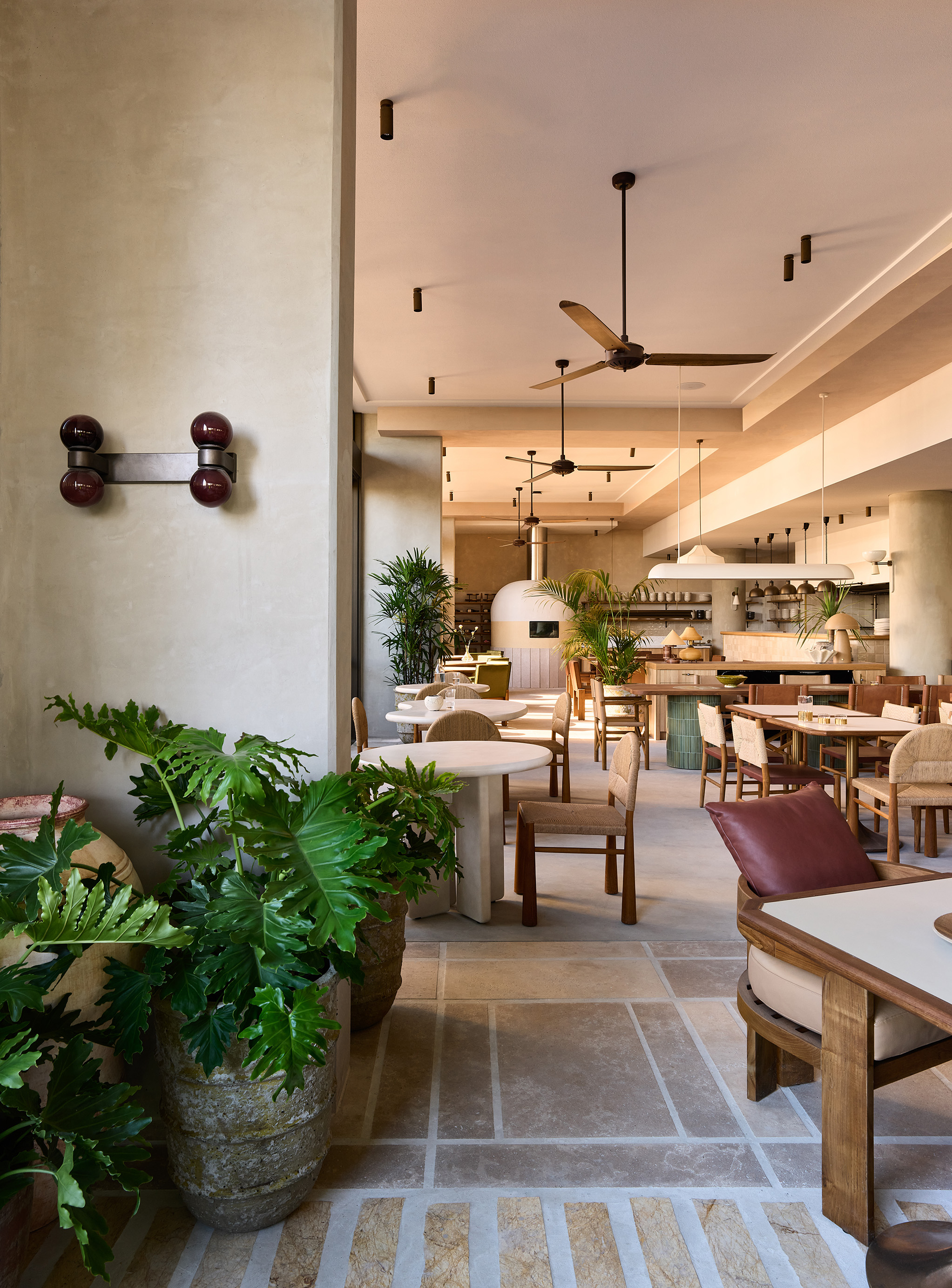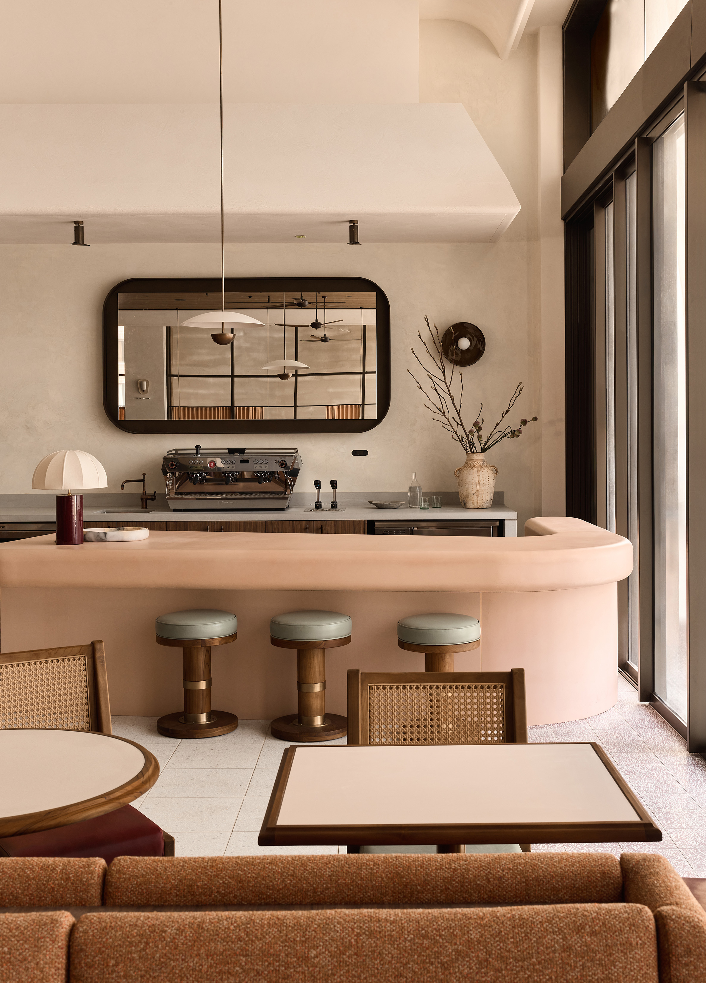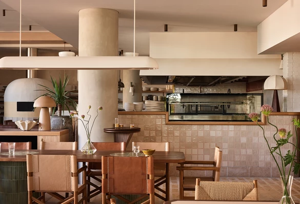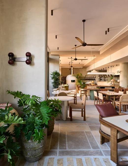 Dominantą jest duży bar z lanego betonu oraz otwartą kuchnią z piecem do pizzy. Podłogę zdobią kamienne wzory inspirowane Utzonem, a także duże, betonowe płaszczyzny i „zębate” płytki w stylu Scarpy. Oświetlenie, zaprojektowane we współpracy z Shaunem Dudleyem z Transmitt, to modernistyczne formy z mosiądzu w odcieniach kremu i zieleni, które animują surową bazę z kamienia i betonu.