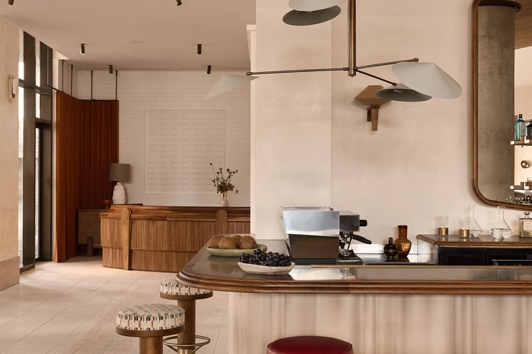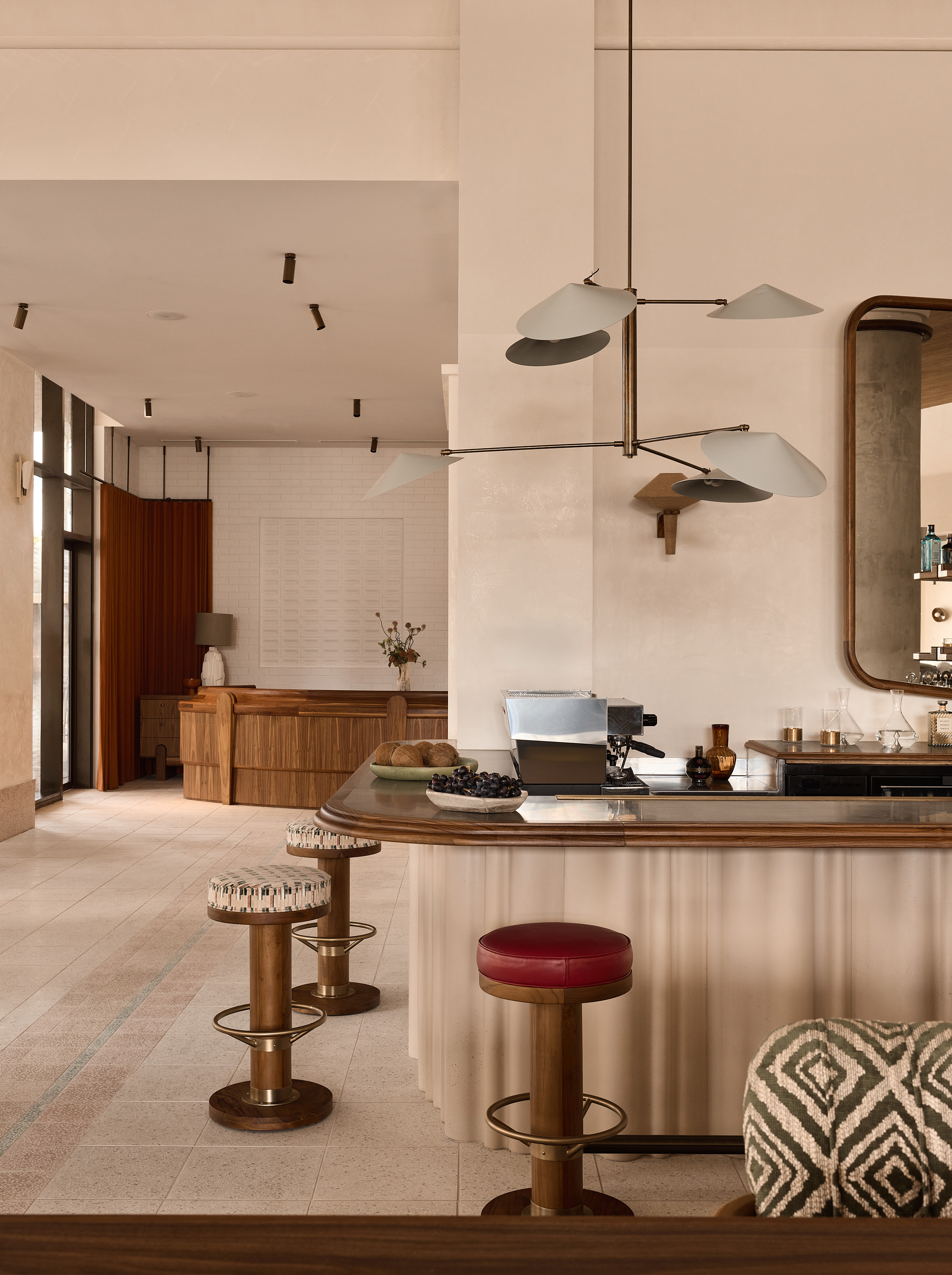Efektem jest wyrafinowana gra kontrastów – między lokalną energią a międzynarodowym charakterem marki Mondrian. Paleta materiałowa opiera się na tynkach weneckich, ręcznie robionych płytkach, giętym betonie i postarzanym lastryko. Uzupełniają je meble z drewna, mosiądzu i skóry w odcieniach burgundu, szałwiowej zieleni, rdzy i brązu.