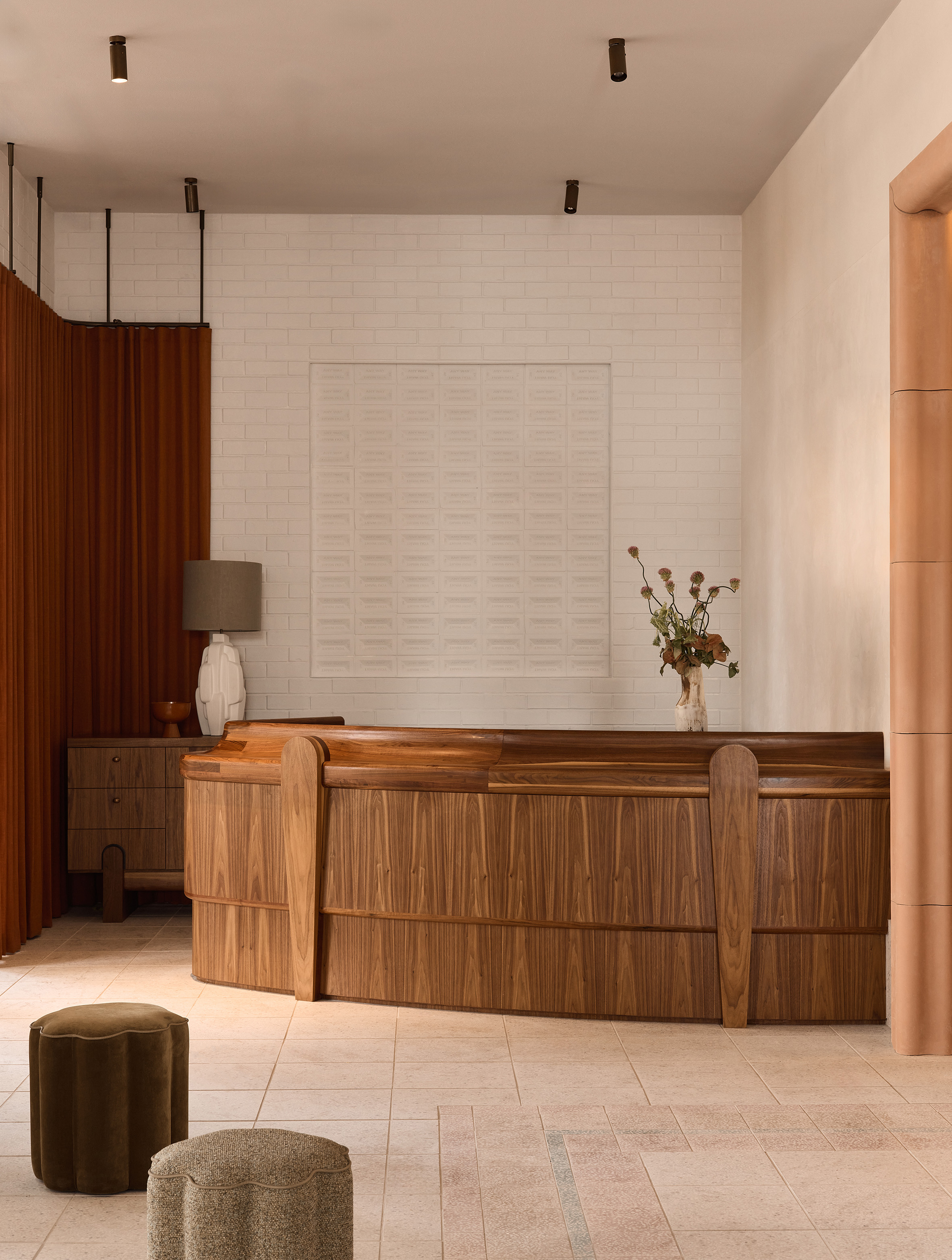 Uwagę przyciąga również recepcja hotelowa – ręcznie wykonana z orzecha przez Hugh McCarthy’ego, za którą znajduje się ściana z niestandardowych cegieł z wytłoczonym napisem „any way you want”. Cegły te, stworzone we współpracy z Natural Brick Company, zawierają biały gruz marmurowy i pył odzyskany z pracowni rzeźbiarza Alexa Setona.