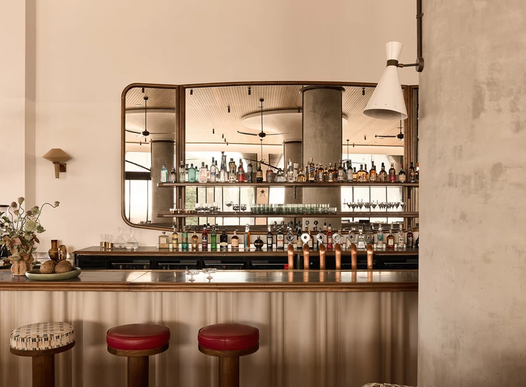 Centralnym punktem jest długi na 10 metrów bar, którego front zdobi „betonowa kurtyna” – seria precyzyjnie odlanych, zakrzywionych paneli, ułożonych tak, by unikać powtarzalności wzoru. Kontrapunktem dla surowości betonu jest blat z litego orzecha z intarsją z cynku.