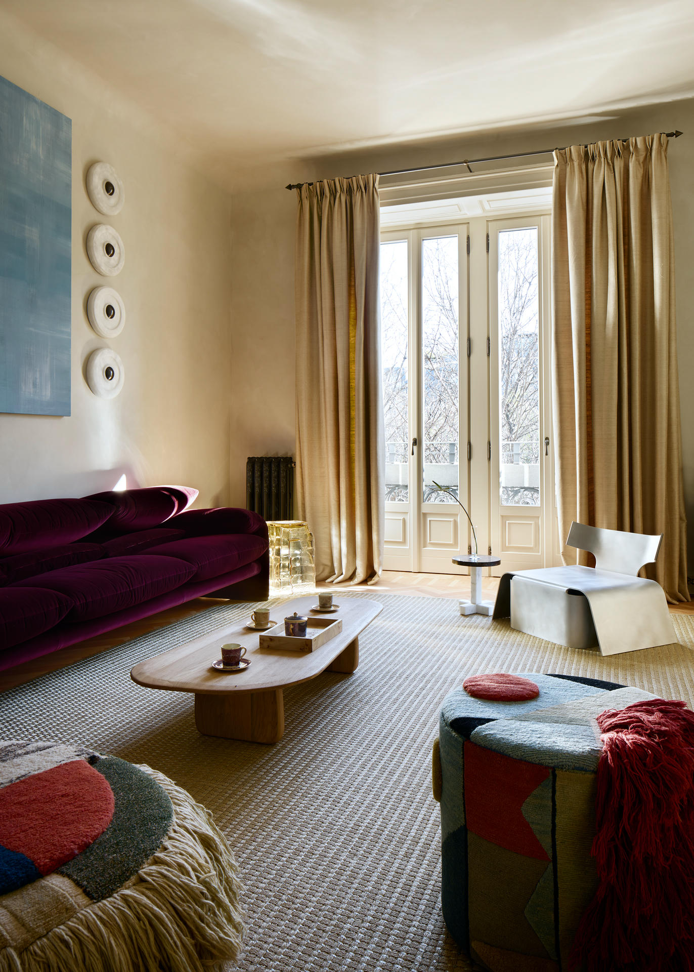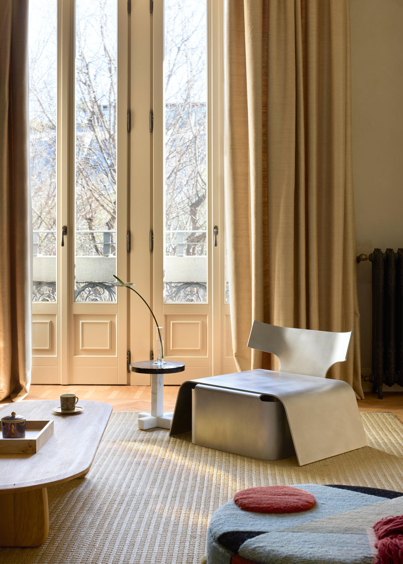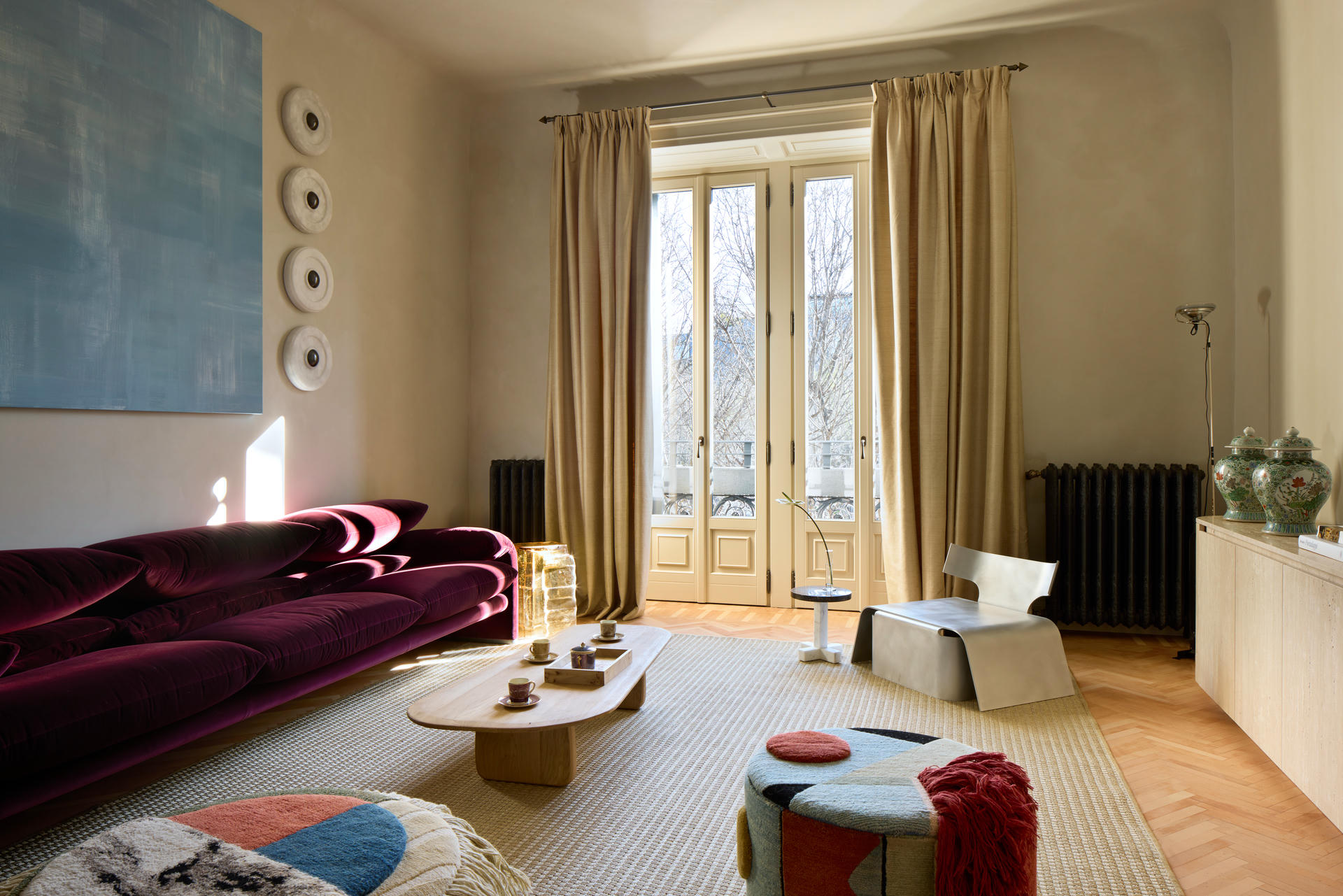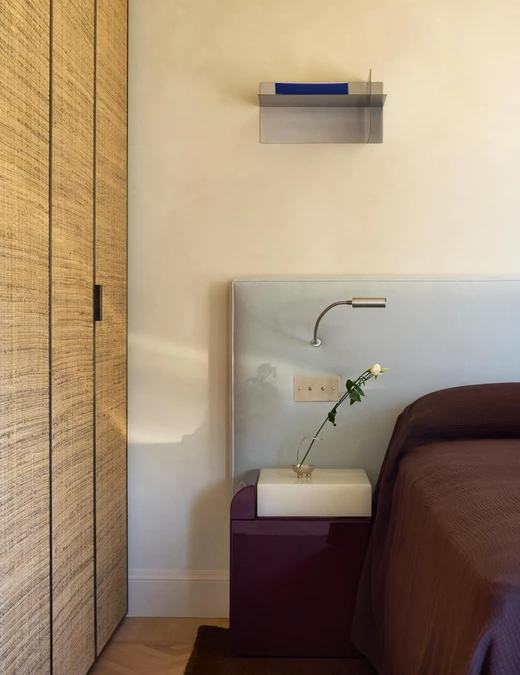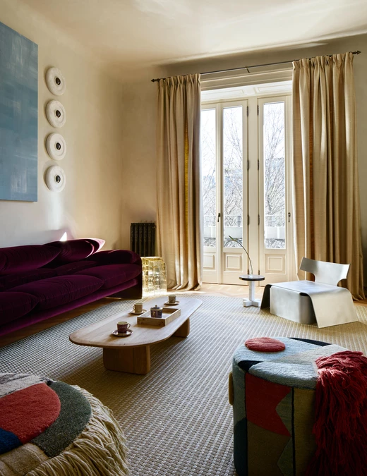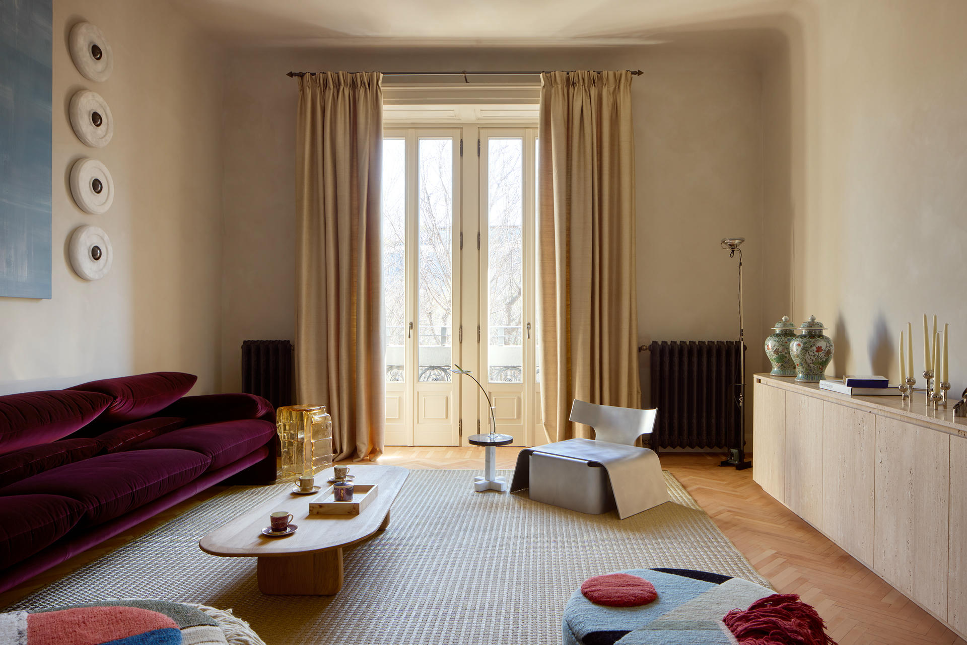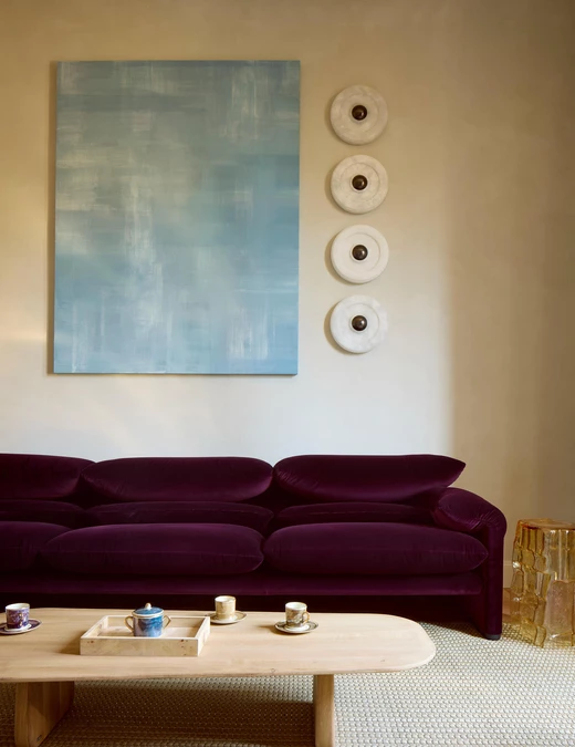 W salonie spotykają się sztuka, rzemiosło oraz ikony designu. Dywan Tapistelar, wykonany z agawy i metalicznych nici, wprowadza warstwowość faktur oraz subtelny, nienachalny połysk. Natomiast sofa Maralunga – projektu Vico Magistrettiego dla Cassiny – stała się w tej przestrzeni ponadczasowym punktem odniesienia. Uzupełnieniem jest zaprojektowana na zamówienie komoda z trawertynu oraz alabastrowe kinkiety Circle (autorski projekt LC Atelier dla marki Matlight).