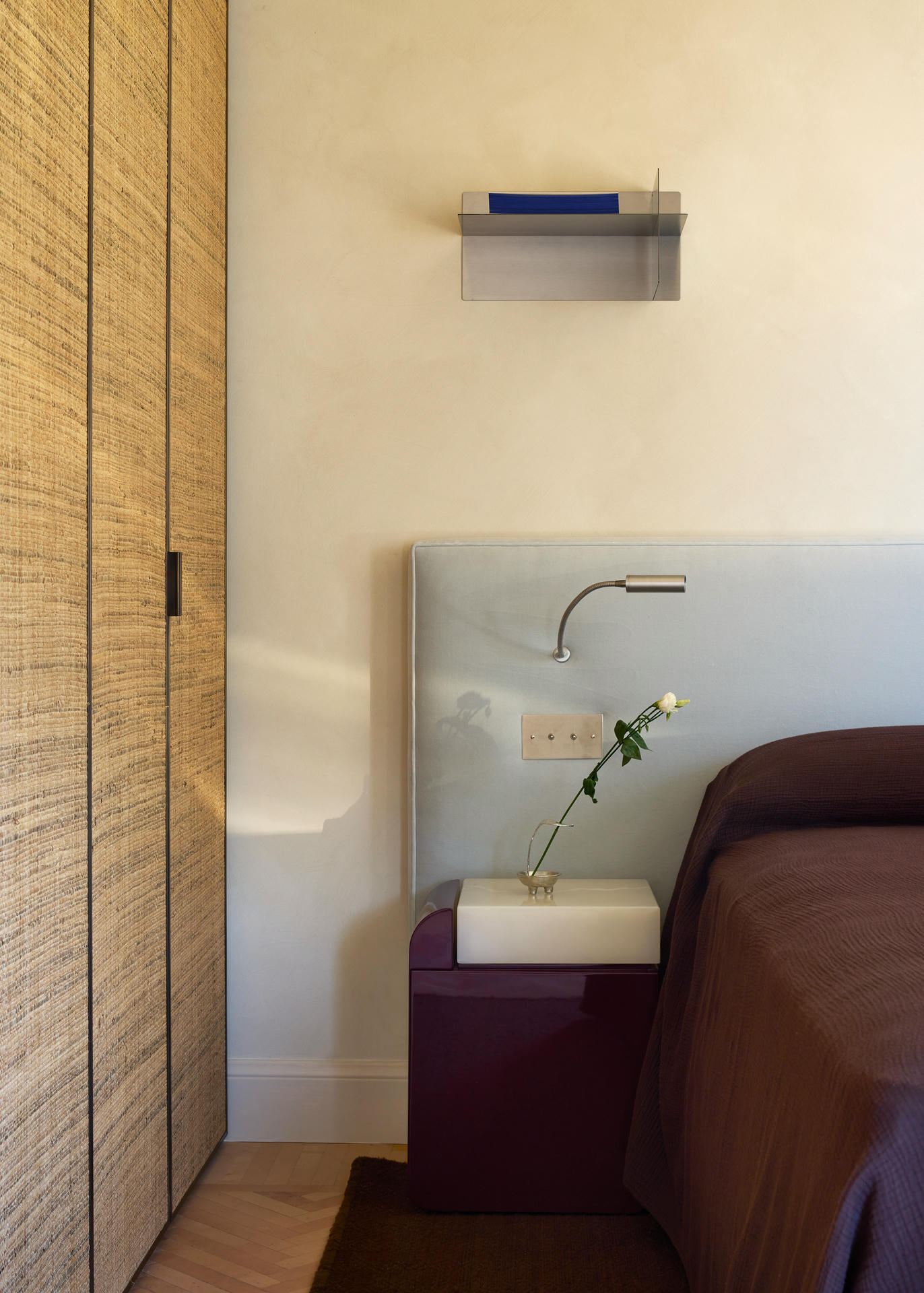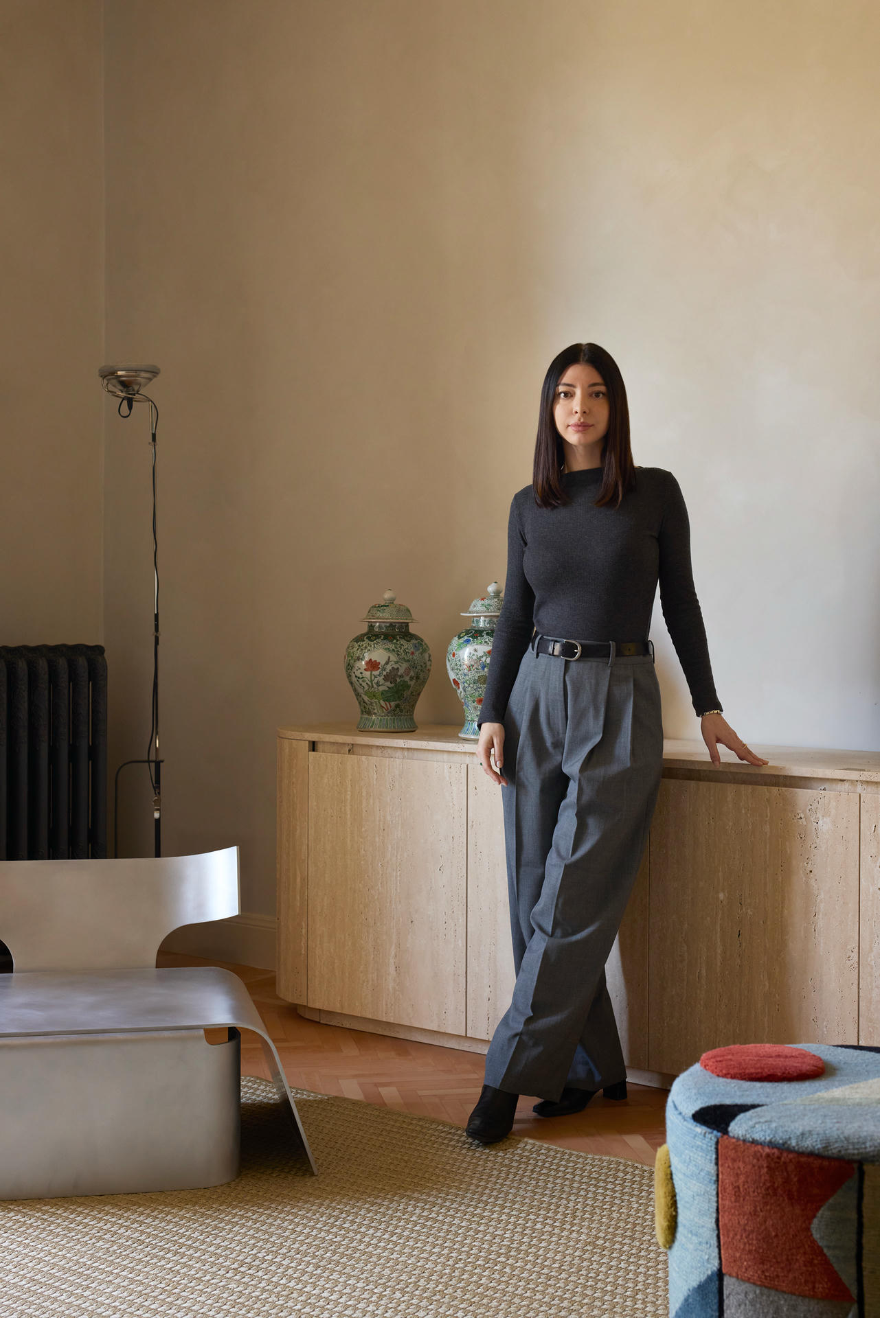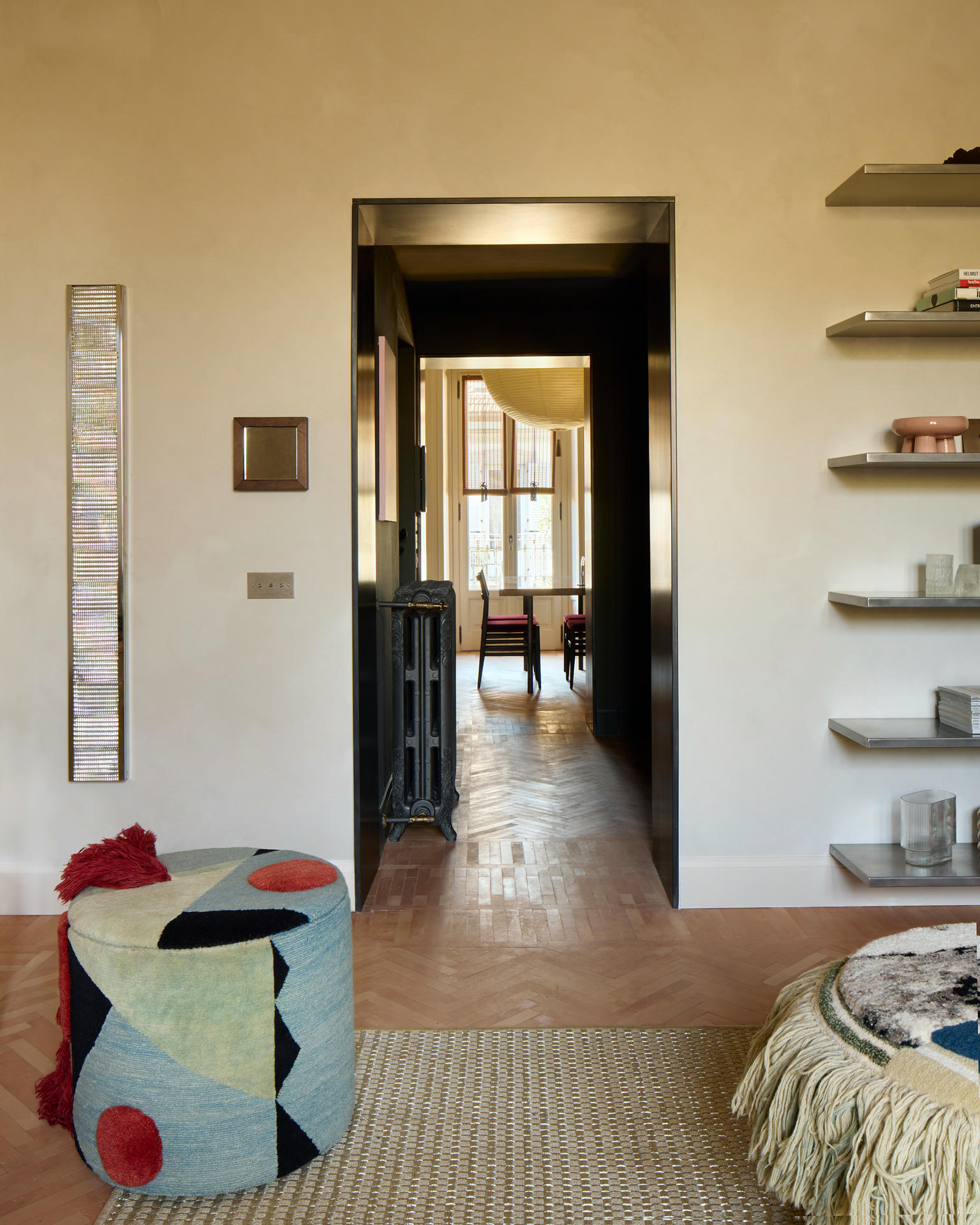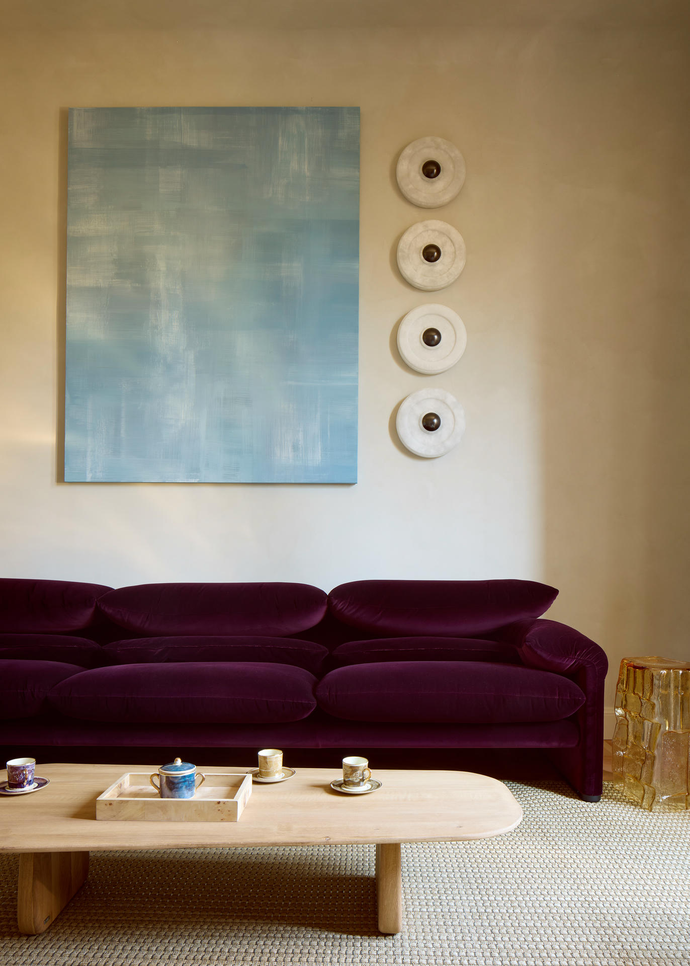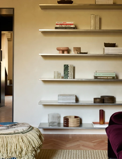 W salonie spotykają się sztuka, rzemiosło oraz ikony designu. Dywan Tapistelar, wykonany z agawy i metalicznych nici, wprowadza warstwowość faktur oraz subtelny, nienachalny połysk. Natomiast sofa Maralunga – projektu Vico Magistrettiego dla Cassiny – stała się w tej przestrzeni ponadczasowym punktem odniesienia. Uzupełnieniem jest zaprojektowana na zamówienie komoda z trawertynu oraz alabastrowe kinkiety Circle (autorski projekt LC Atelier dla marki Matlight).