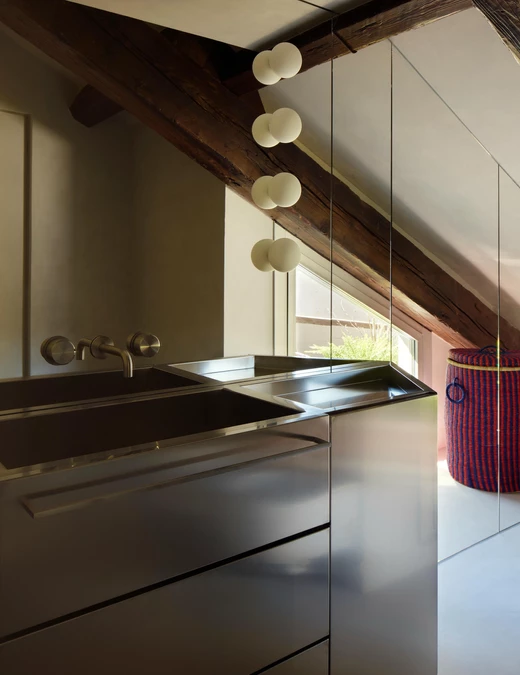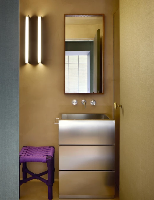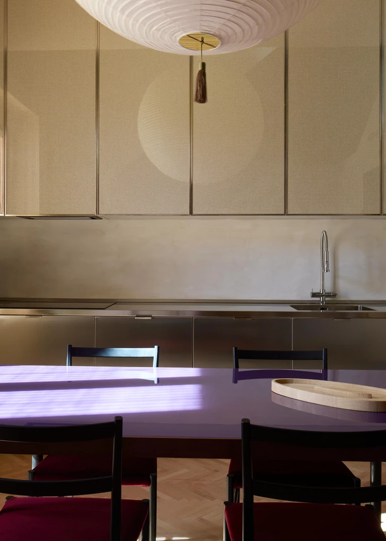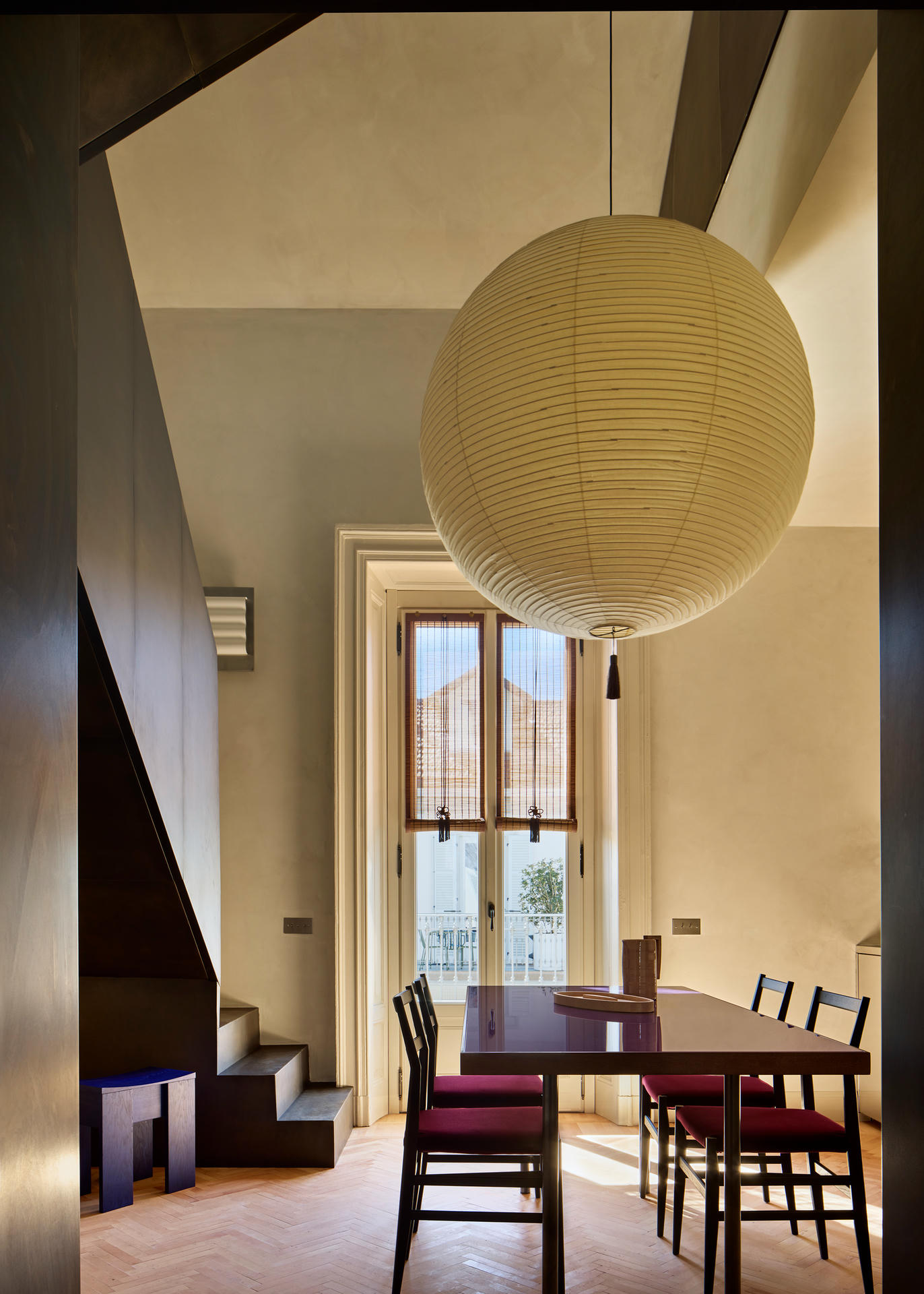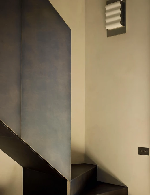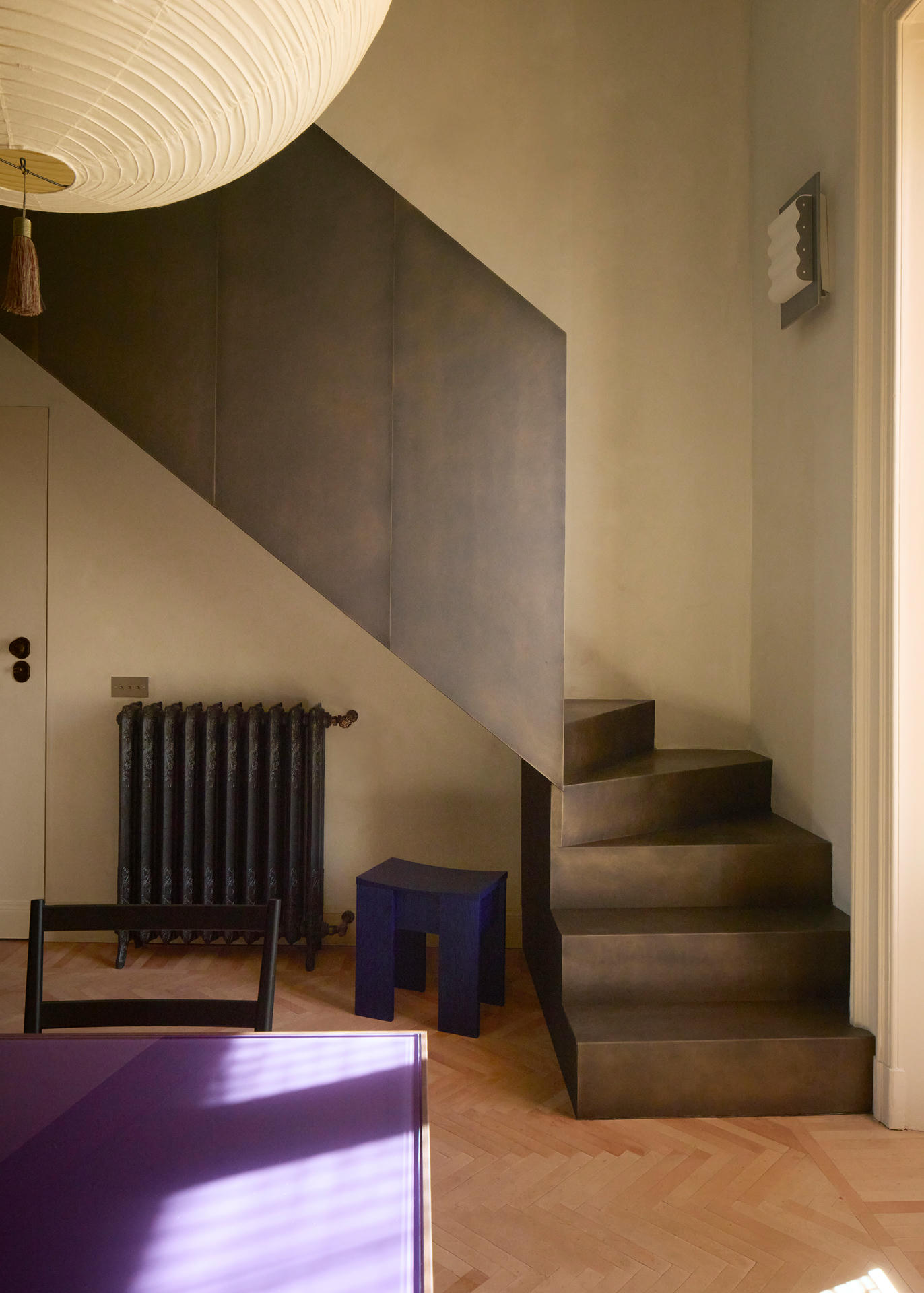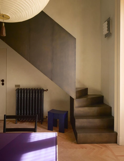 Masywna, mosiężna klatka schodowa prowadzi do strefy nocnej, a jej rzeźbiarską formę dopełnia lampa Akari autorstwa Isamu Noguchiego, której miękkie światło wizualnie spaja obie kondygnacje.