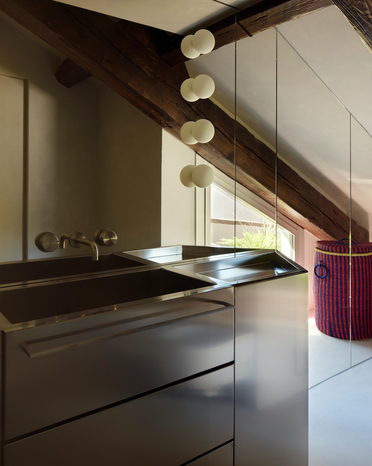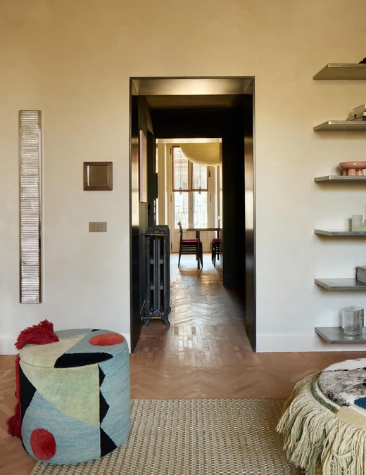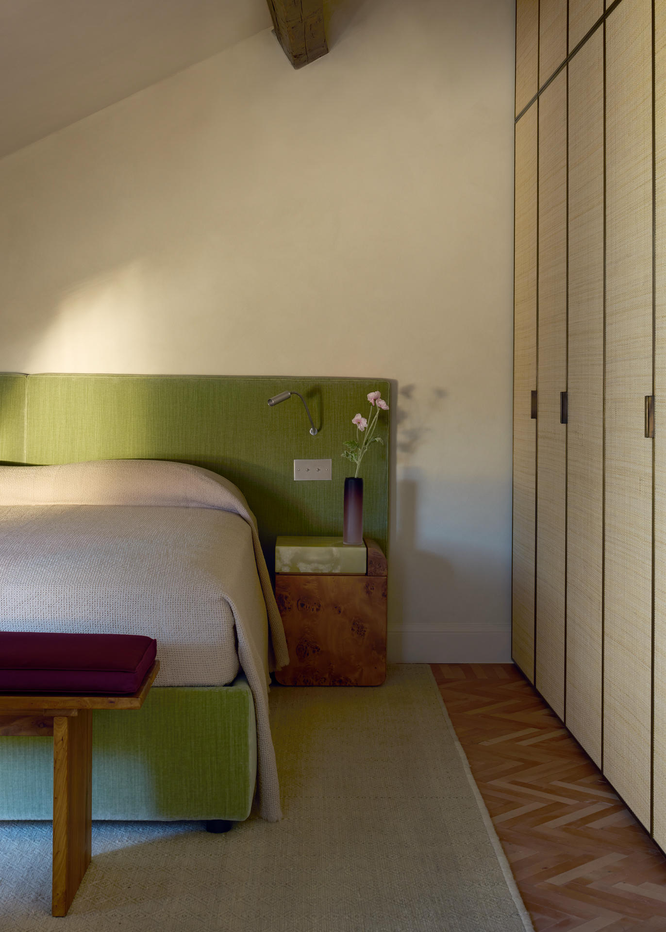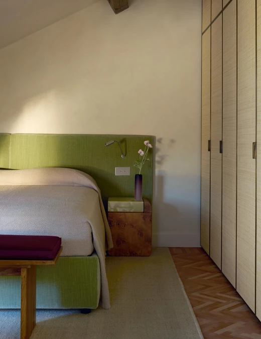 Na poddaszu, gdzie znajdują się sypialnie, odsłonięto oryginalne belki konstrukcyjne. W aranżacji pojawiają się materiały o wyraźnej fakturze – słoma w zabudowach garderobianych i aksamit w tapicerce łóżek. Dzięki temu przestrzeń zyskała intymny charakter, osadzony w materiałach i wrażeniach sensorycznych.
