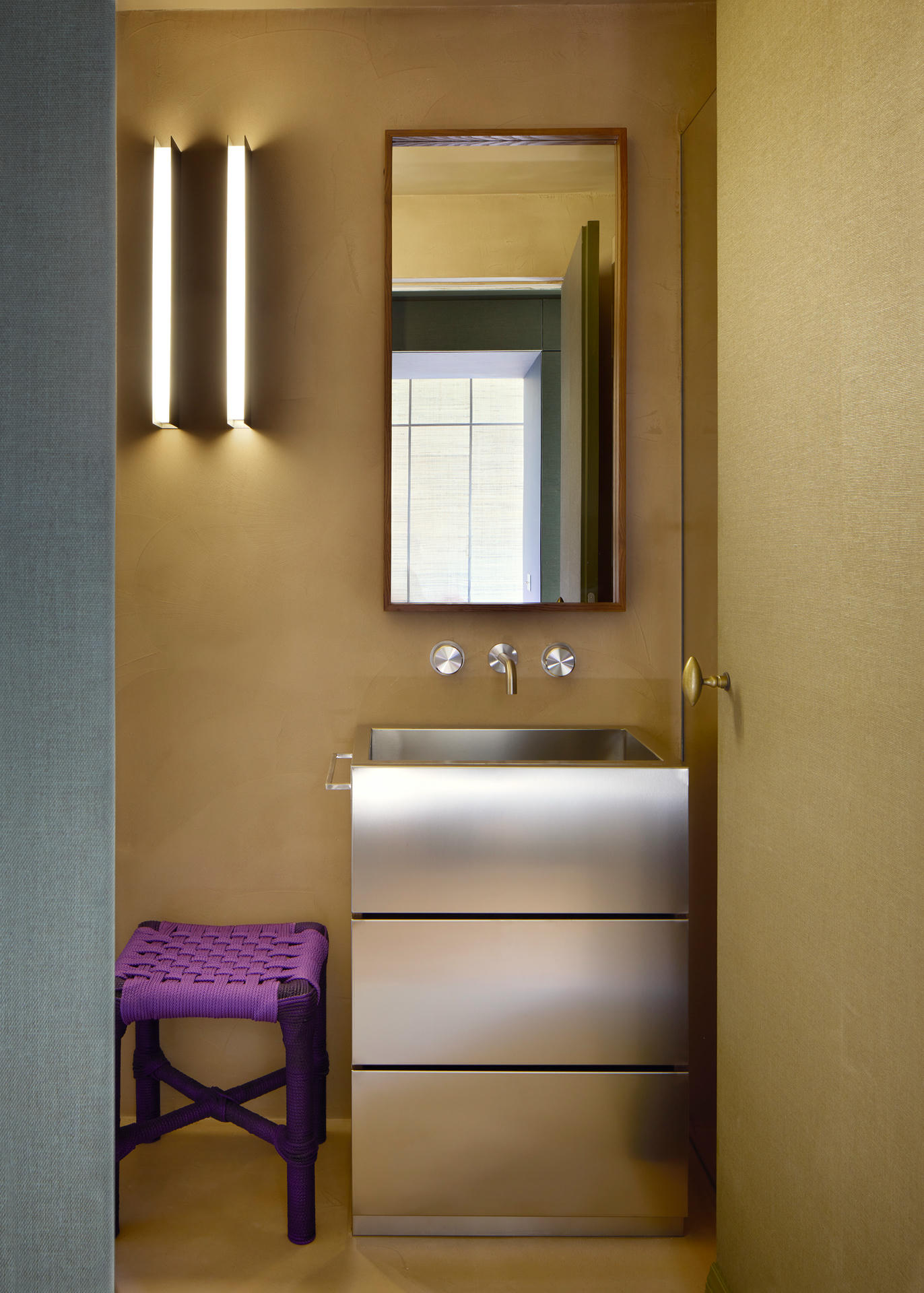 Już od samego progu uwagę przyciąga mocny akcent artystyczny – neonowa praca Light Things autorstwa Josepha Kosutha, którą zestawiono z tapetą Didgeridoo Wall marki Dedar w głębokim i intensywnym odcieniu zieleni, przypominającym wodorosty.