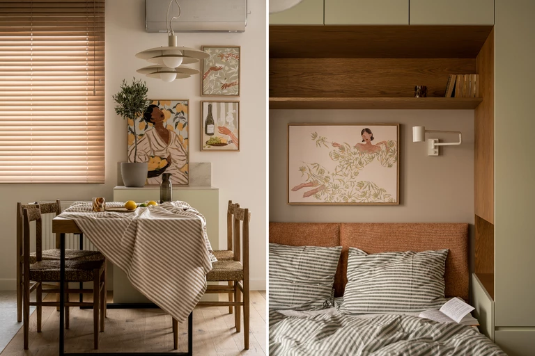 Nieodłącznym elementem wnętrza są dekoracje, które dopełniają całość aranżacji. Obrazy nad wyspą kuchenną, w biurze i w sypialni pochodzą od DESENIO i zostały starannie dobrane, aby wpisywały się w klimat mieszkania. Motywy inspirowane włoską sztuką wprowadzają do wnętrza nutę elegancji i harmonii.