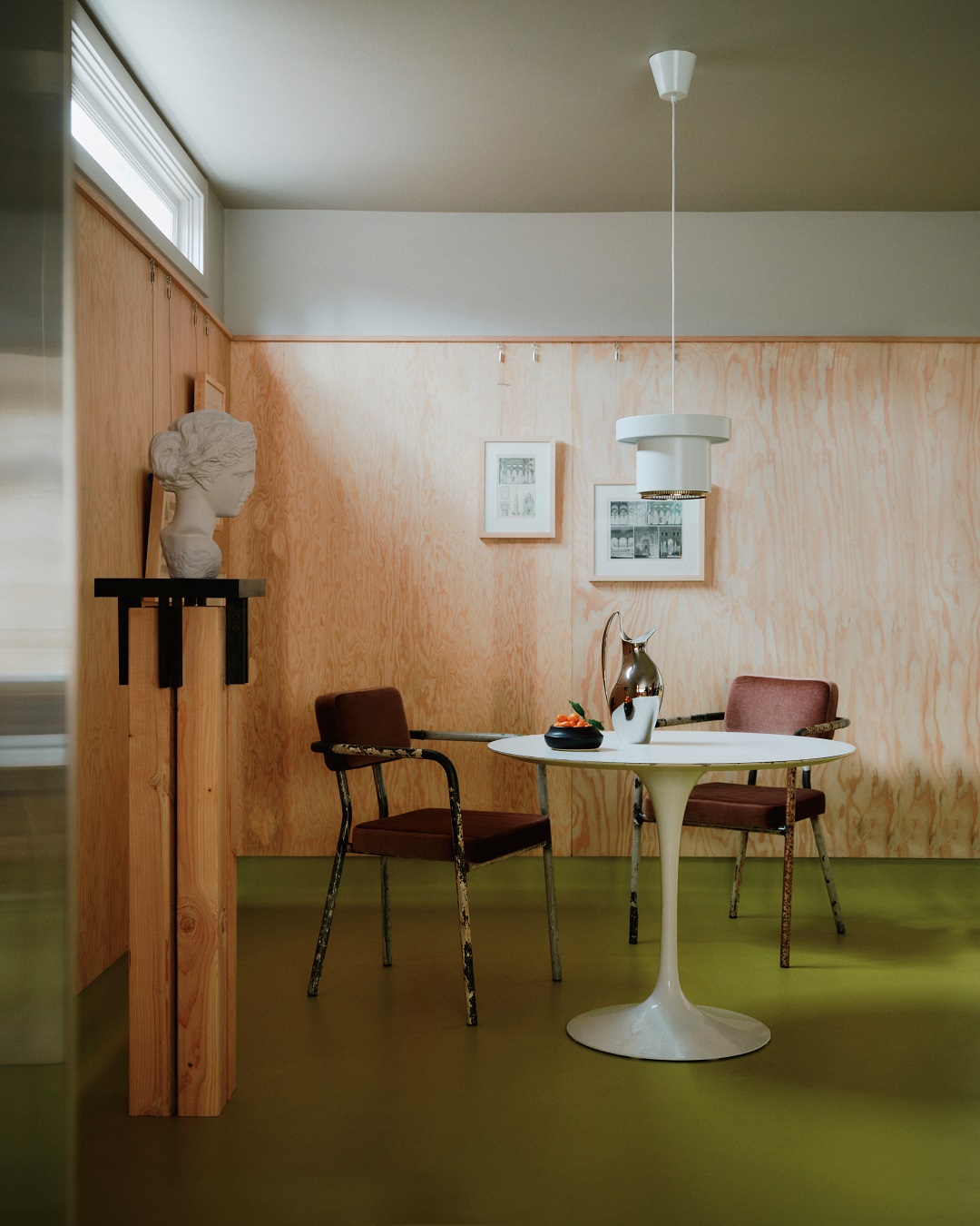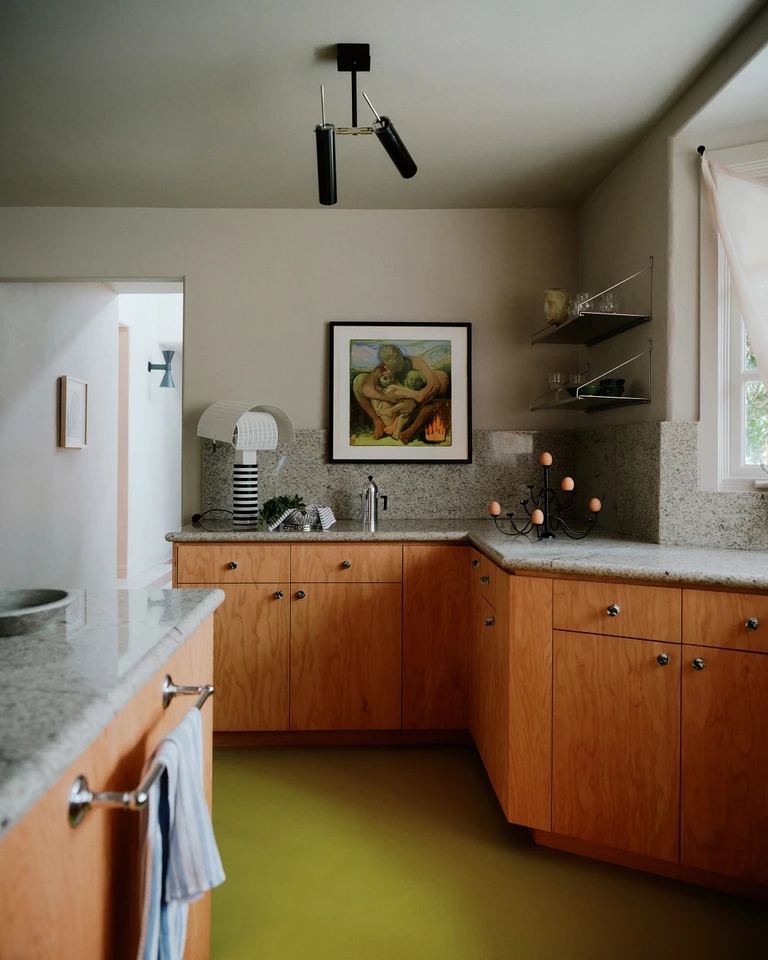 Kuchnia wprowadza wyraźny akcent kolorystyczny dzięki podłodze z winylu o intensywnym żółtozielonym odcieniu. Ściany i zabudowa kuchenna wykonane zostały z kolei ze sklejki przemysłowej.