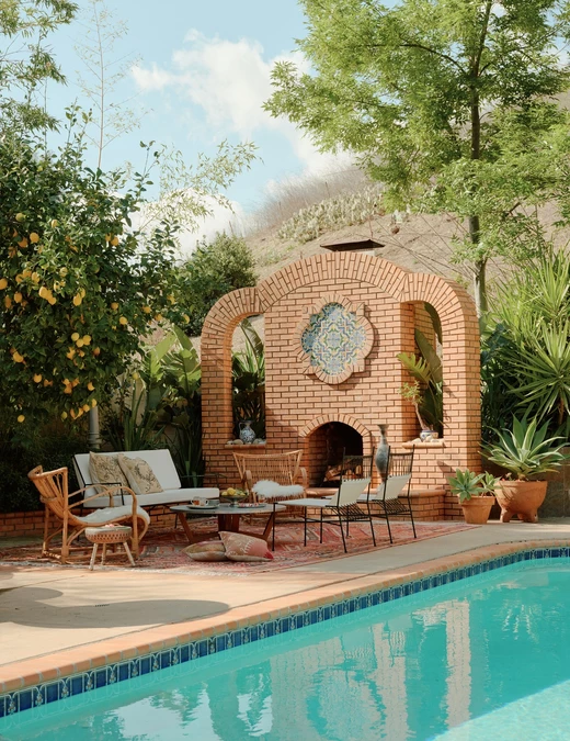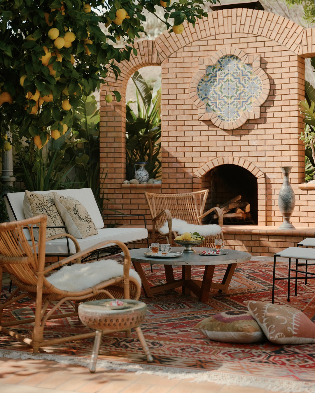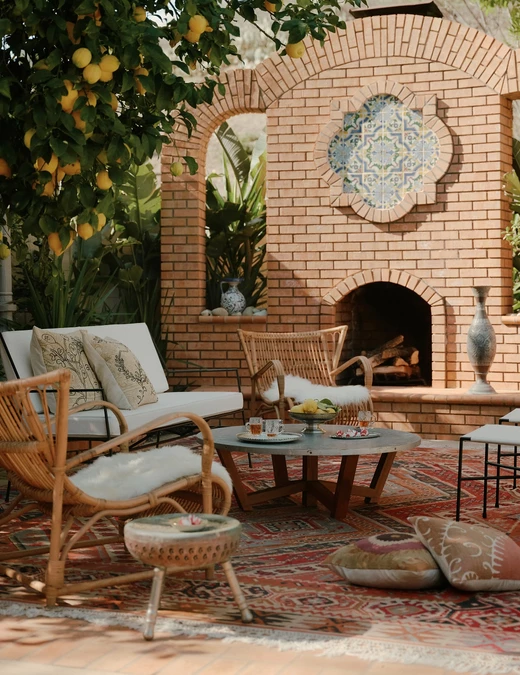 Przestrzeń zewnętrzna stała się naturalnym przedłużeniem domu. W ogrodzie, wśród drzew cytrynowych, stoi ceglany kominek opalany drewnem. Właściciele traktują to miejsce tak samo jak wnętrze – jako przestrzeń do spotkań, rozmów i wspólnego spędzania czasu.