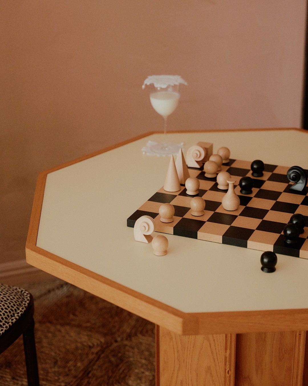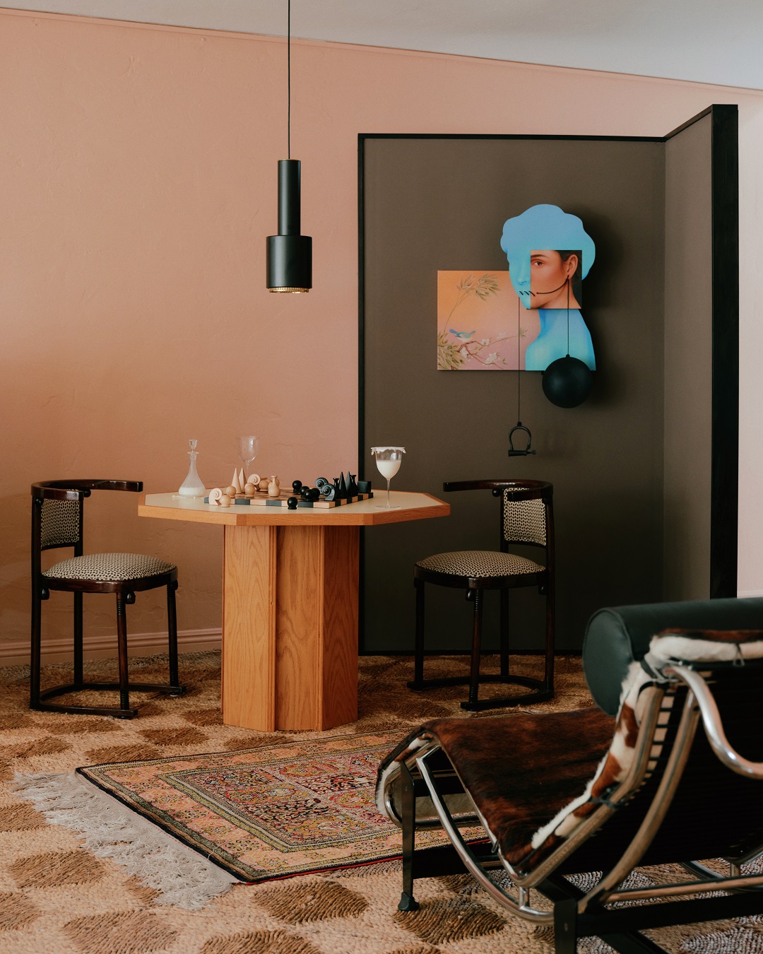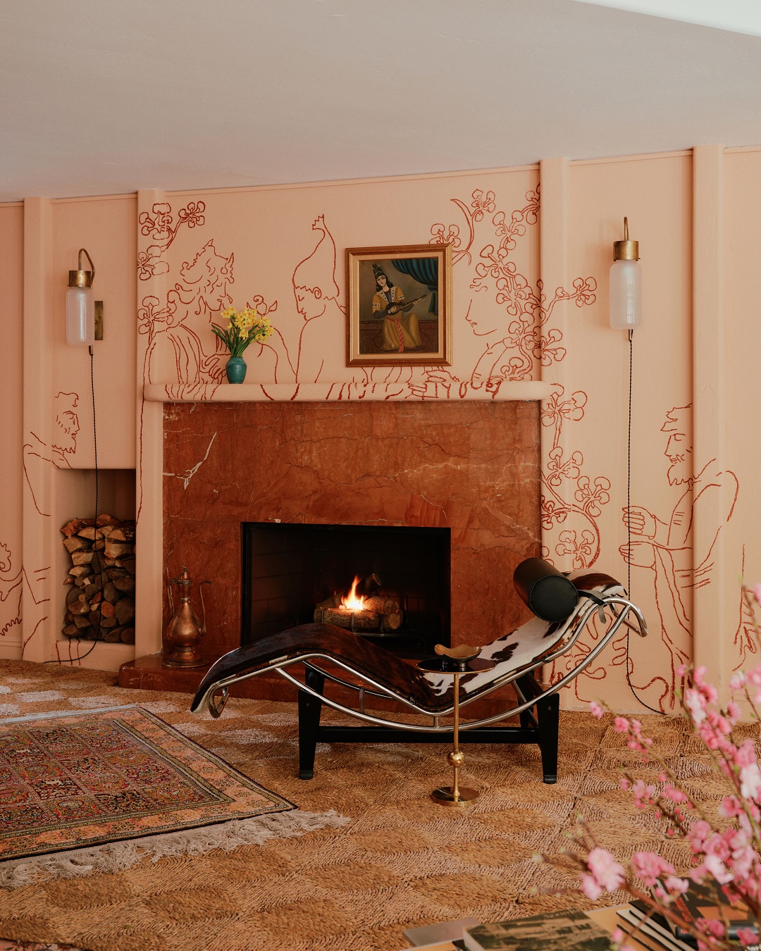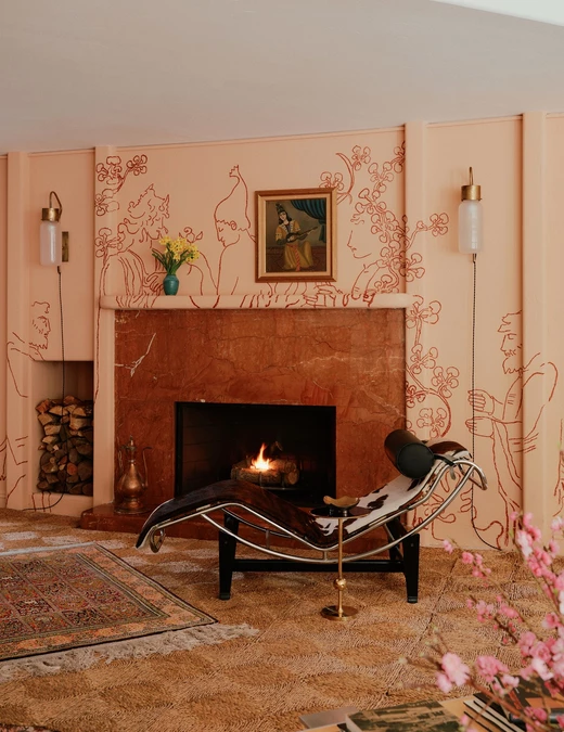 Ścianę wokół kominka projektanci pokryli ręcznie malowanym muralem opartym na idei daru i ofiarowania. Obok powstała przegroda ekspozycyjna, która tworzy tło dla stolika do gier i prezentuje prace współczesnej irańskiej artystki Arghavan Khosravi.