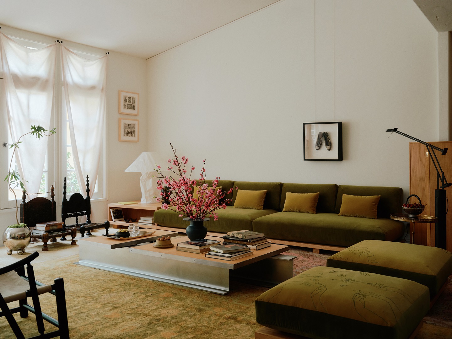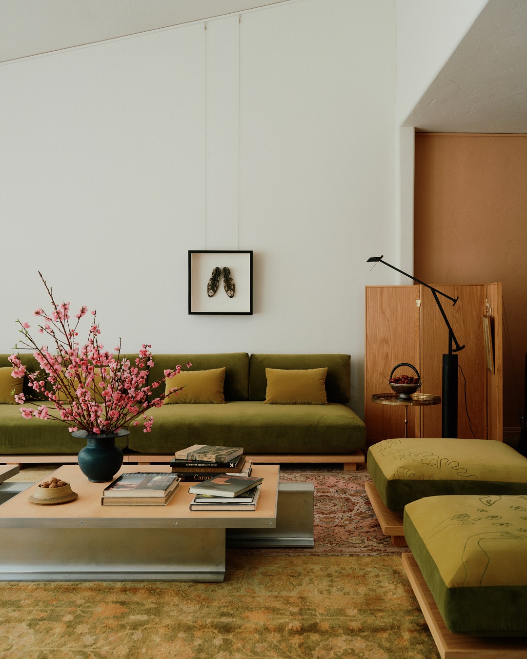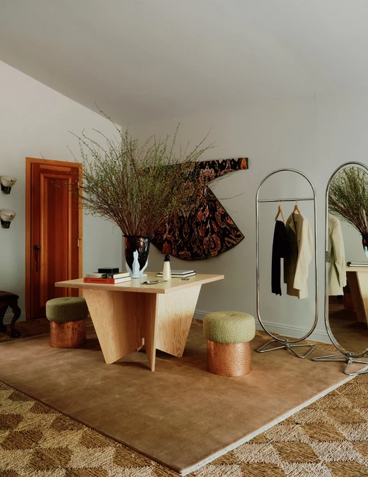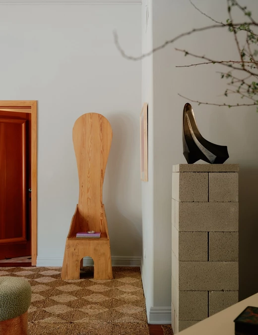 Na ścianie zawisł szczególny obiekt – haftowane buty, rodzinne dziedzictwo pochodzące z ceremonii ślubnej prababki. A w centrum pomieszczenia stanął prototyp stolika kawowego z aluminiowych dwuteowników i skórzanych blatów zaprojektowanych tak, aby z czasem pokryły się patyną.