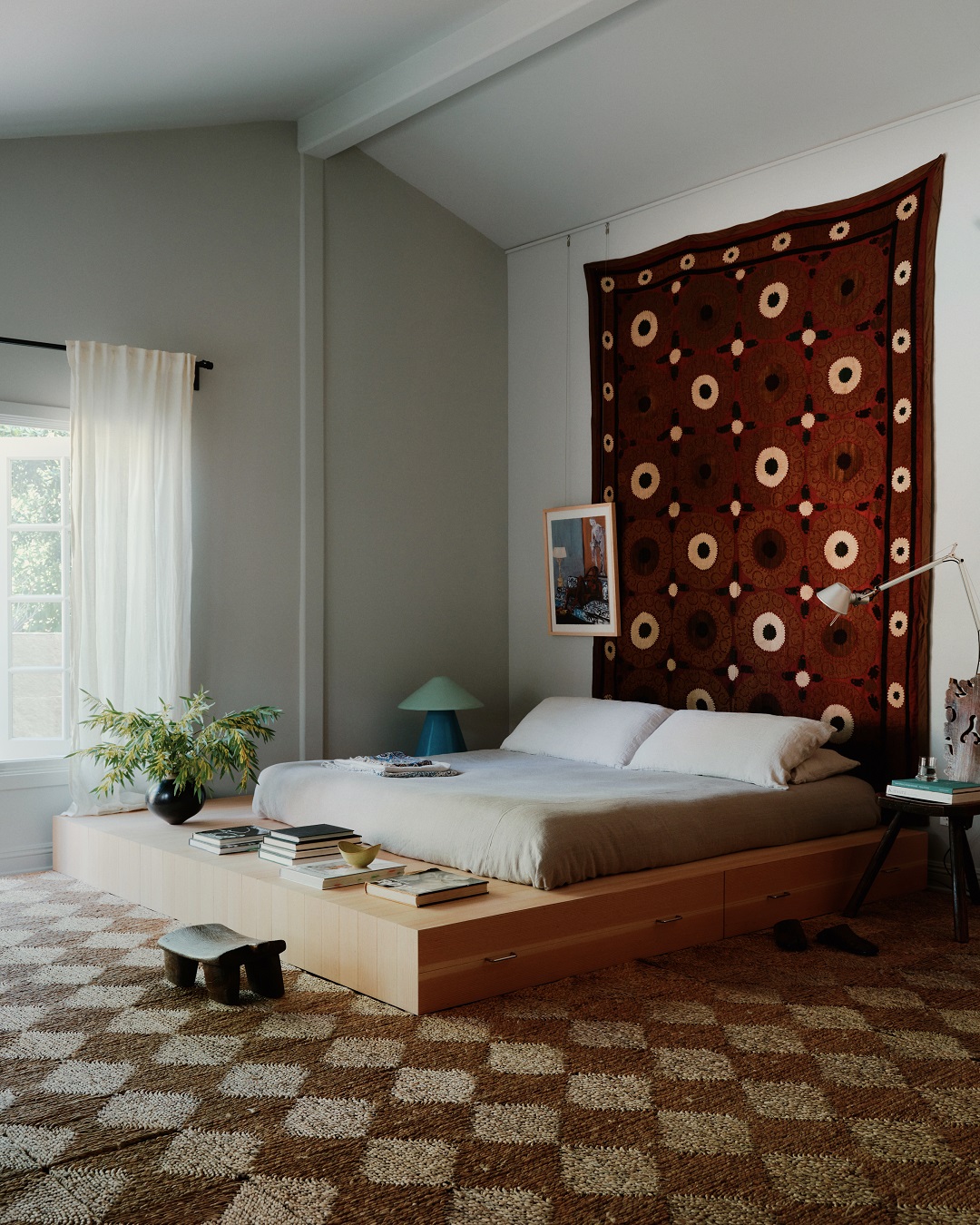 Łóżko z kolei postawione zostało na platformie unoszącej się nad podłogą. W tym pokoju książki, rzeźby, obrazy i inne osobiste przedmioty właścicieli tworzą gęstą i żywą kompozycję codzienności.