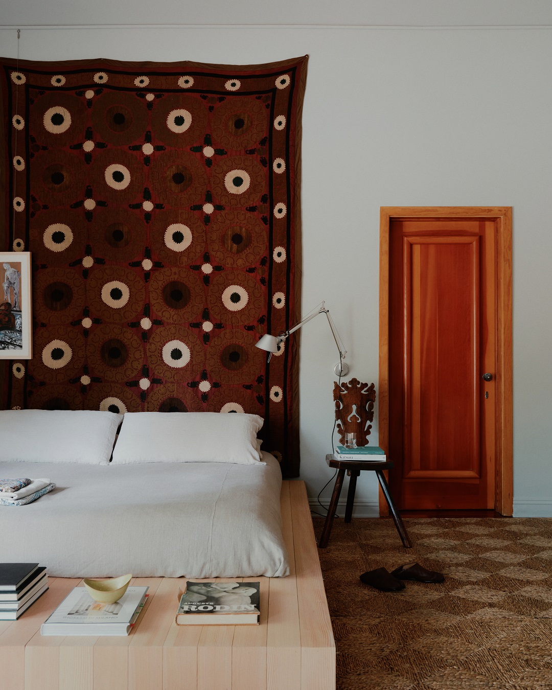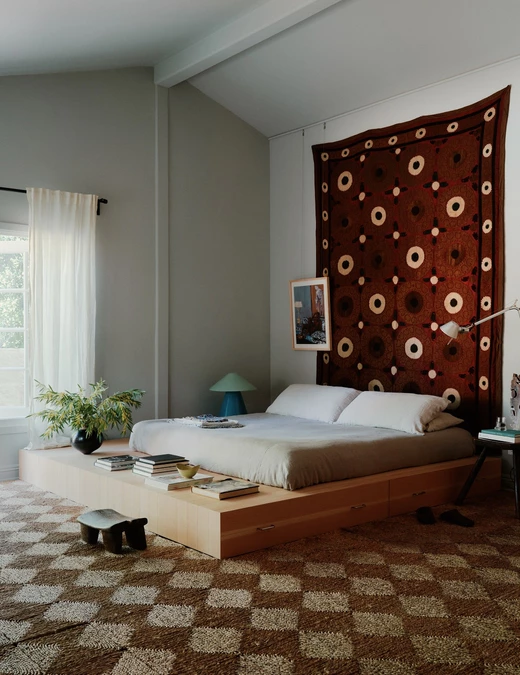W sypialni znalazło się miejsce na obszerną garderobę, na środku której stoi konsola ze sklejki. Wokół niej projektanci ustawili zaprojektowane przez siebie taborety z młotkowanej miedzi inspirowane tradycyjnymi irańskimi naczyniami. Ściany zdobią tekstylia z Uzbekistanu, a ubrania wiszą na stojaku projektu Vernera Pantona z lat 70.