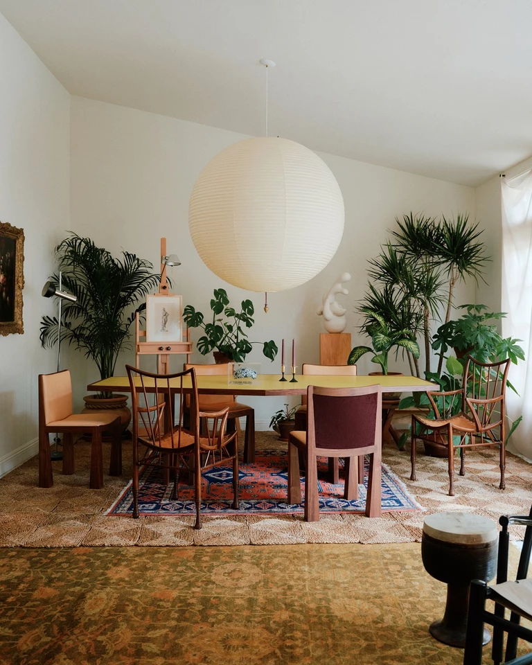 W części jadalnej stanął stół zaprojektowany z myślą o wspólnych posiłkach. Towarzyszą mu krzesła Palan, również autorstwa projektantów, zestawione z vintage krzesłami Thebes z Egiptu. Kompozycję dopina duża lampa projektu Isamu Noguchiego.