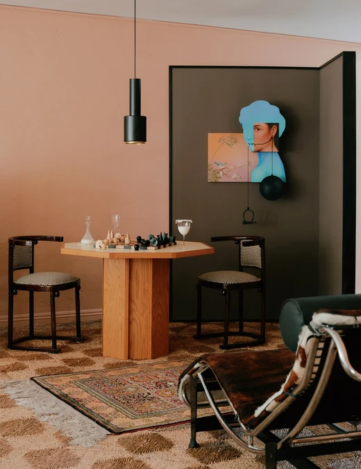 Salon inspirowany jest wiedeńskimi salonami z przełomu XIX i XX wieku. Projektanci stworzyli tu m.in. wielowarstwową kompozycję dywanów, w której podłoga gra równie istotną rolę jak meble. Niskie sofy zaprojektowane przez studio nawiązują zaś do perskich takhtów znanych z herbaciarni i zachęcają do długich rozmów. Wśród wyposażenia znalazły się też ręcznie rzeźbione krzesła z Nuristanu w Afganistanie oraz haftowane podnóżki zaprojektowane przez właścicieli jako odniesienie do dawnych tradycji zdobniczych obecnych w rodzinnych kolekcjach ubiorów.