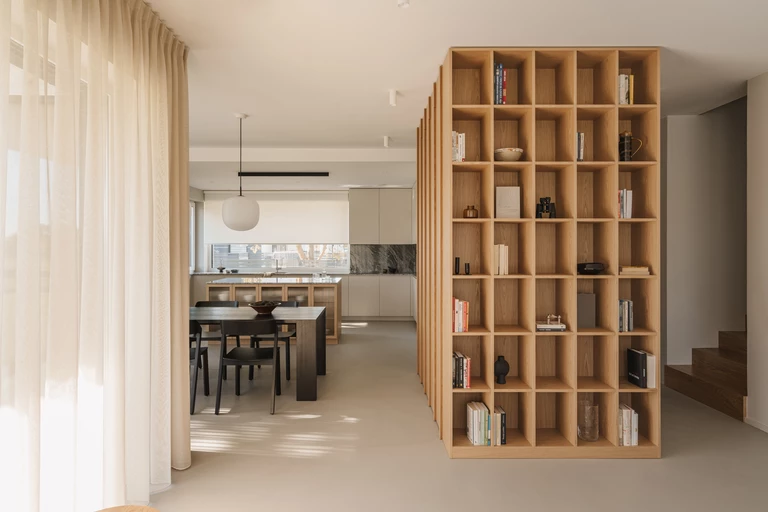 Otwartą strefę dzienną oddziela od klatki schodowej zabudowa meblowa w formie kubika, w której ukryto szafy gospodarcze, dodatkowe przechowywanie służące kuchni oraz funkcjonalny regał.
