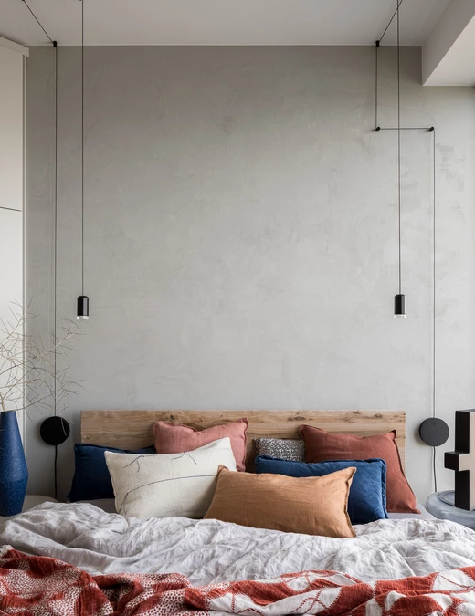 To mieszkanie to również niewielka sypialnia z zabudową meblową, której kolor łączy się z tym w korytarzu. Drewniany zagłówek łóżka marki Mazzivo świetnie pasuje również do koloru ściany a elementem, który podkreśla charakter tej przestrzeni jest zwisające oświetlenie Vibia Wireflow, którego przewody poprowadzone są na wzór industrialnych wnętrz na wierzchu – po ścianie.