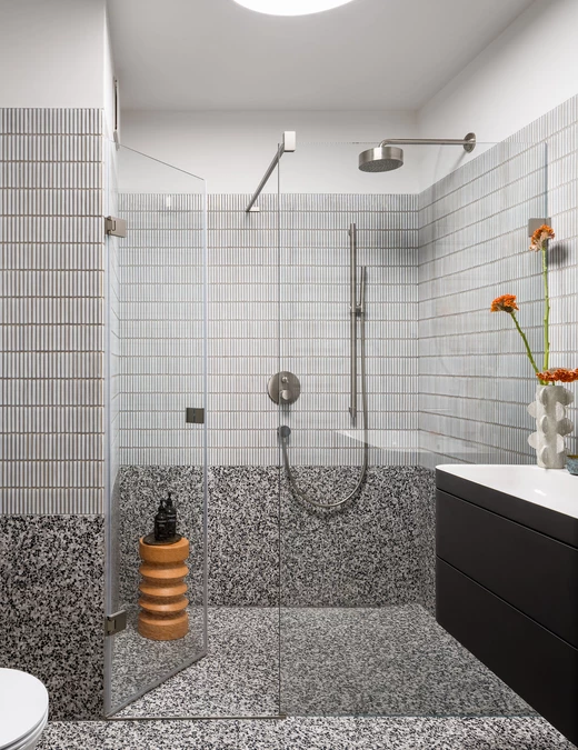Jest jeszcze jedno pomieszczenie w tym mieszkaniu, obok którego nie można przejść obojętnie. Łazienka z czernią w roli głównej. To, że jest taka przestronna spowodowane jest tym, że pralka oraz suszarka znajdują się w zabudowie – w korytarzu, dlatego tu Magda Daszkiewicz skupiła się na stworzeniu salonu kąpielowego – z dużą strefą prysznicową.