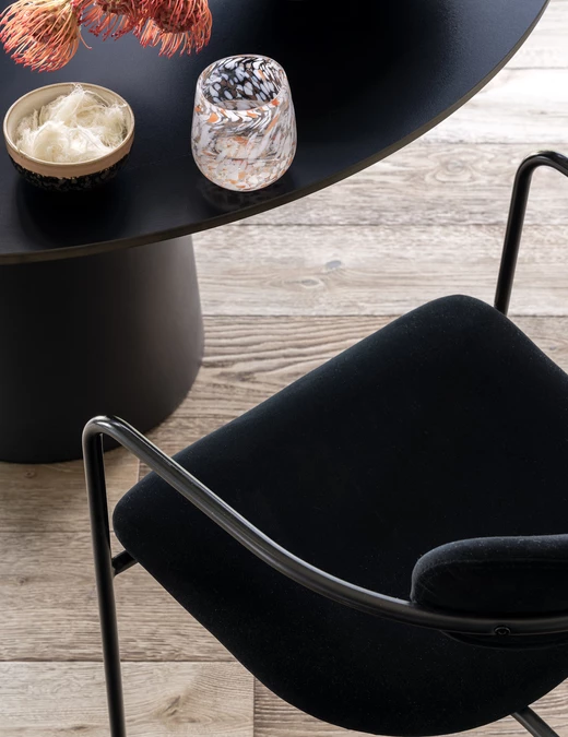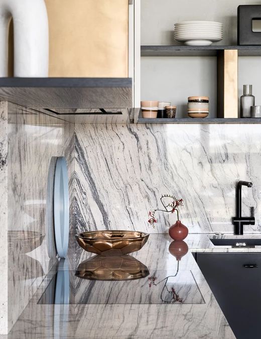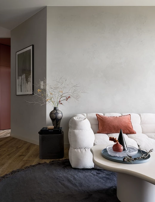Wystarczy zrobić kilka kroków dalej – do części dziennej, która łączy trzy strefy: kuchenną, jadalnianą i wypoczynkową. Kanapa Michelin Nordic Line, fotel tapicerowany Good Living&Co. oraz stół Moooi Container to przepiękne formy wzornicze, które świetnie ze sobą korespondują. A na ich tle można dojrzeć wiele detali takich jak wazony, misy, czy inne ceramiczne przedmioty. Tu wszystko się ze sobą uzupełnia. Uwagę zwraca tu również część kuchenna. Na blacie zastosowano kamień z mocnym użyleniem. Wzór przechodzi z blatu na ścianę, a na niej jest farba dająca efekt tynku glinianego. Architektka przyznaje, że długo takiej szukała, ponieważ większość tzw. farb strukturalnych daje efekt sztuczny, z połyskiem, w rodzaju stiuku, co absolutnie nie pasowało do tego wnętrza.