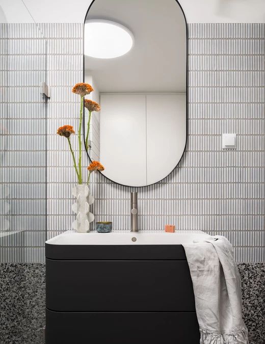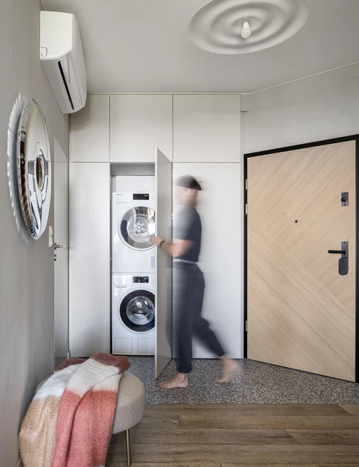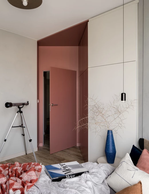 „Ściana w części dziennej tego mieszkania jest pod innym kątem niż główna ściana w sypialni. Zaprojektowaliśmy to wnętrze tak, żeby wszystkie te krzywizny krzyżowały się w korytarzu i zamiast je ukrywać – wykorzystaliśmy je jako atut. Powstało dynamiczne i odważne kolorystycznie przejście, które sami nazywamy „tunelem” – mówi Magda Daszkiewicz, architektka i właścicielka pracowni PRZESTRZENIE. „Zależało nam, żeby to rozwiązanie wyglądało minimalistycznie, więc zastosowaliśmy m.in. drzwi z ukrytymi ościeżnicami, brak progów oraz szafy bez uchwytów. A przysłowiową „kropką nad i” było pomalowanie tych elementów jednym, tym samym – mocnym kolorem” – dodaje.