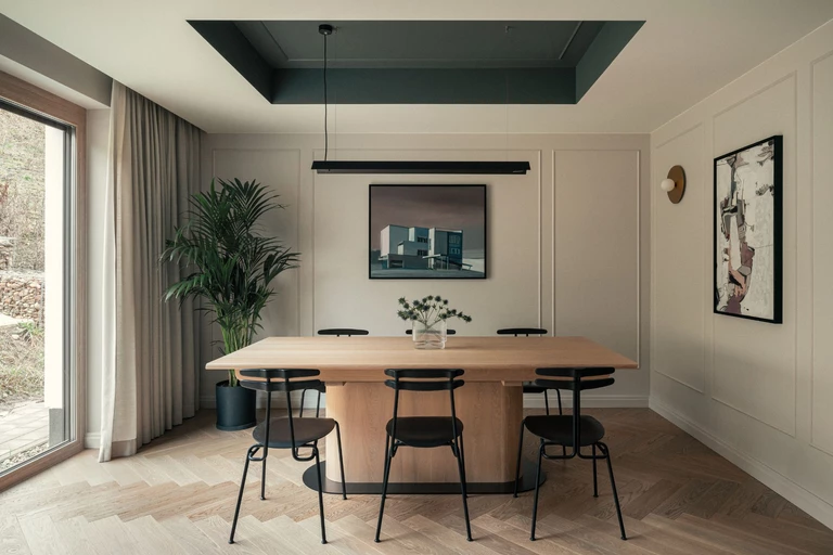 Klasycznym elementem w tym pomieszczeniu są sztukaterie na ścianach, które dobrze łączą się ze współczesnymi meblami – dębowym stołem i czarnymi krzesłami Trojka polskiej marki Tabanda. We wnętrzu nie brakuje też złotych akcentów – w lampie Cherry marki Petite Friture czy oprawach kinkietów.