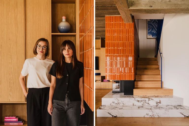 Już od wejścia, przez przeszklone drzwi pivot, rozpościera się widok na otwartą przestrzeń parteru. Definiują ją dwie wyraziste bryły: kominek wykończony strukturalną pomarańczową płytką Ceramica „Vogue” z kolekcji Flauti oraz stalowa wyspa kuchenna pokryta czarną płytką. Ich błyszczące powierzchnie odbijają światło, subtelnie zmieniając swój wygląd w zależności od pory dnia i natężenia oświetlenia.