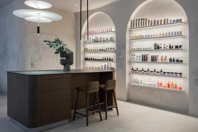 Ciekawy efekt udało się osiągnąć dzięki artystycznemu postarzaniu ścian. Wędrujący po nich wzrok zatrzymuje się na dłużej przy dekoracyjnych łukach, które eksponują bogatą ofertę produktów. Salon LOCO to również drogeria, w której można kupić kosmetyki do pielęgnacji włosów i ciała. Właścicielom zależało na odpowiednim wyeksponowaniu produktów, ale nie chcieli klasycznych gablot.