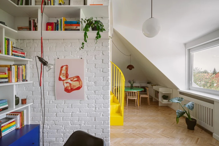 Sercem aranżacji są żółte schody, które znajdują się w geometrycznym centrum mieszkania. Jednocześnie pełnią rolę łącznika między częścią dzienną na parterze oraz częścią prywatną na antresoli, gdzie mieści się też strefa zawodowa (w tym studio nagrań). „Zamontowanie stalowych schodów na czwartym piętrze bez windy było sporym wyzwaniem projektowym i wykonawczym. Ponadto uzyskanie odpowiedniej struktury i głębi koloru poprzedzone było szeregiem prób” – mówi projektant.
