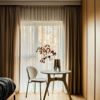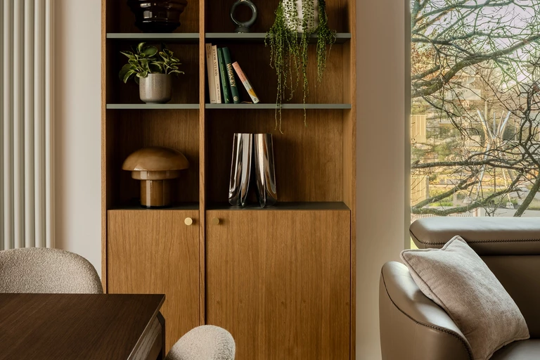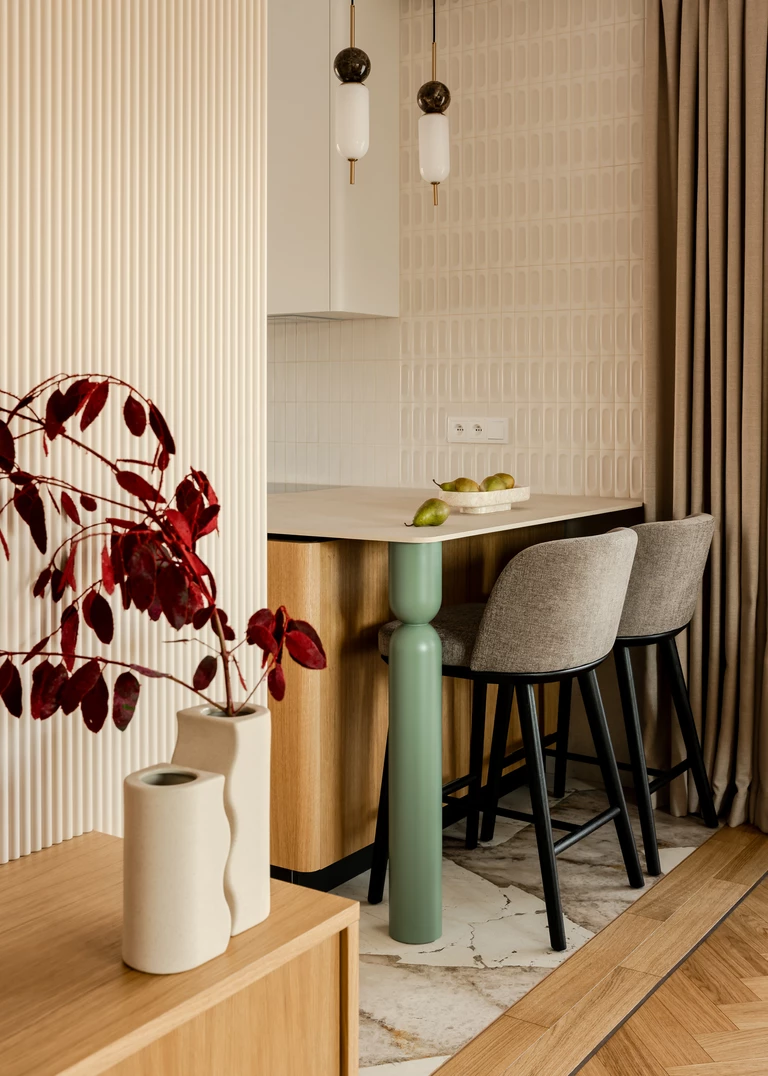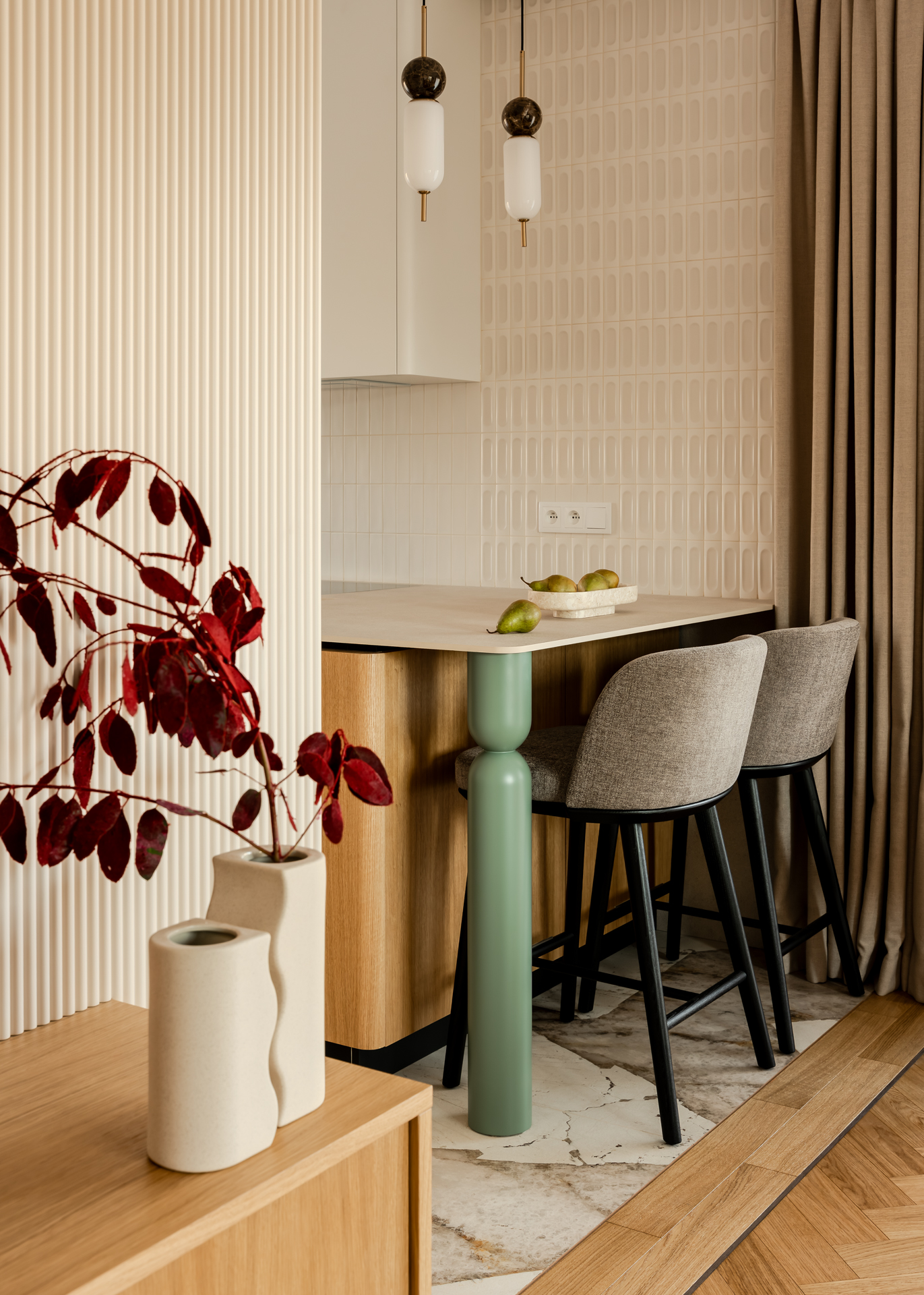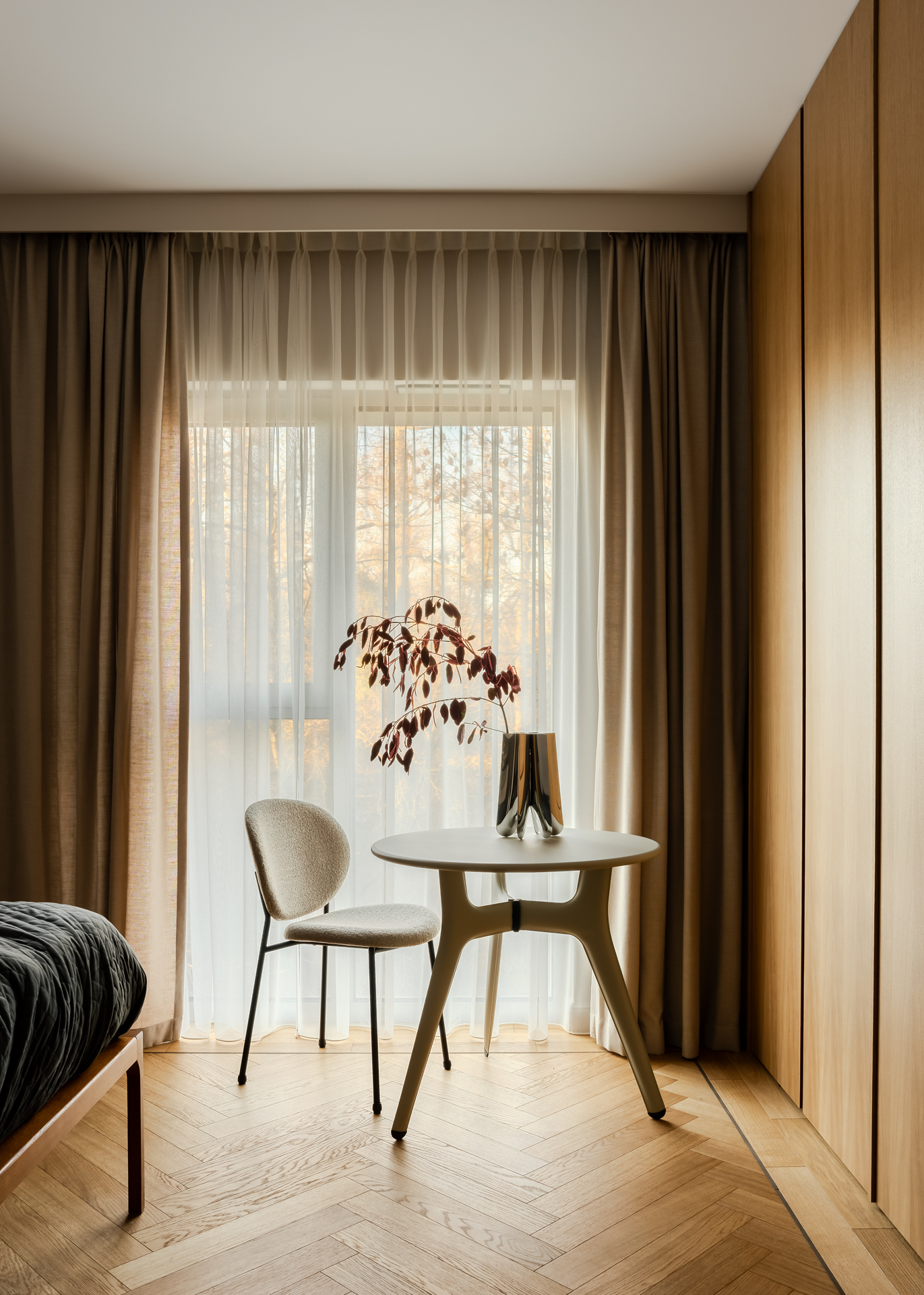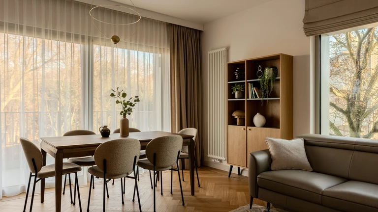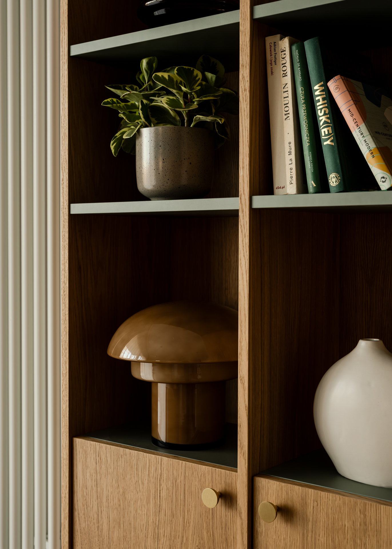 Realizacja pokazuje wagę spójnego detalu. Od precyzyjnych połączeń drewna po przemyślany dobór tekstur - każdy element tego wrocławskiego mieszkania służy wygodzie i estetycznym zachwytom.