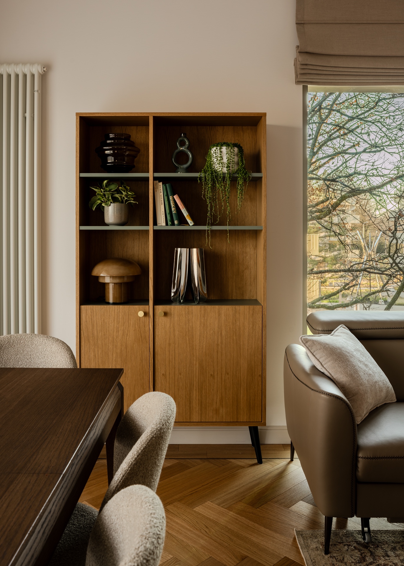 Strefa dzienna płynnie łączy wypoczynek z częścią jadalnianą i kuchenną. Kluczową rolę odegrała tu stolarka od WZÓR woodwork. Meble wykonane na wymiar pozwoliły na stworzenie wysokiej, niemal niewidocznej zabudowy oraz wyspy, która pełni funkcję centrum domowego życia. Interesującym akcentem jest regał stojący za stołem. Projektanci nadali mu formę nowoczesnego kredensu, nawiązując do tradycyjnych mebli służących do eksponowania książek i ceramiki.