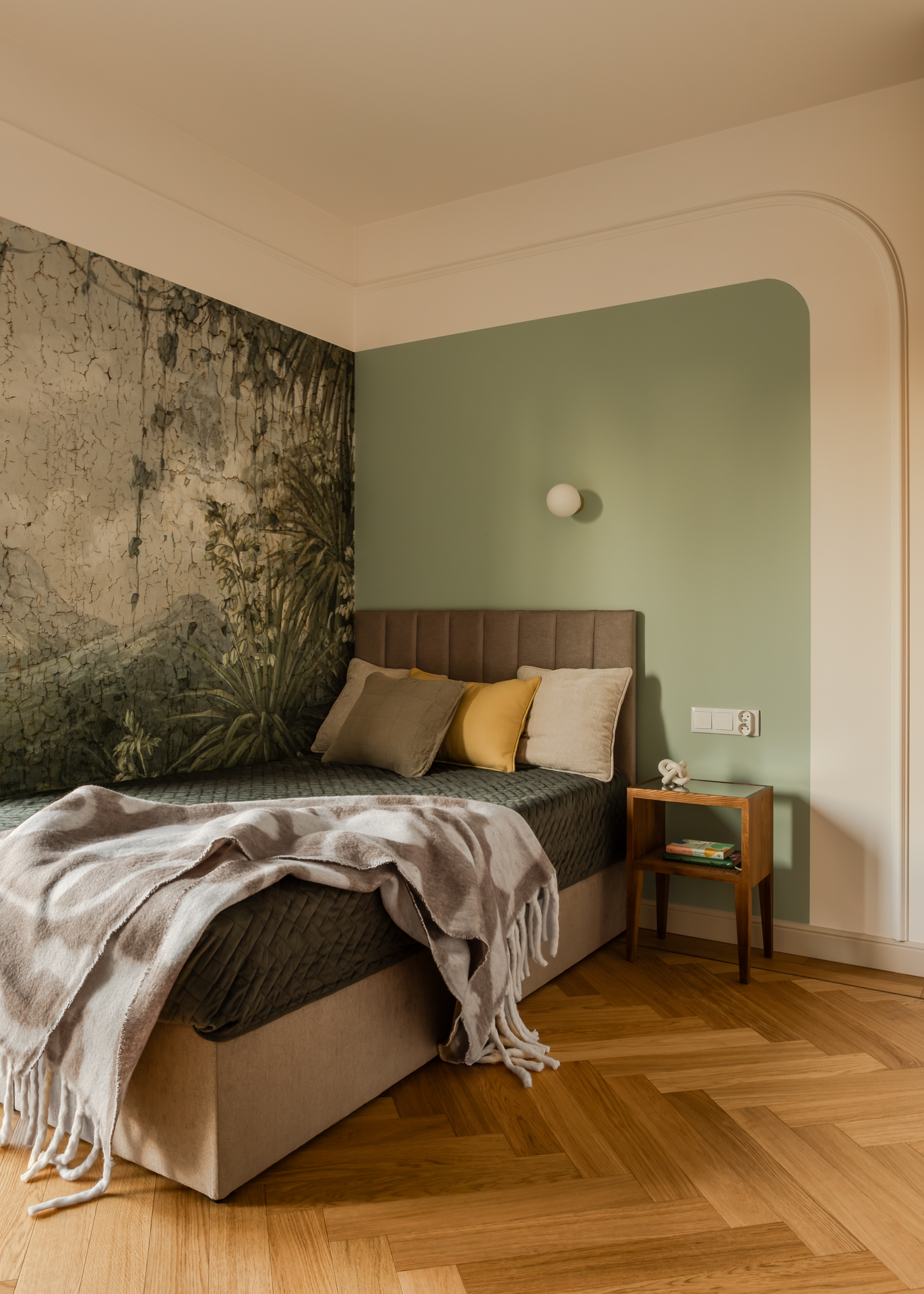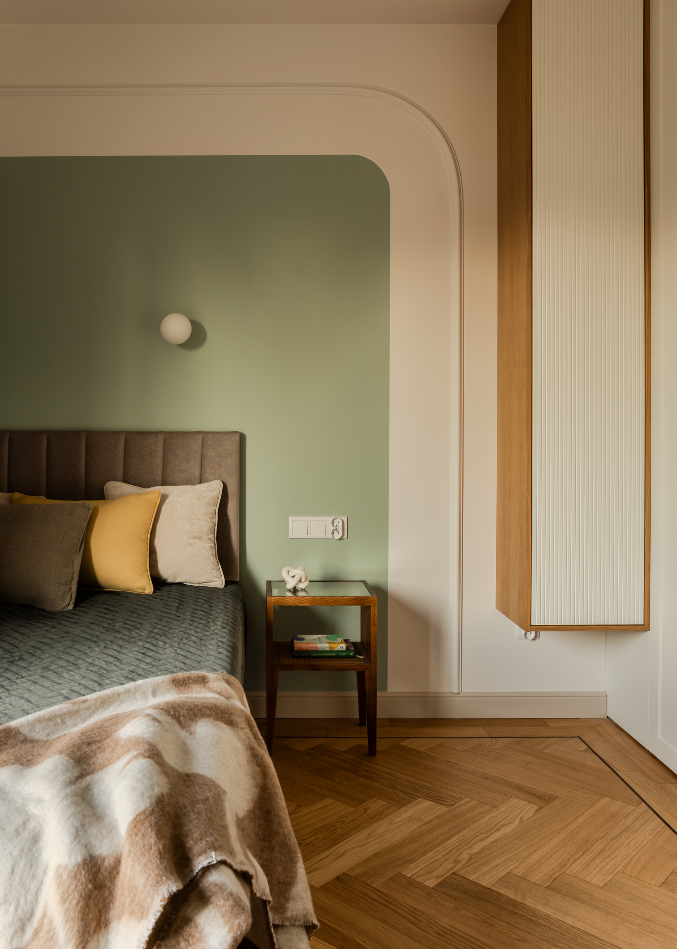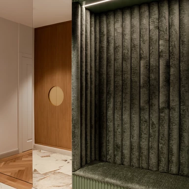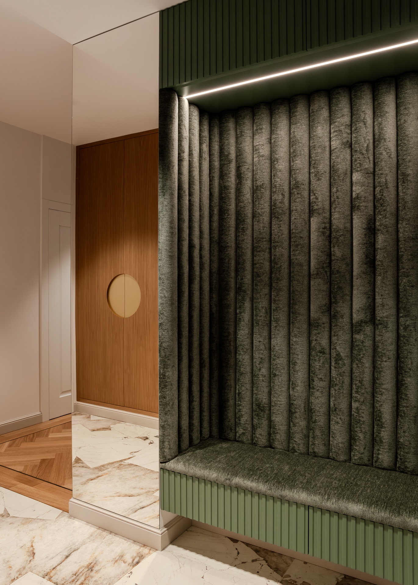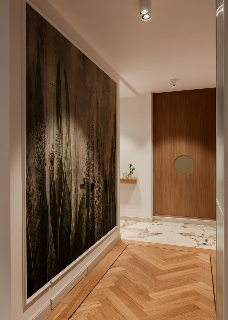 W korytarzu czeka wizualne zaskoczenie - ściana pokryta tapetą w oliwkowym odcieniu. Ten kolor stanowi bezpośrednie nawiązanie do koron drzew parku otaczającego budynek. W zielonej płaszczyźnie dyskretnie ukryto wejście do głównej łazienki. W jej wnętrzu powraca motyw ciepłego beżu, tym razem zestawiony ze złotymi detalami, które dodają przestrzeni subtelnego blasku.