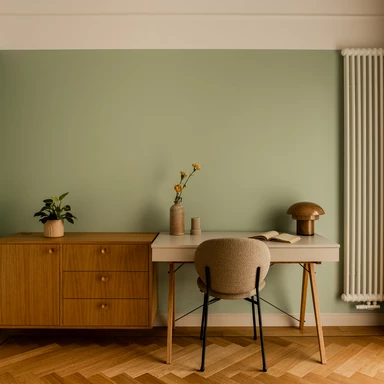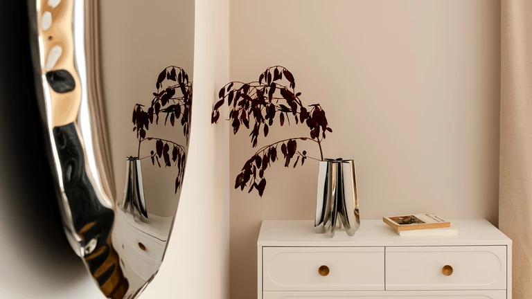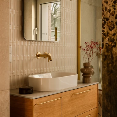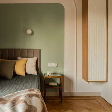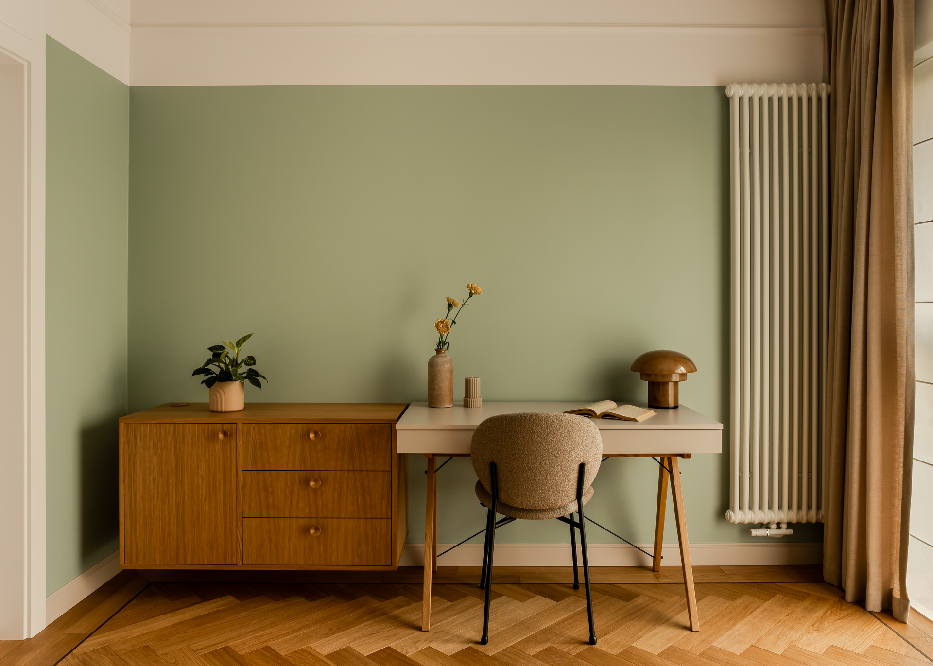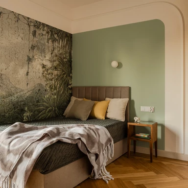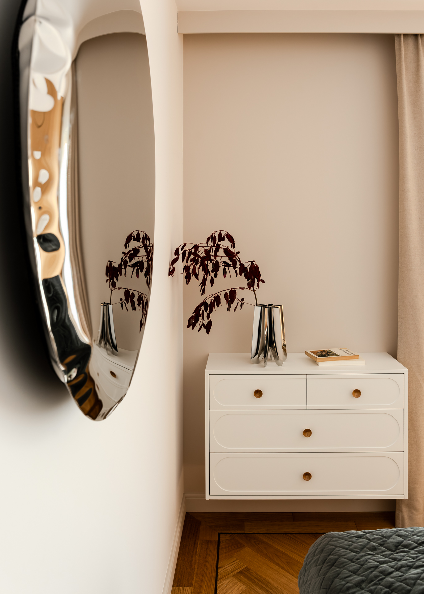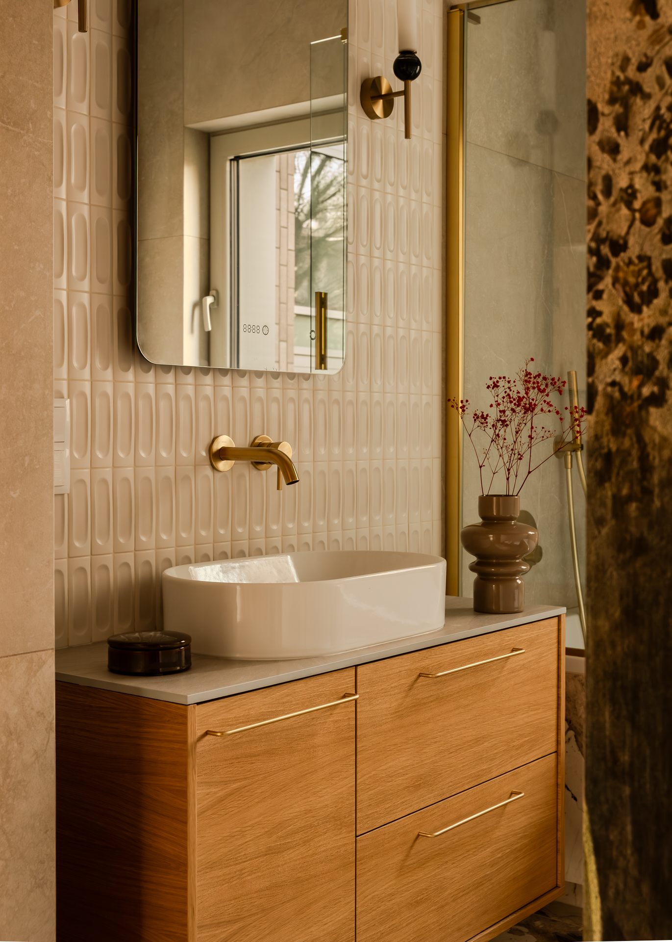 W korytarzu czeka wizualne zaskoczenie - ściana pokryta tapetą w oliwkowym odcieniu. Ten kolor stanowi bezpośrednie nawiązanie do koron drzew parku otaczającego budynek. W zielonej płaszczyźnie dyskretnie ukryto wejście do głównej łazienki. W jej wnętrzu powraca motyw ciepłego beżu, tym razem zestawiony ze złotymi detalami, które dodają przestrzeni subtelnego blasku.