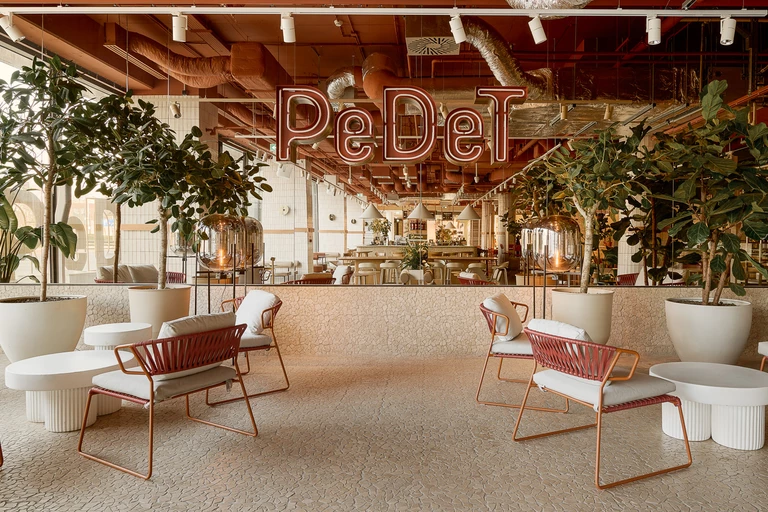 Kolorystyka wnętrza Pedetu nawiązuje do stylistyki budynku. Dominują beże, odcienie brązu, terakoty i miedzi. Aranżacja bogata jest także w faktury kamienia, szkła ornamentowego czy kafelków o nieregularnej powierzchni. Warto też zwrócić uwagę na detale, takie jak obręcze na słupach, jednocześnie będące wieszakami na ubrania i torebki.