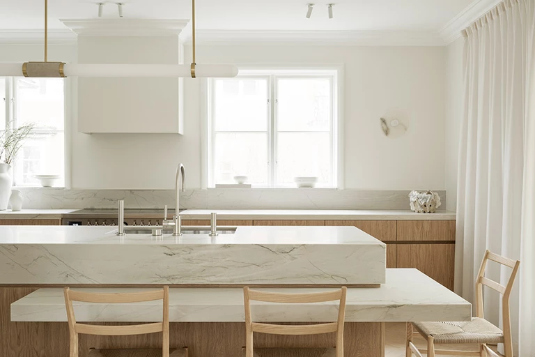 Sercem kuchni bez wątpienia jest dwupoziomowa, wykonana z drewna i białego kwarcytu wyspa kuchenna, która służy jako miejsce pracy oraz centrum towarzyskich spotkań. Wpadające przez okna dzienne światło uwydatnia detale faktury kwarcytowego blatu i drewnianego parkietu.