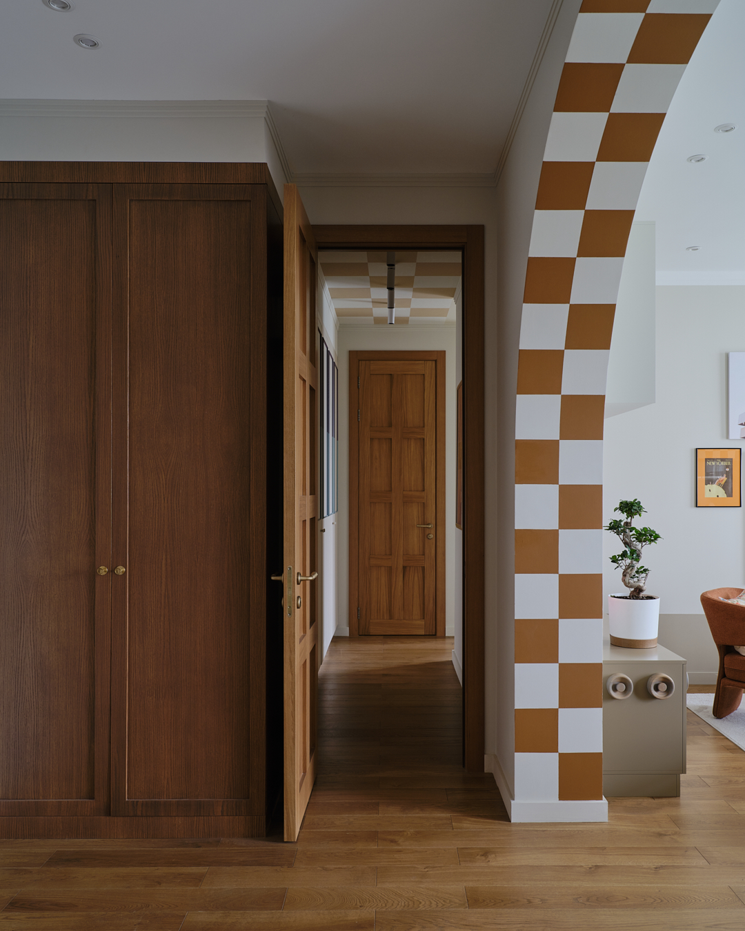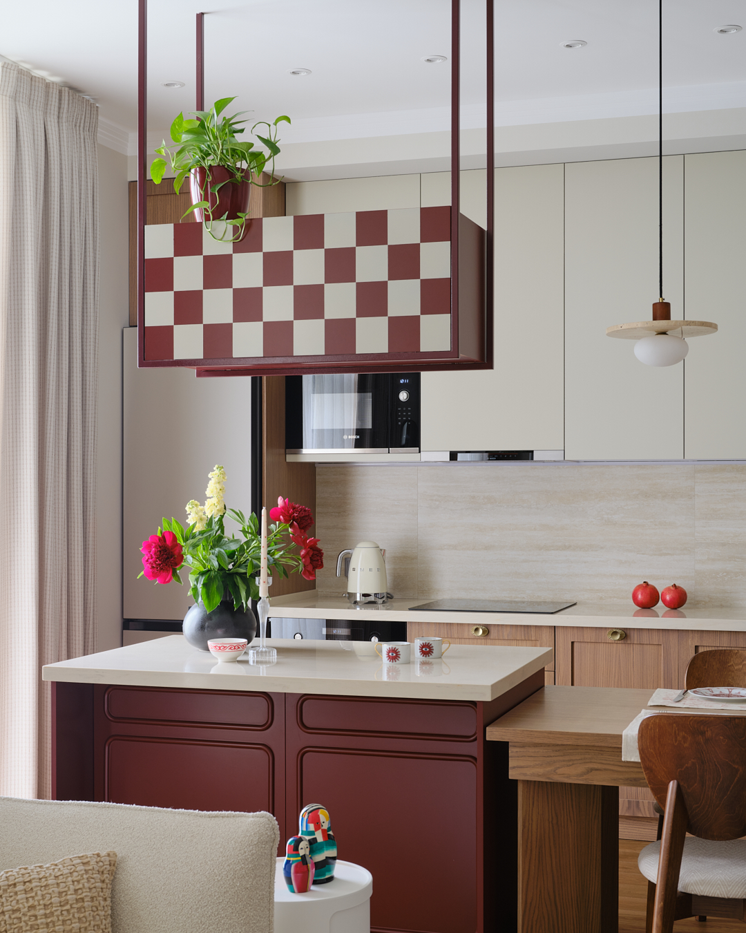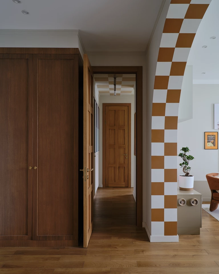 Tę spokojną przestrzeń ożywiono dynamicznymi akcentami: kolekcją sztuki oraz odważnym motywem szachownicy. Pojawia się on na łuku wejściowym, suficie w korytarzu i jednej z podwieszanych szafek kuchennych. „Pomimo geometrycznej prostoty, wzór ten ma angielsko-rzymskie korzenie i pięknie wzbogaca przestrzeń, nie dodając jej wizualnego ciężaru” – mówi projektantka.