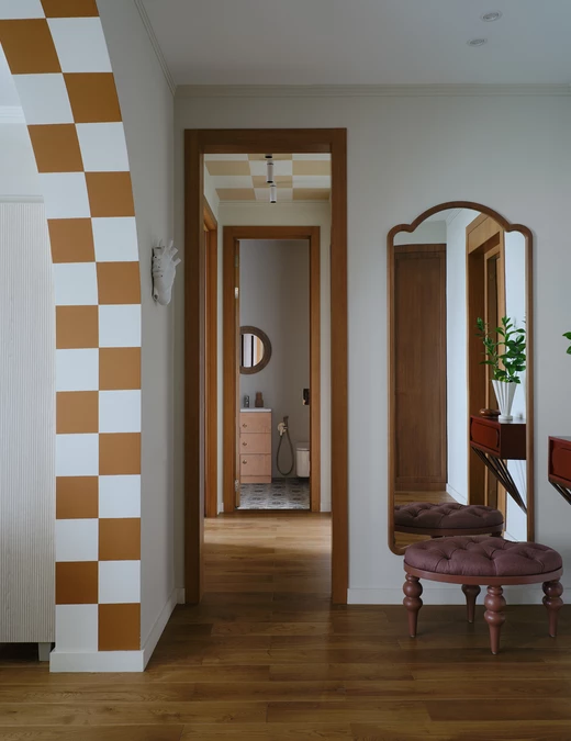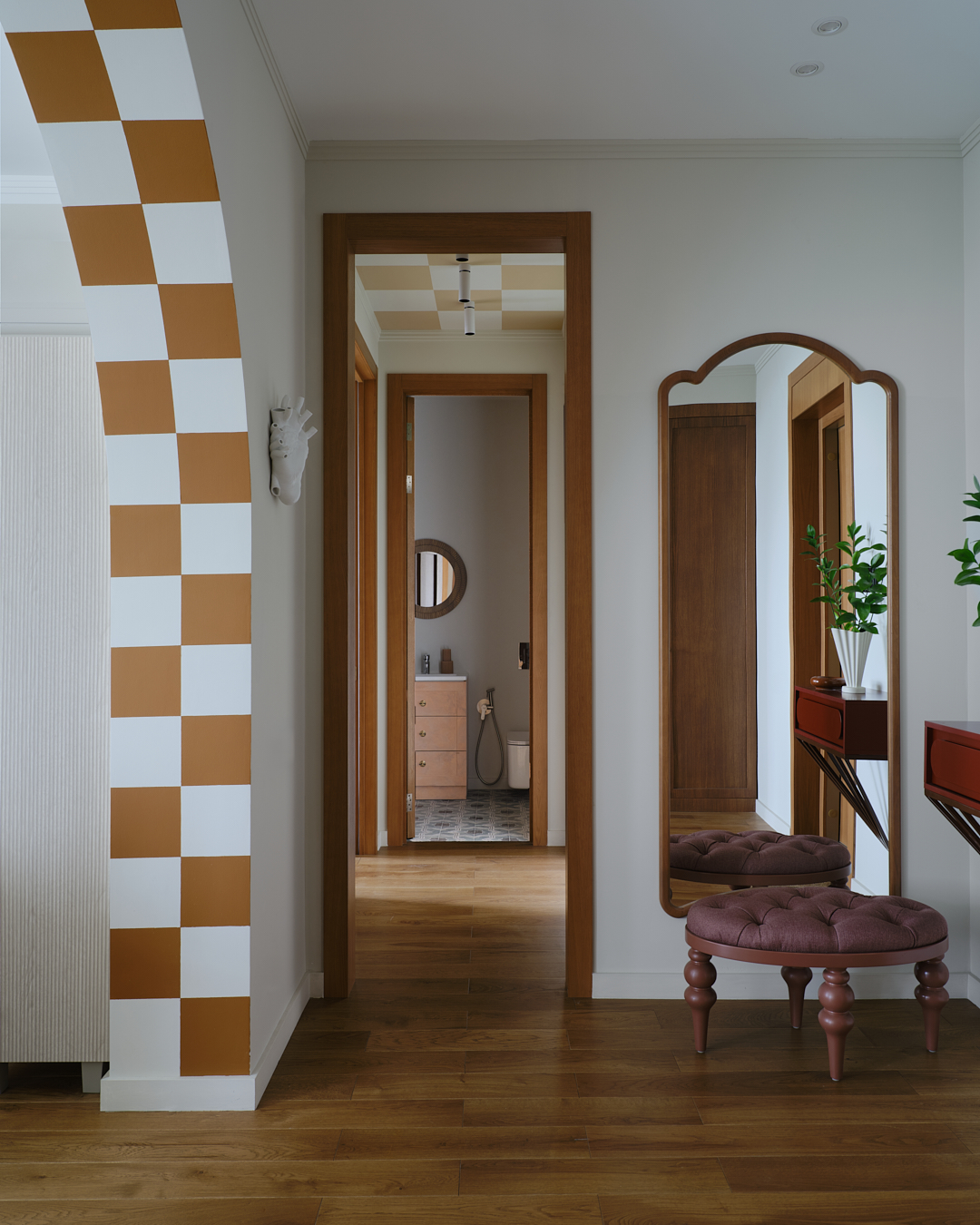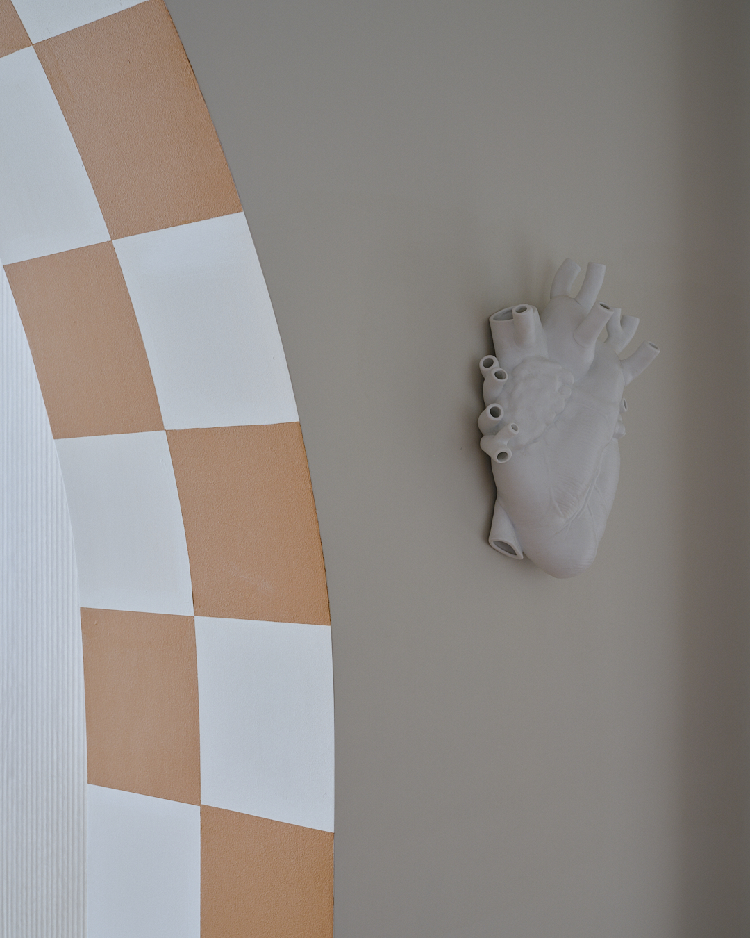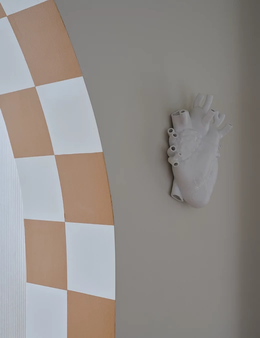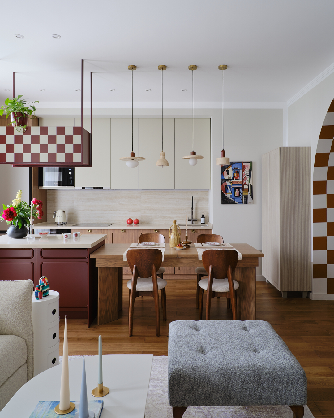 Tę spokojną przestrzeń ożywiono dynamicznymi akcentami: kolekcją sztuki oraz odważnym motywem szachownicy. Pojawia się on na łuku wejściowym, suficie w korytarzu i jednej z podwieszanych szafek kuchennych. „Pomimo geometrycznej prostoty, wzór ten ma angielsko-rzymskie korzenie i pięknie wzbogaca przestrzeń, nie dodając jej wizualnego ciężaru” – mówi projektantka.