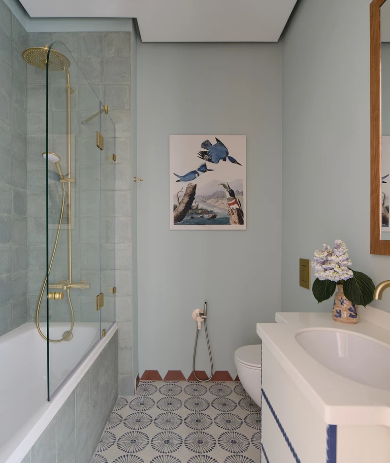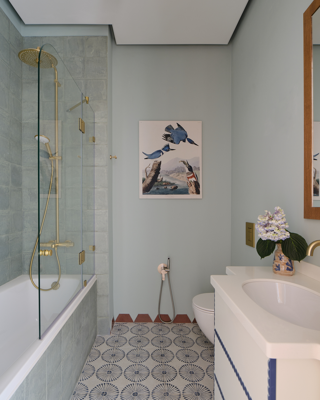 Całość uzupełniają łazienki, w których wykorzystano wzorzyste płytki podłogowe w stylu śródziemnomorskim oraz szafki ręcznie wykończone przez lokalnych rzemieślników. Jedna z nich pokryta jest teksturowanym tynkiem w kolorze brzoskwiniowym, druga ozdobiona niebieską, falistą lamówką.