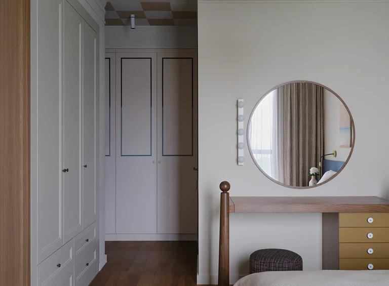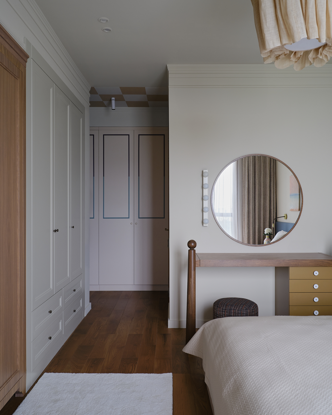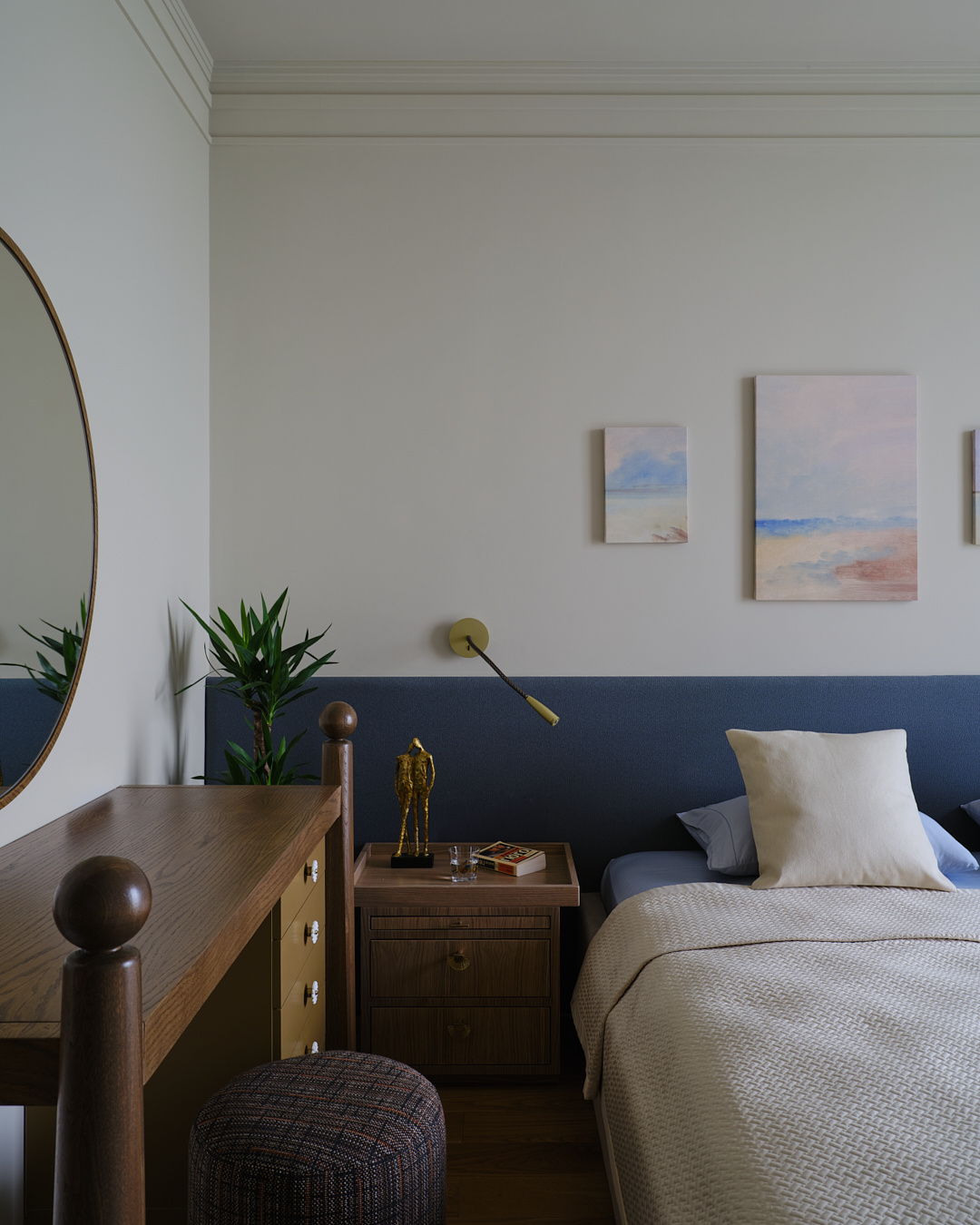 Sypialnia została w całości wypełniona meblami zaprojektowanymi na wymiar. Studio stworzyło tapicerowany zagłówek w kolorze chabrowym, szafy typu „his-and-her” oraz minimalistyczną toaletkę z toczonymi, drewnianymi nogami, której blat otwiera się jak fortepian, ukrywając wszystkie kosmetyki.