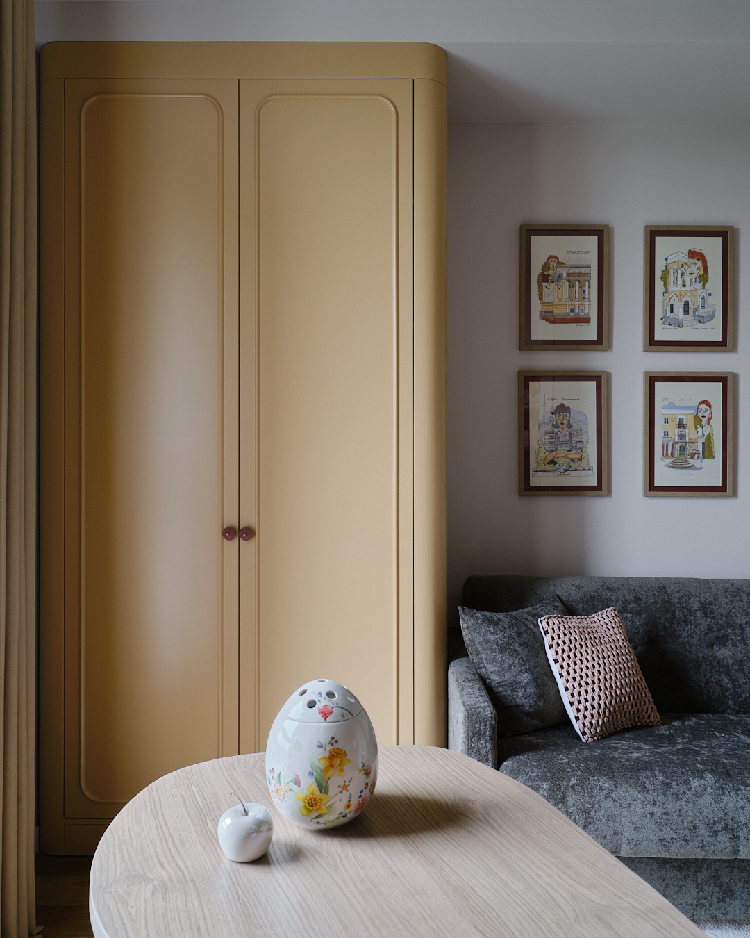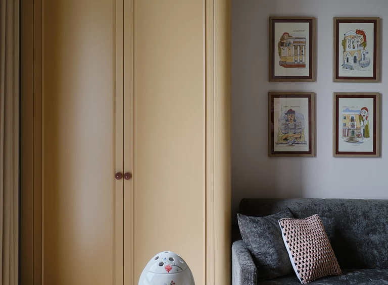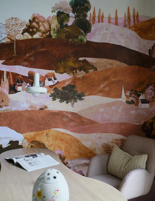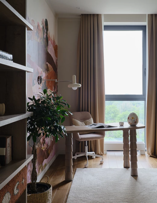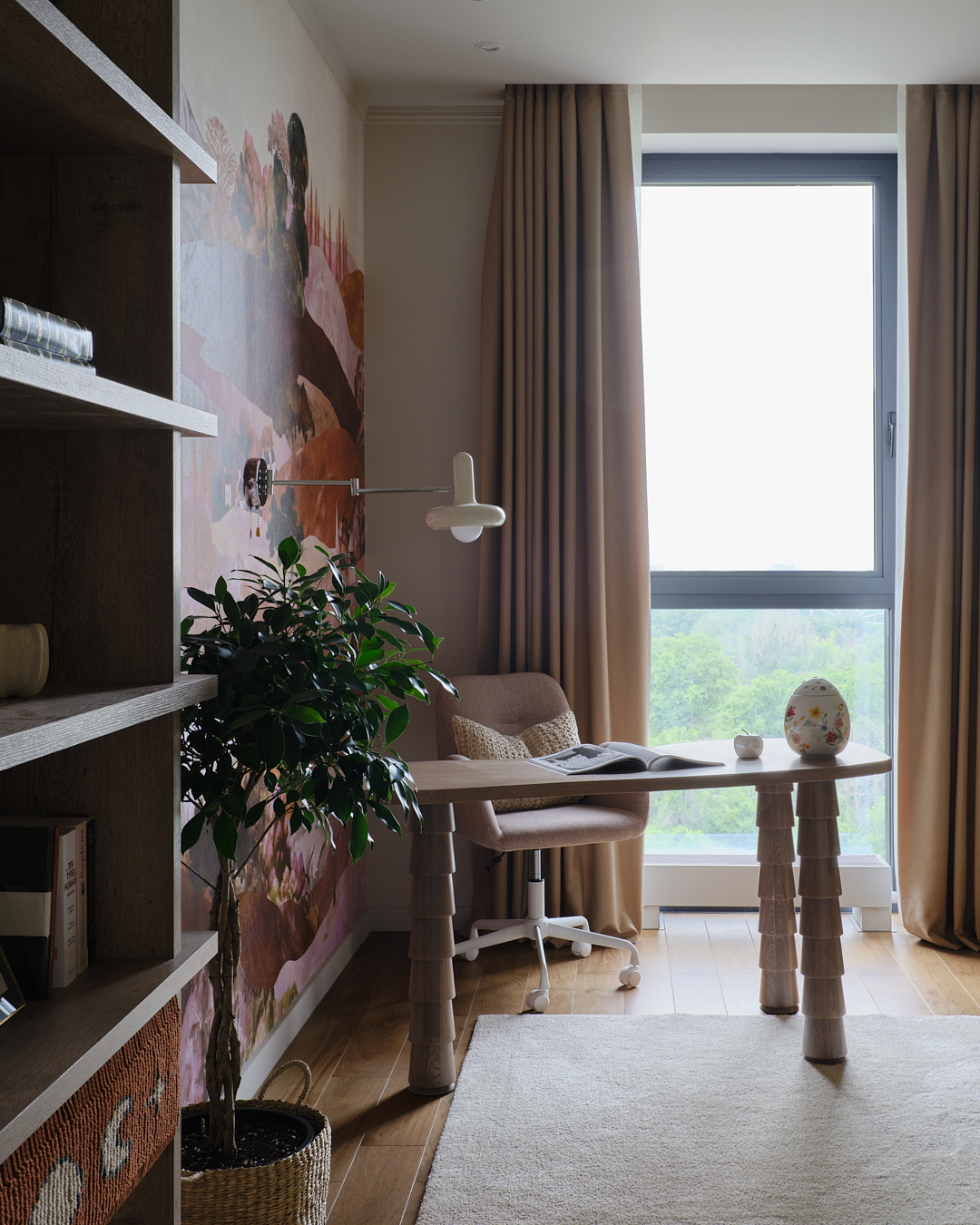 W biurze zrealizowano pomysł, który klienci zaproponowali już na pierwszym spotkaniu - tapetę z muralem przedstawiającym pagórkowaty krajobraz. Jej odcienie różu, rdzy i brązu stały się inspiracją dla palety kolorystycznej całego mieszkania. Na przeciwległej ścianie zawisły oprawione ilustracje Maiyi Kolosovej, przedstawiające punkty orientacyjne Ałmatów.