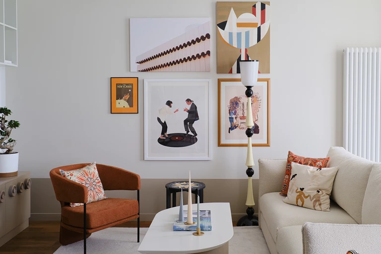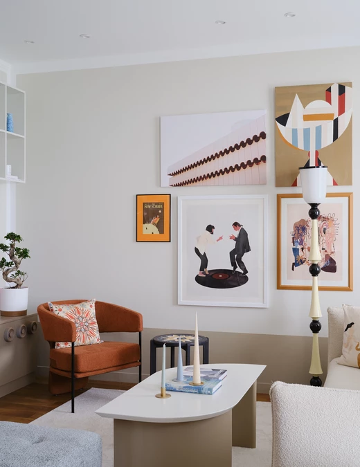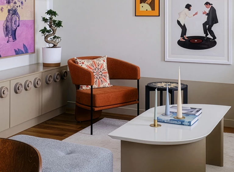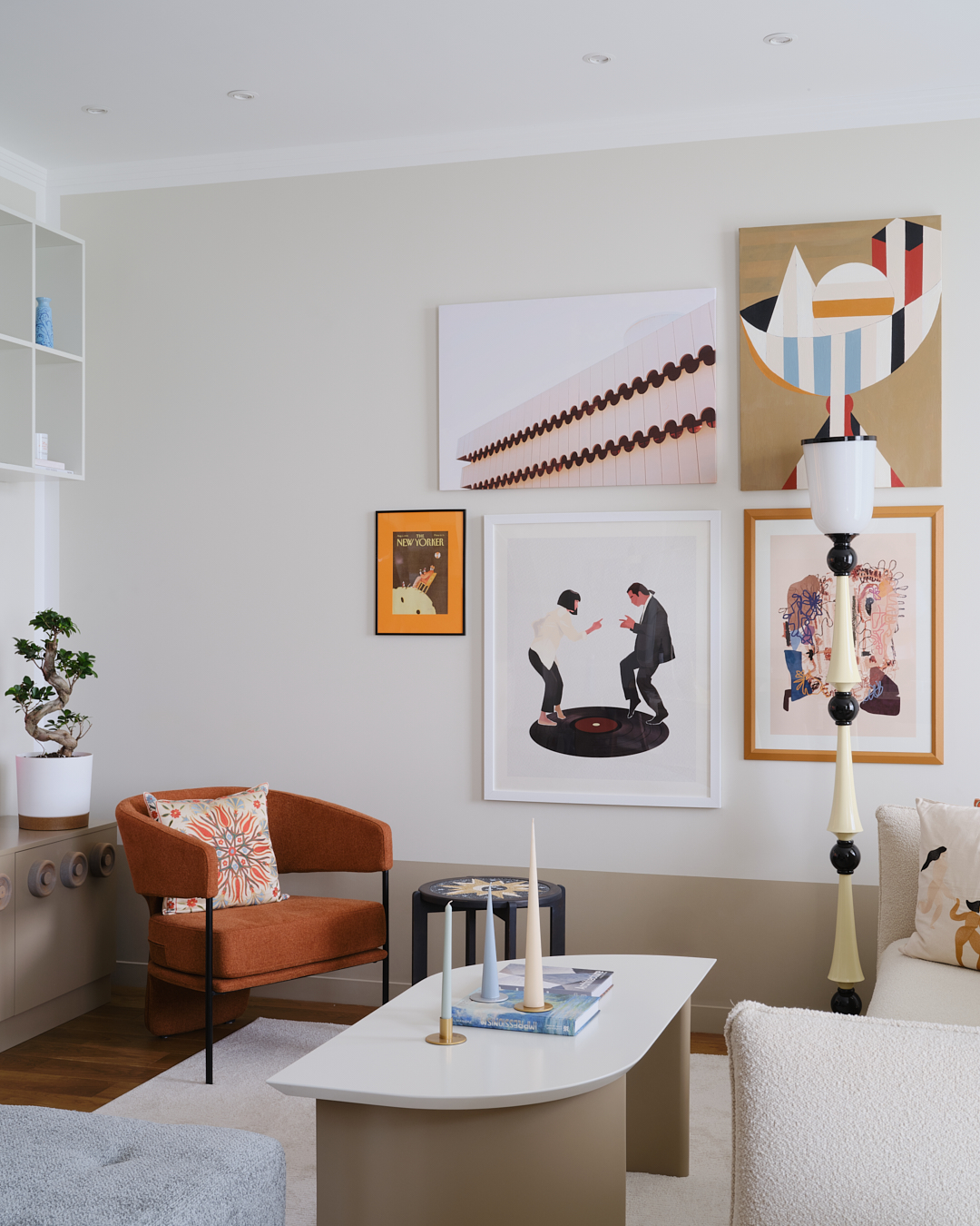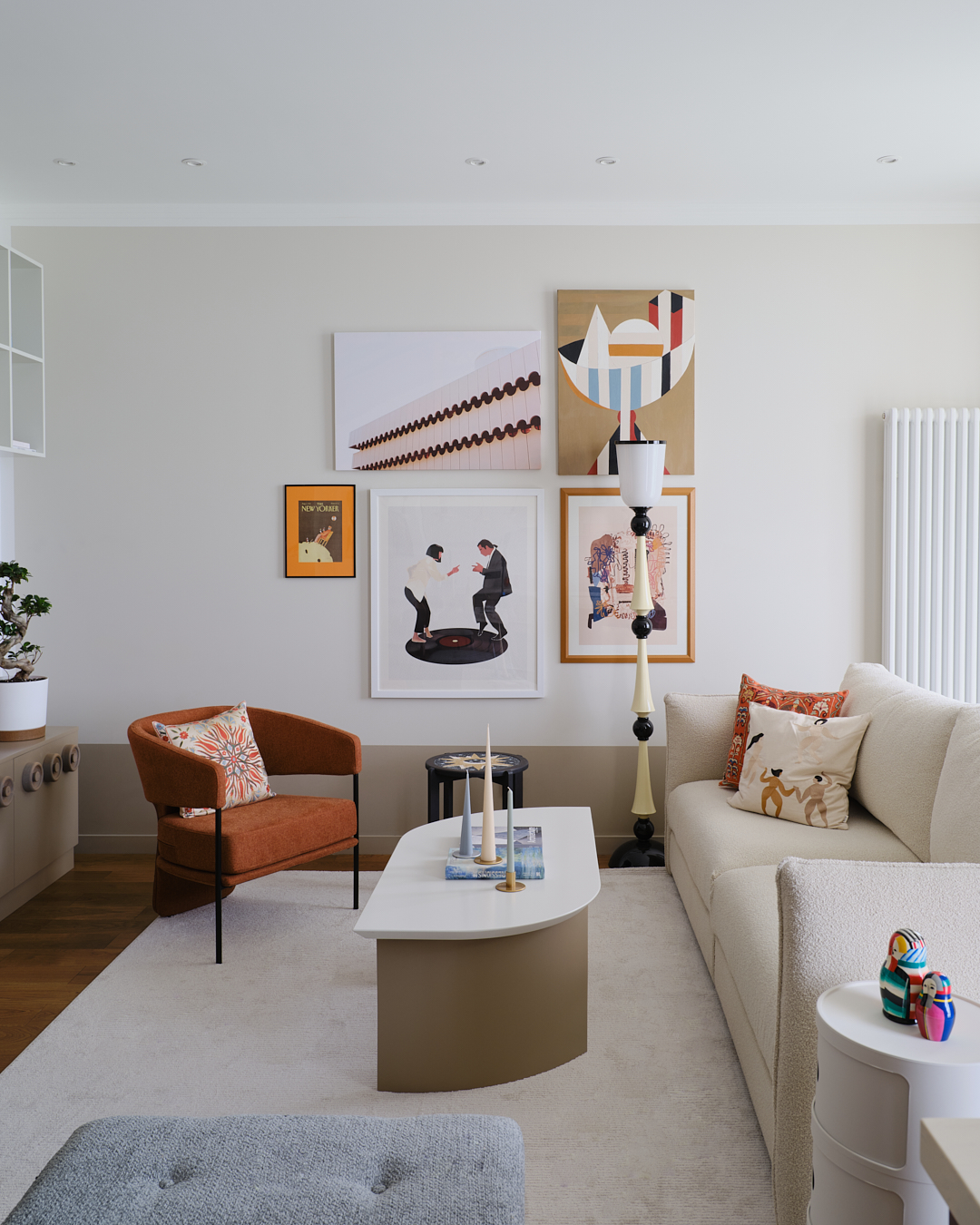 W salonie, obok sofy bouclé w odcieniu złamanej bieli i fotela w kolorze spalonej pomarańczy, znalazła się wykonana na zamówienie szafka RTV. Jej najbardziej charakterystycznym elementem są okrągłe ornamenty. „Pierwotnie były przeznaczone do szafy w przedpokoju, ale postanowiliśmy wykorzystać je przy tej szafce,” wspomina Aisha. „Stała się ona centralnym punktem salonu”.