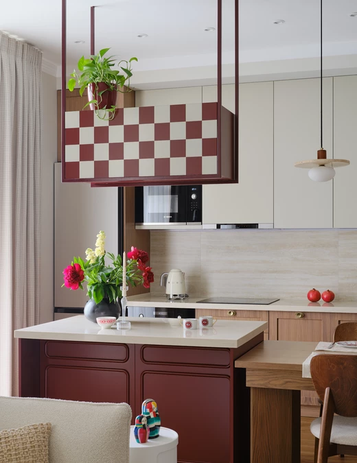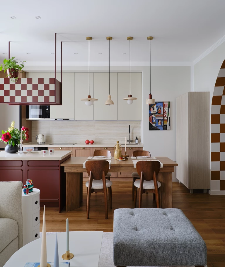 W otwartej kuchni górne szafki w kolorze kości słoniowej kontrastują z dolnymi z jasnego drewna oraz wyspą w kolorze wina. Wyspa płynnie przechodzi w długi stół jadalniany o rzeźbiarskiej podstawie, widoczny tuż przy wejściu.