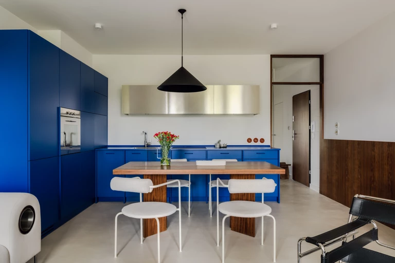 W salonie z aneksem kuchennym znalazły się proste, nakładające się na siebie bryły. Koła, kwadraty, półokręgi, trójkąty układają się w jasną kompozycję wypełnioną mocnym odcieniem ultramaryny, którą pokryta została zabudowa kuchenna, tworząc monolityczną układankę. Każdy mebel w tej przestrzeni kryje drobne detale, zaprojektowane przez architektów. Metalowe szafki, komoda czy stół z kamiennymi podporami i butelkowym blatem – to kompozycja nie tylko użytkowa, ale także estetyczna. Uzupełniają ją ikony współczesnego polskiego dizajnu, takie jak krzesła The Good Living czy sofa marki Comforty, ale także klasyki z korzeniami wprost ze szkoły w Dessau. Ściany oprószone bielą i klasyczne rolety nadają przestrzeni purystycznej nuty, a wszystko przełamane zostało soczystym, przyciemnionym orzechem, wchodzącym na ściany i meble.