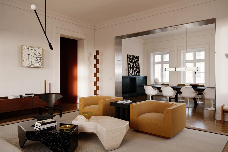 W salonie (oprócz wspomnianych wyżej foteli) uwagę skupia klasyk dizajnu – organiczna sofa „Soriana” zaprojektowana przez Afrę i Tobię Scarpa dla marki Cassina. W centrum pomieszczenia stanęły kamienne stoliki kawowe „JAZ” Christopera Delcourta, które budzą skojarzenie z biżuterią. Tło dla elementów tworzą drewniany fotel „PK0 ATM” projektu Poula Kjærholma, marki Fritz Hansen, oraz długa komoda z ciemnego drewna, autorskiego projektu. Nad całością góruje minimalistyczna lampa sufitowa „Voyager Orb” Allied Maker.