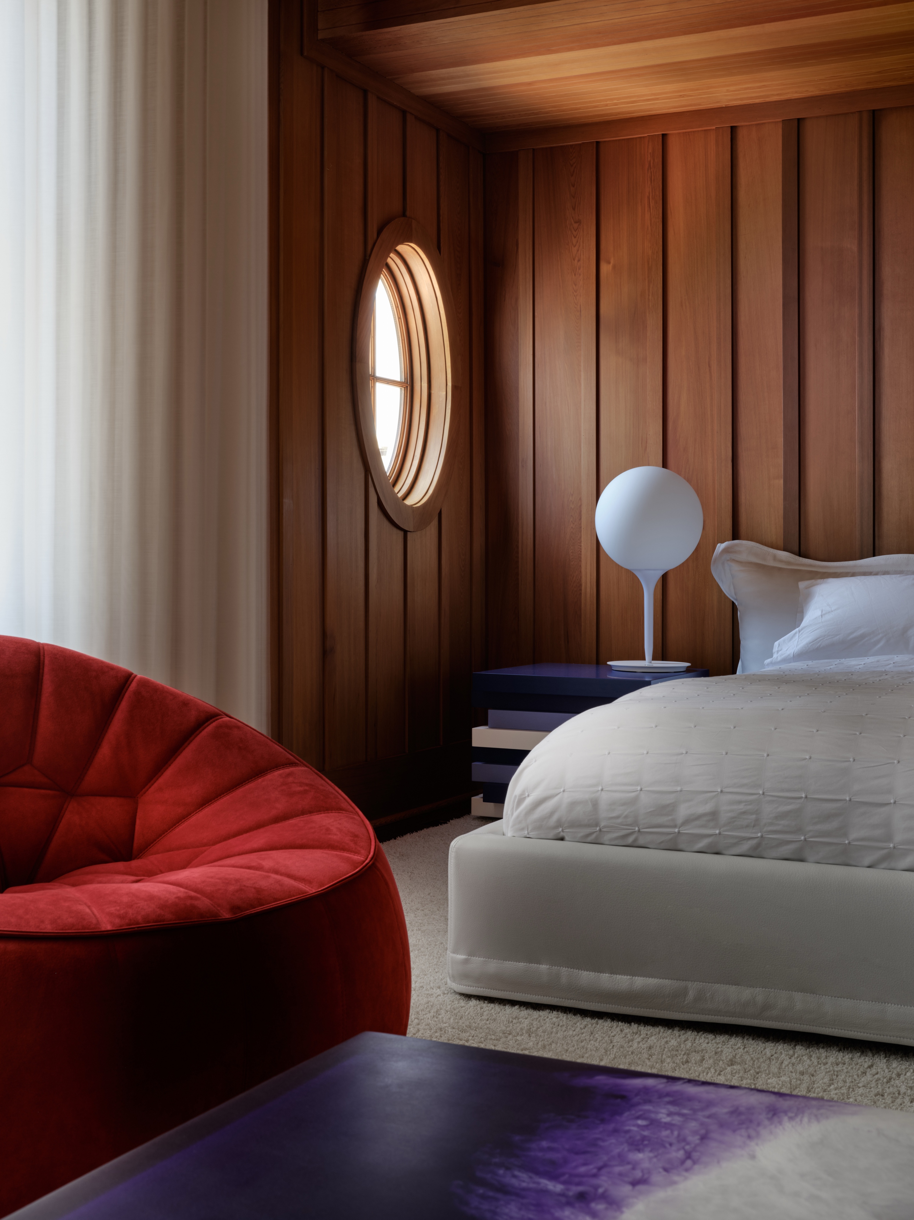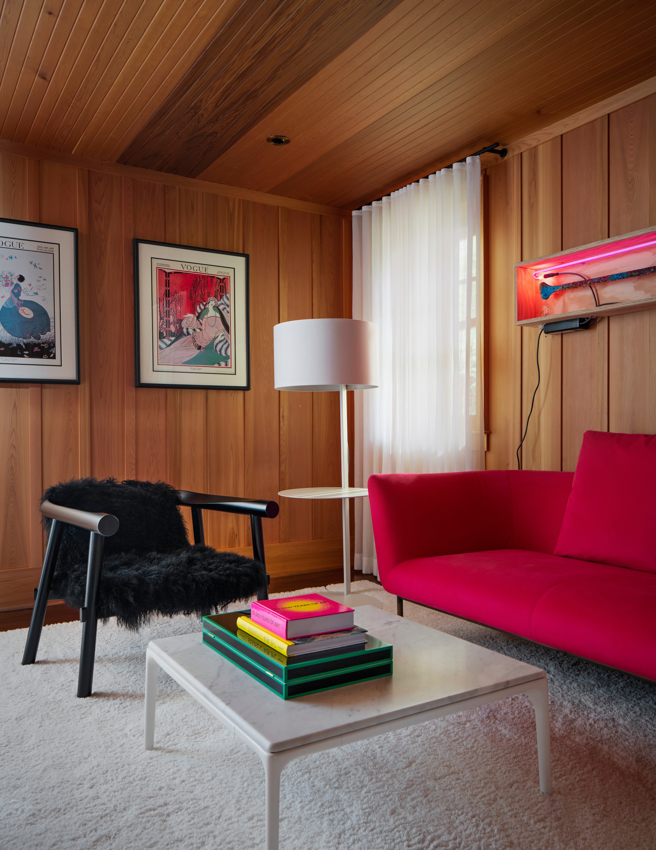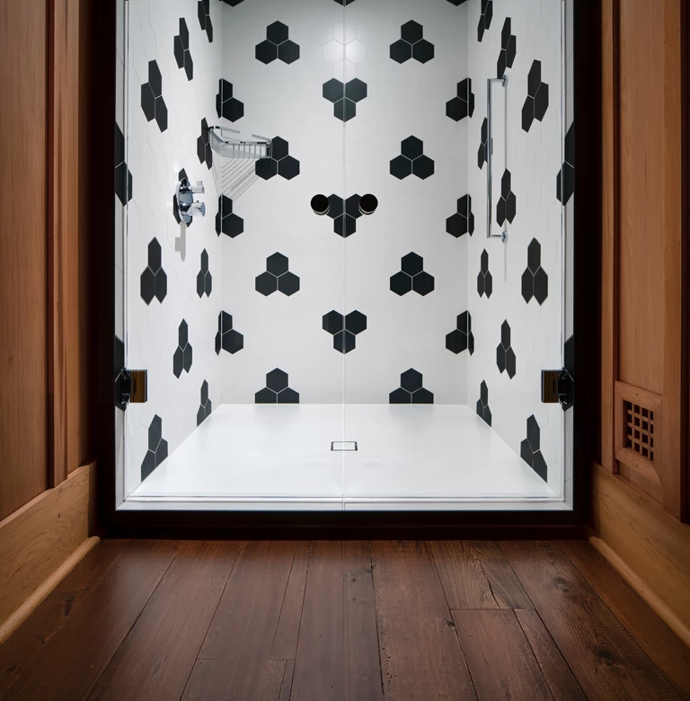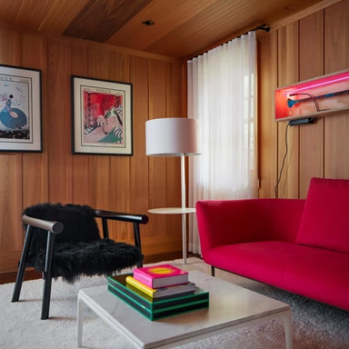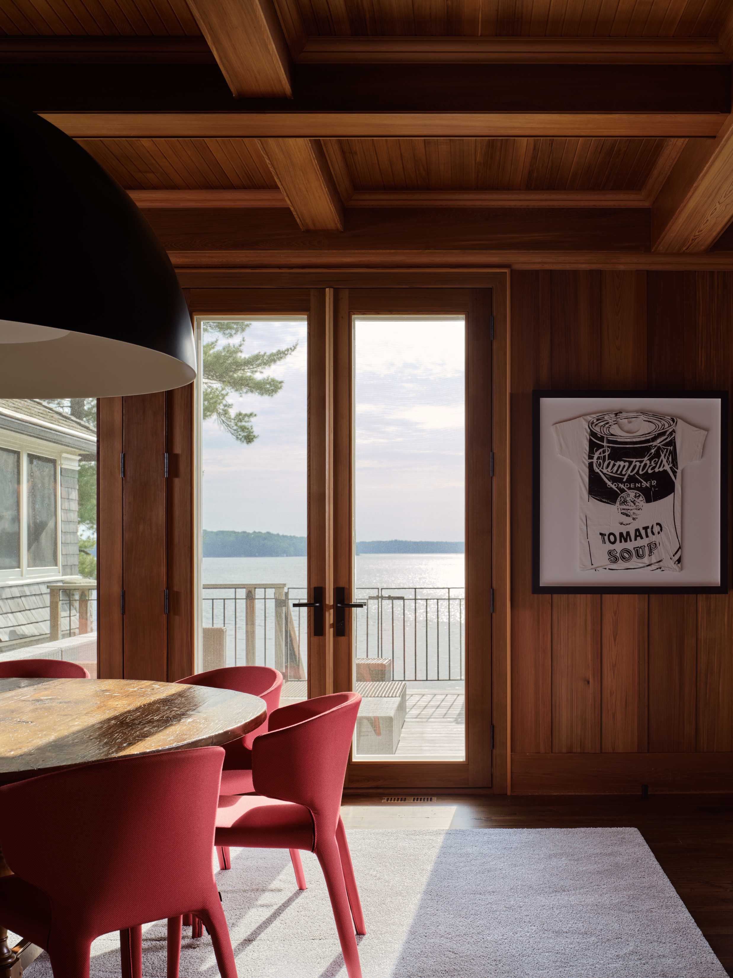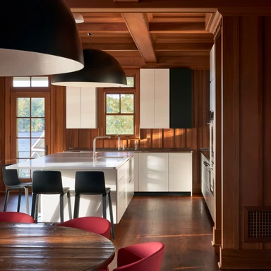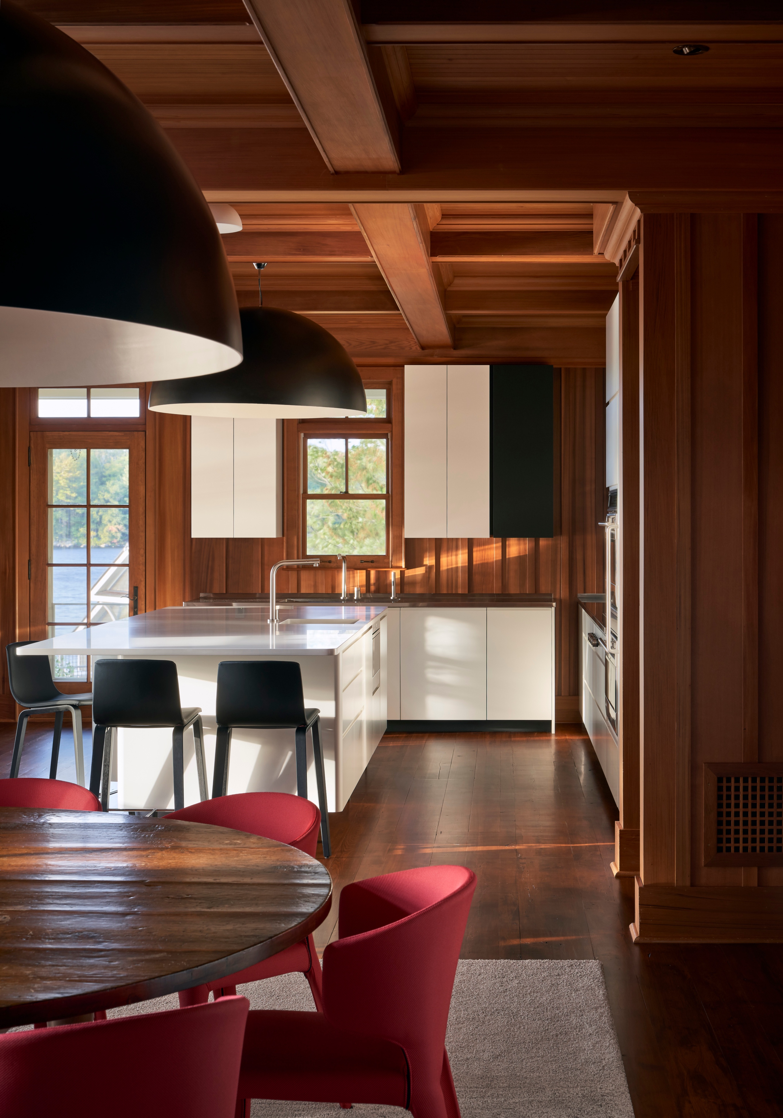 Wnętrza są zdominowane przez panele z czerwonego cedru, które pokrywają ściany i sufity, tworząc ciepłą, tradycyjną bazę. Architekci nałożyli na nią warstwę nowoczesnego minimalizmu, ograniczając nowe interwencje architektoniczne do czarno-białej palety barw.
