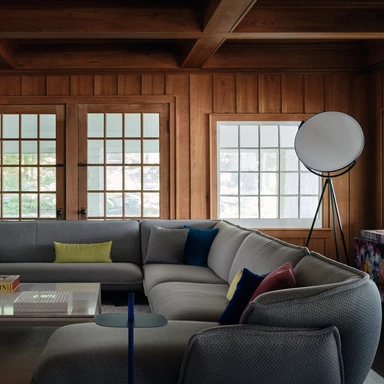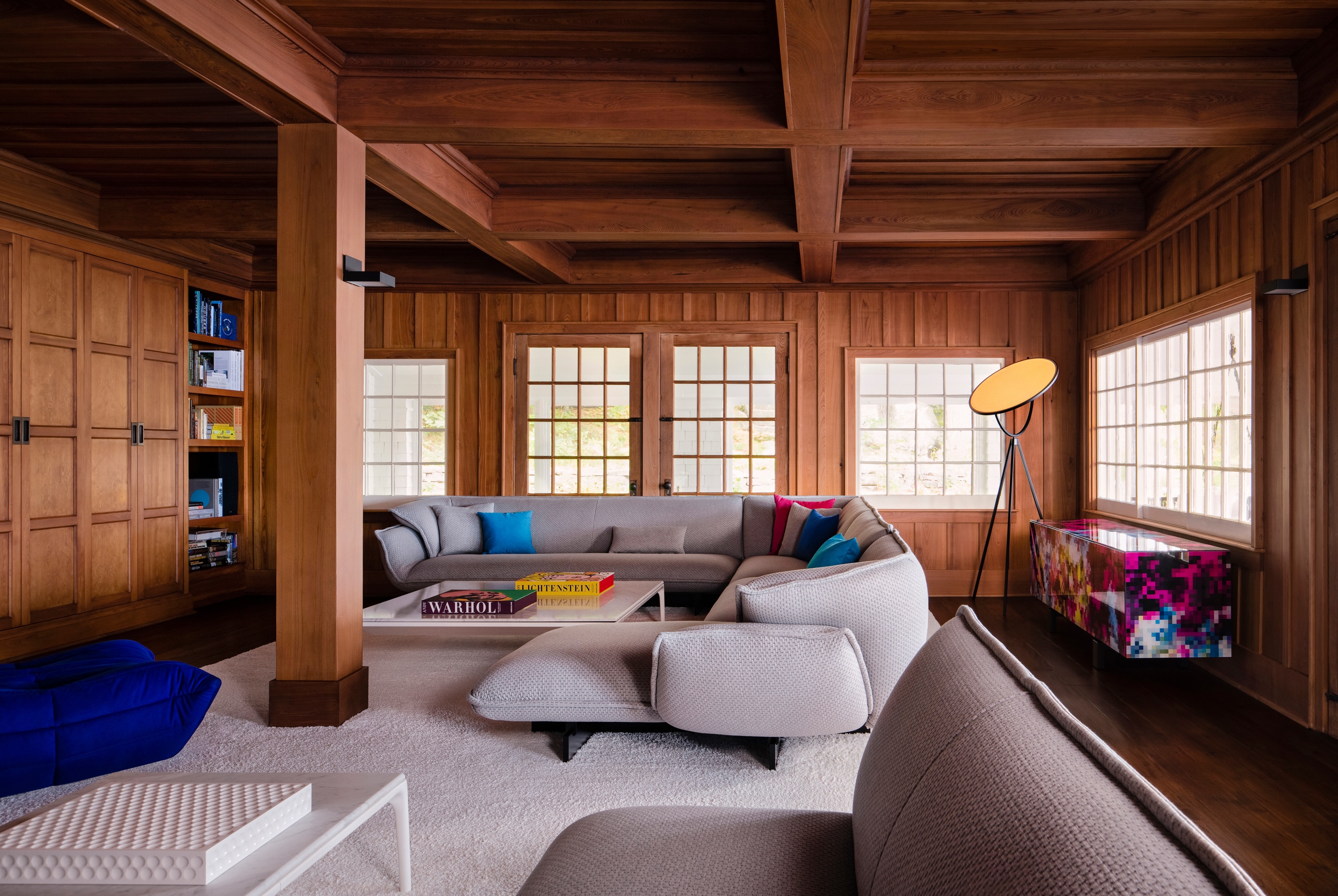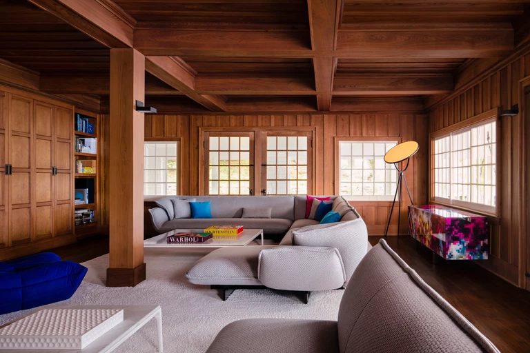 Przestrzeń wypoczynkową powiększono o werandę, którą pomalowano na biało, by maksymalnie wykorzystać naturalne światło i widok na wodę. Miejsce to podzielono na strefy dla dorosłych i dzieci za pomocą niebieskich dywanów Paola Lenti.