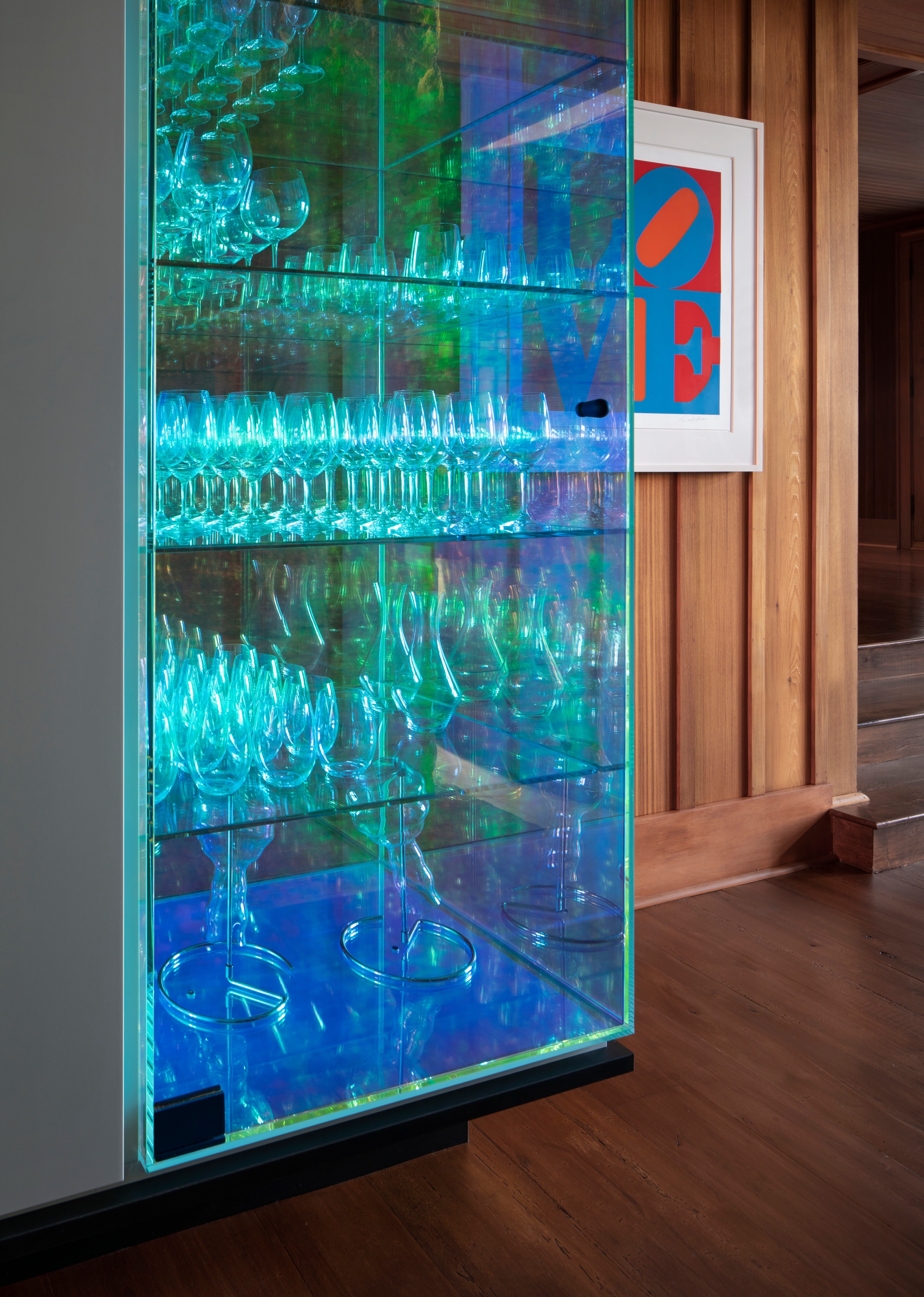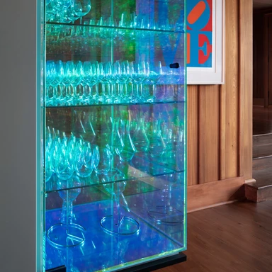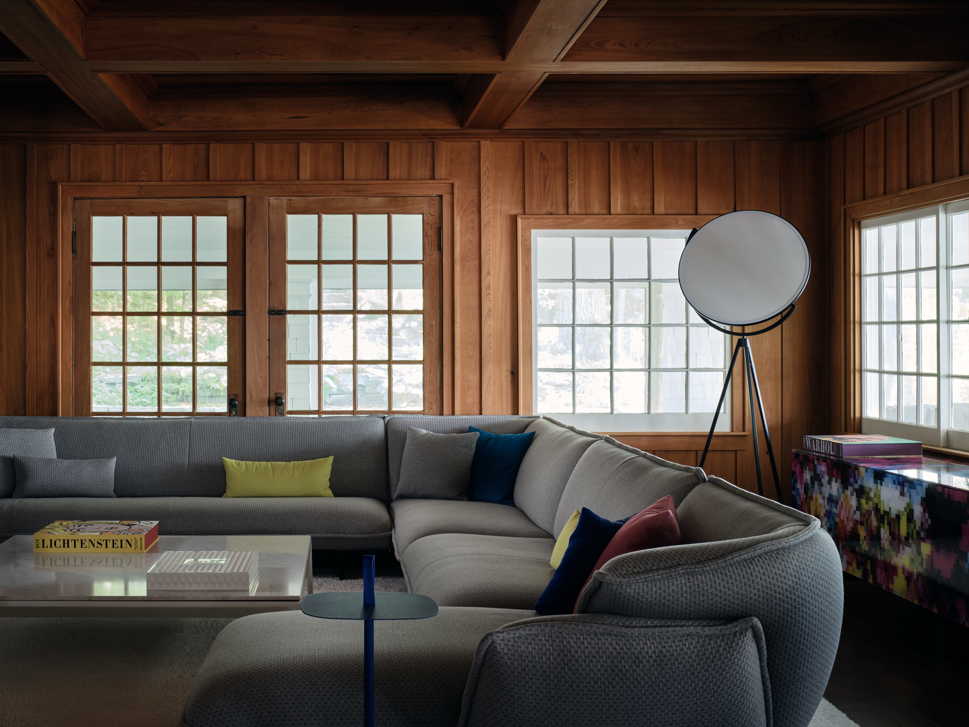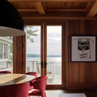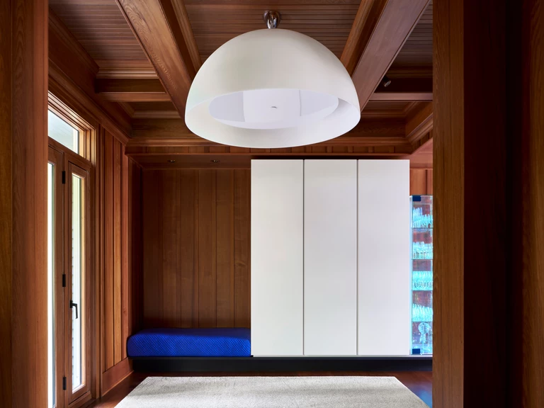 Dodatkowe udogodnienia znajdują się bezpośrednio przy jeziorze, gdzie na pomoście zamontowano aluminiowe szafki mieszczące sprzęt do gotowania i telewizor. Zostały one zaprojektowane tak, by wytrzymać ewentualne wiosenne podtopienia, a dzięki specjalnym uchwytom można je szybko osłonić przed niepogodą. Delikatność, z jaką architekci wprowadzili nowoczesne elementy do historycznej tkanki, pozwoliła na stworzenie wnętrza, które celebruje przeszłość, jednocześnie w pełni odpowiadając na potrzeby współczesności.